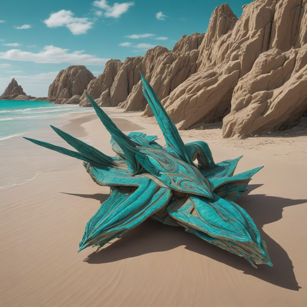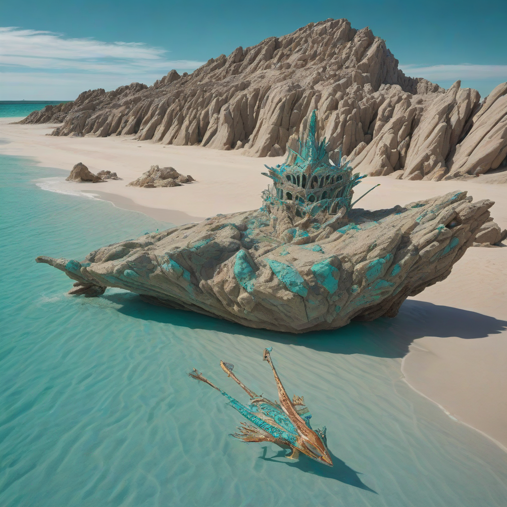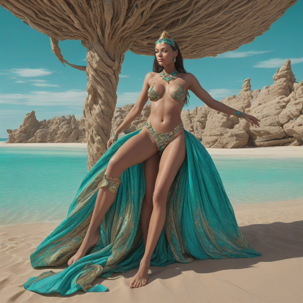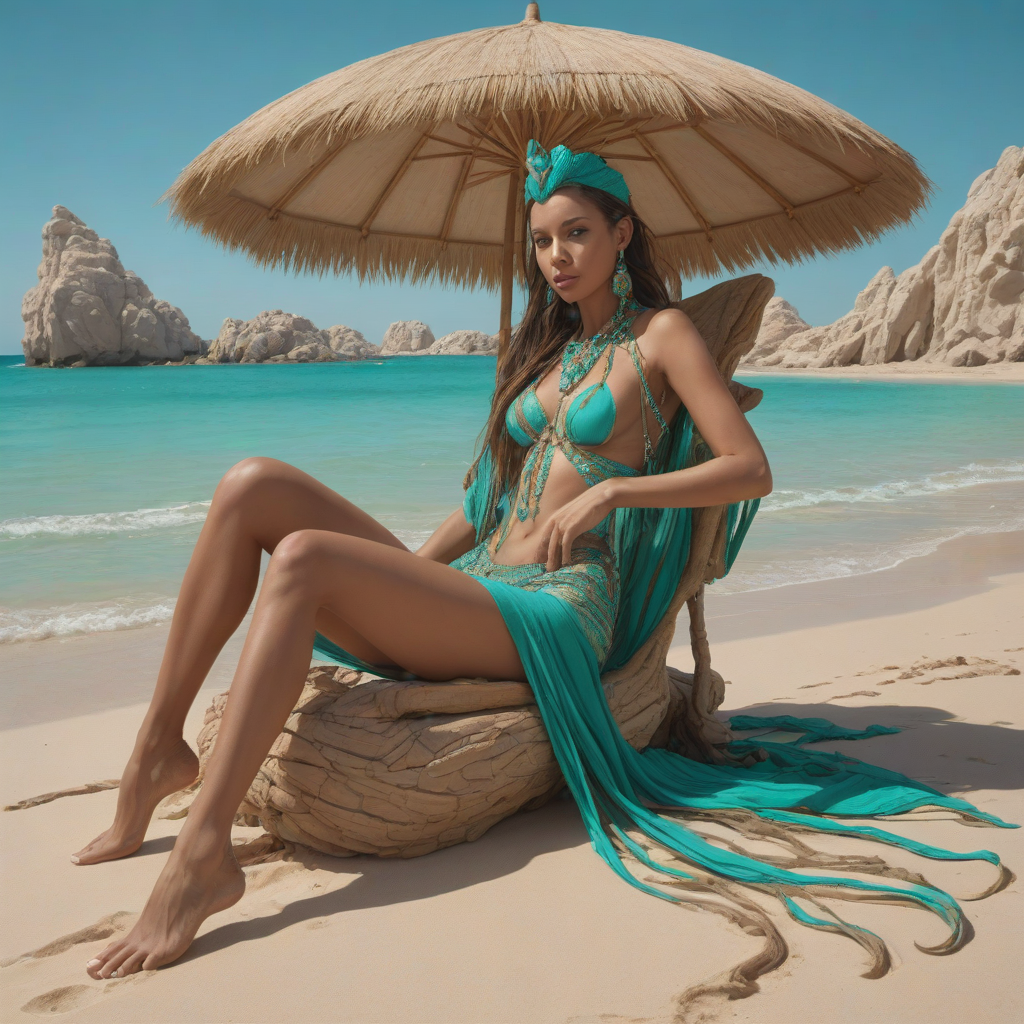 stranded in the heart of a deserted island, the Mirage Queen lounges in a sea of tan sands, her turquoise tail flickering in intricate patterns, captivating even the rocky outcrop as it melts into the horizon