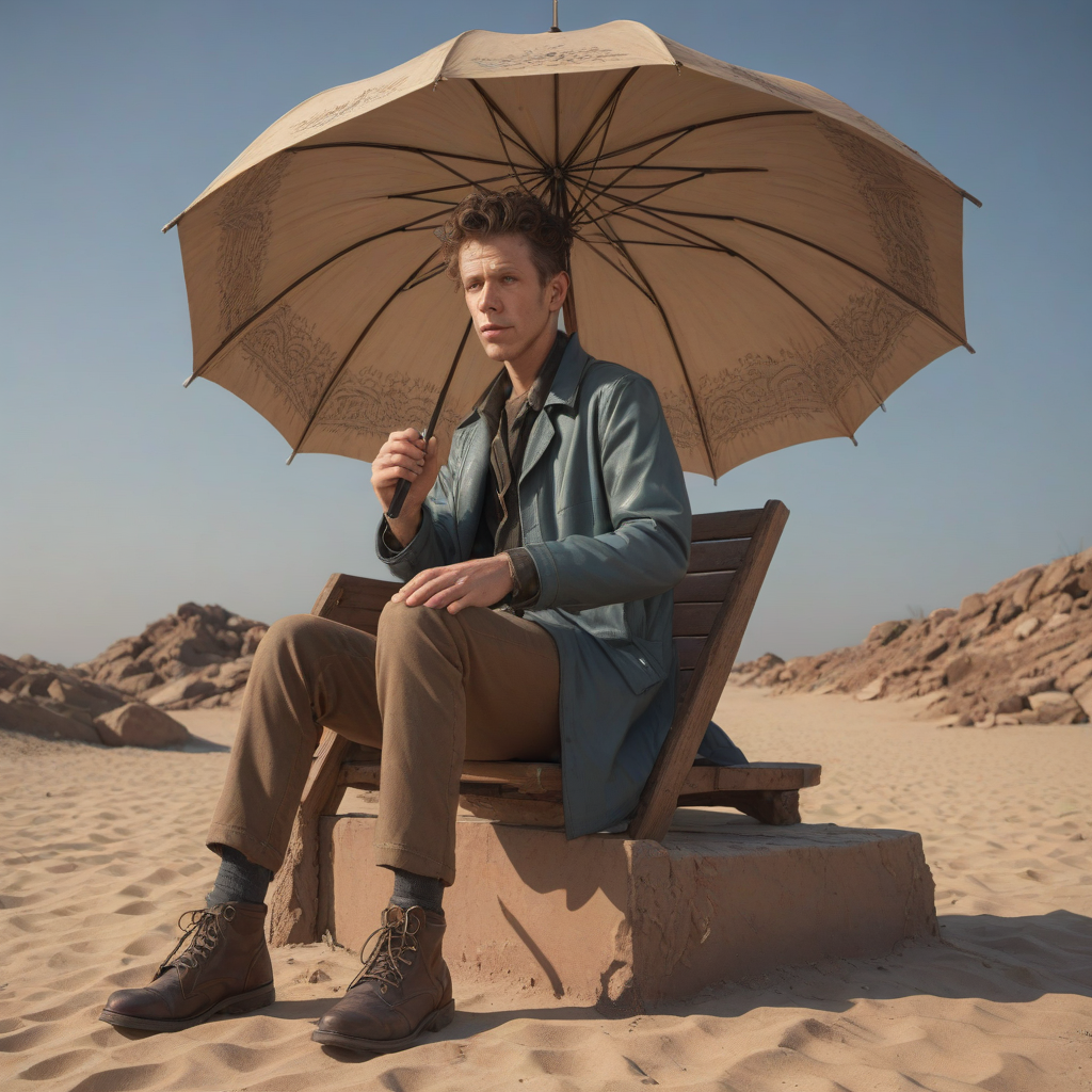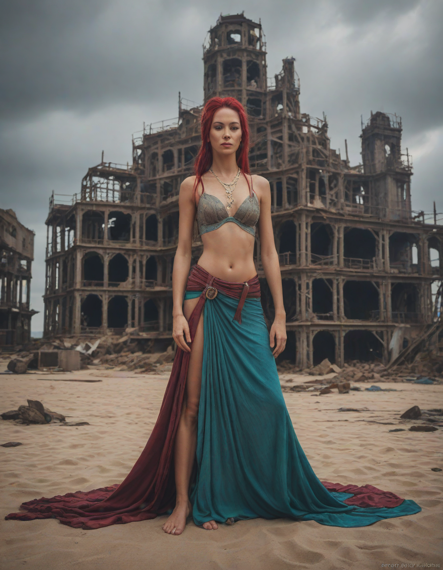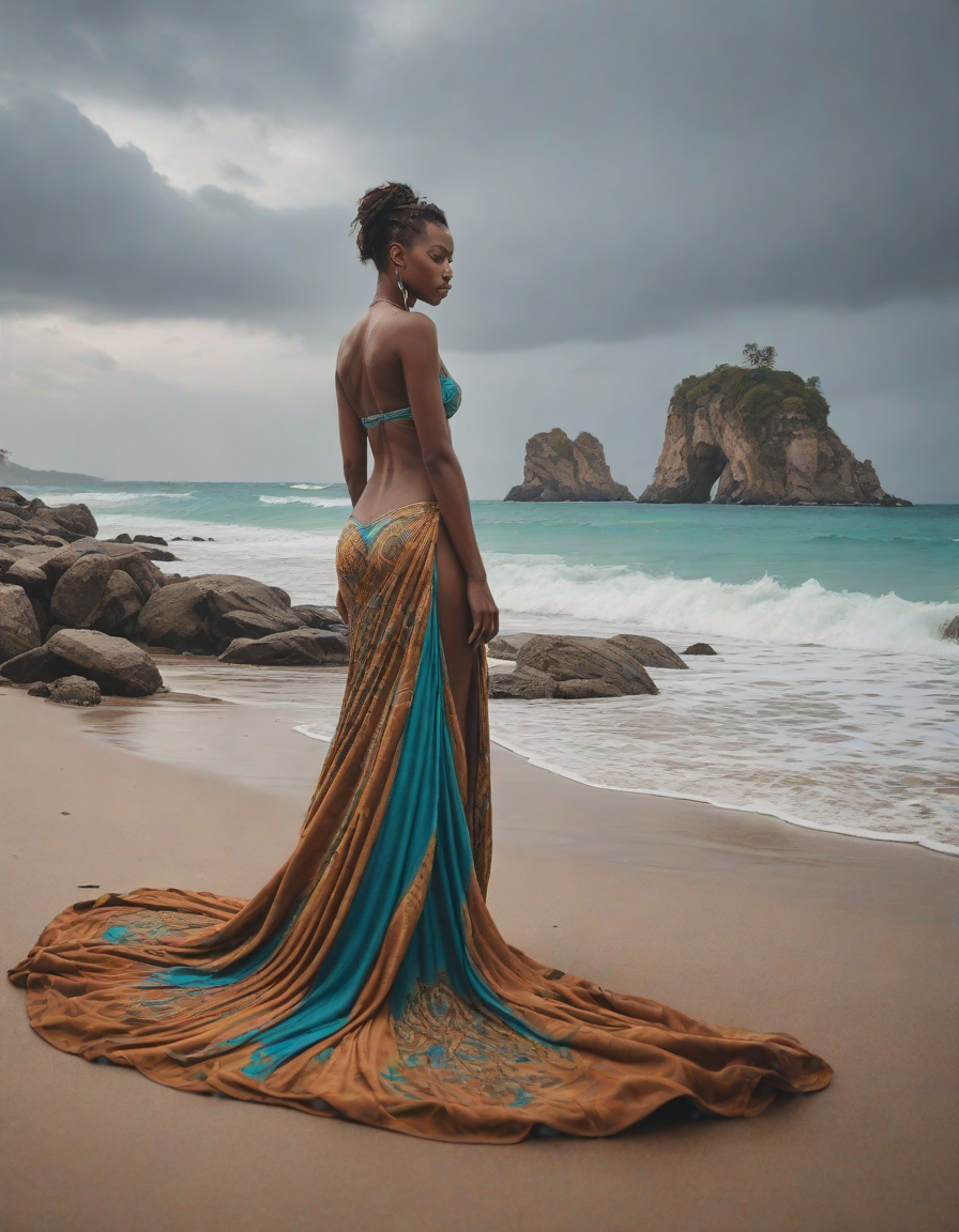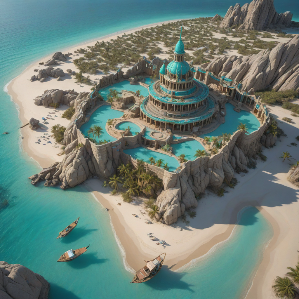 stranded in the heart of a deserted island, the Mirage Queen lounges in a sea of tan sands, her turquoise tail flickering in intricate patterns, captivating even the rocky outcrop as it melts into the horizon