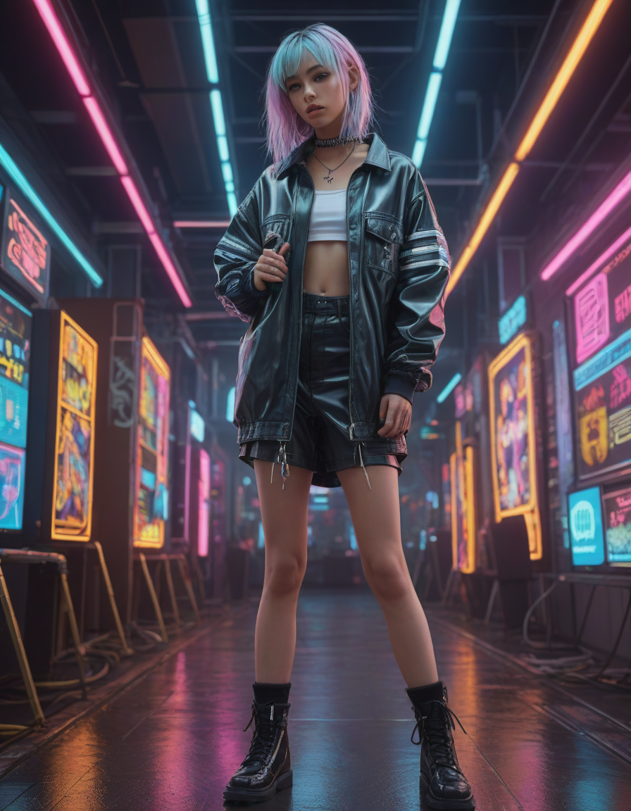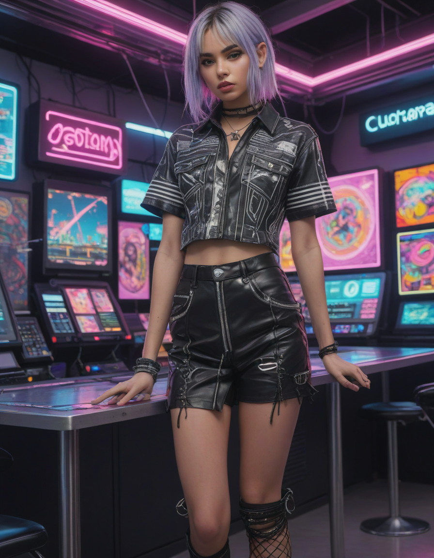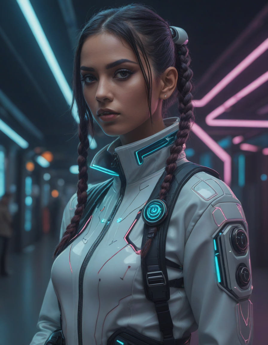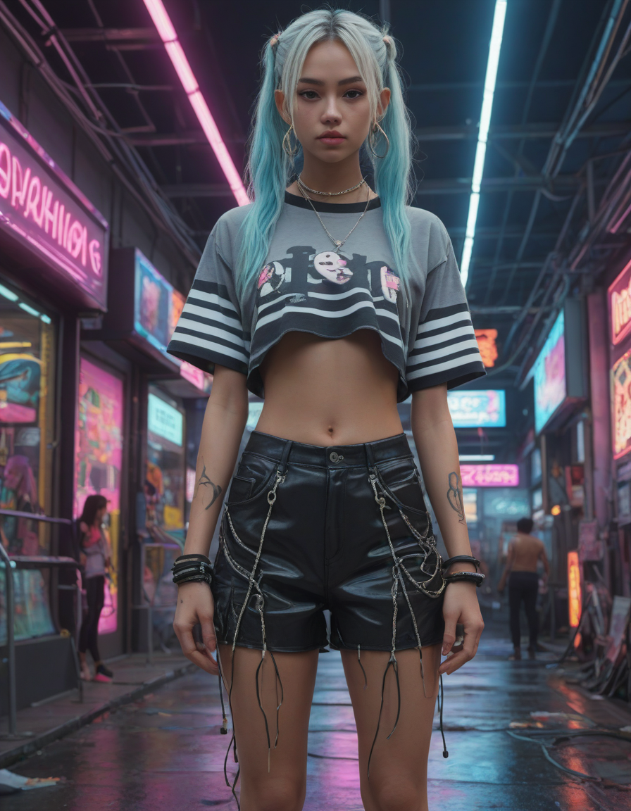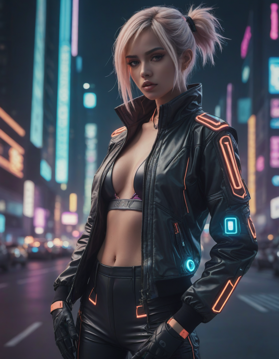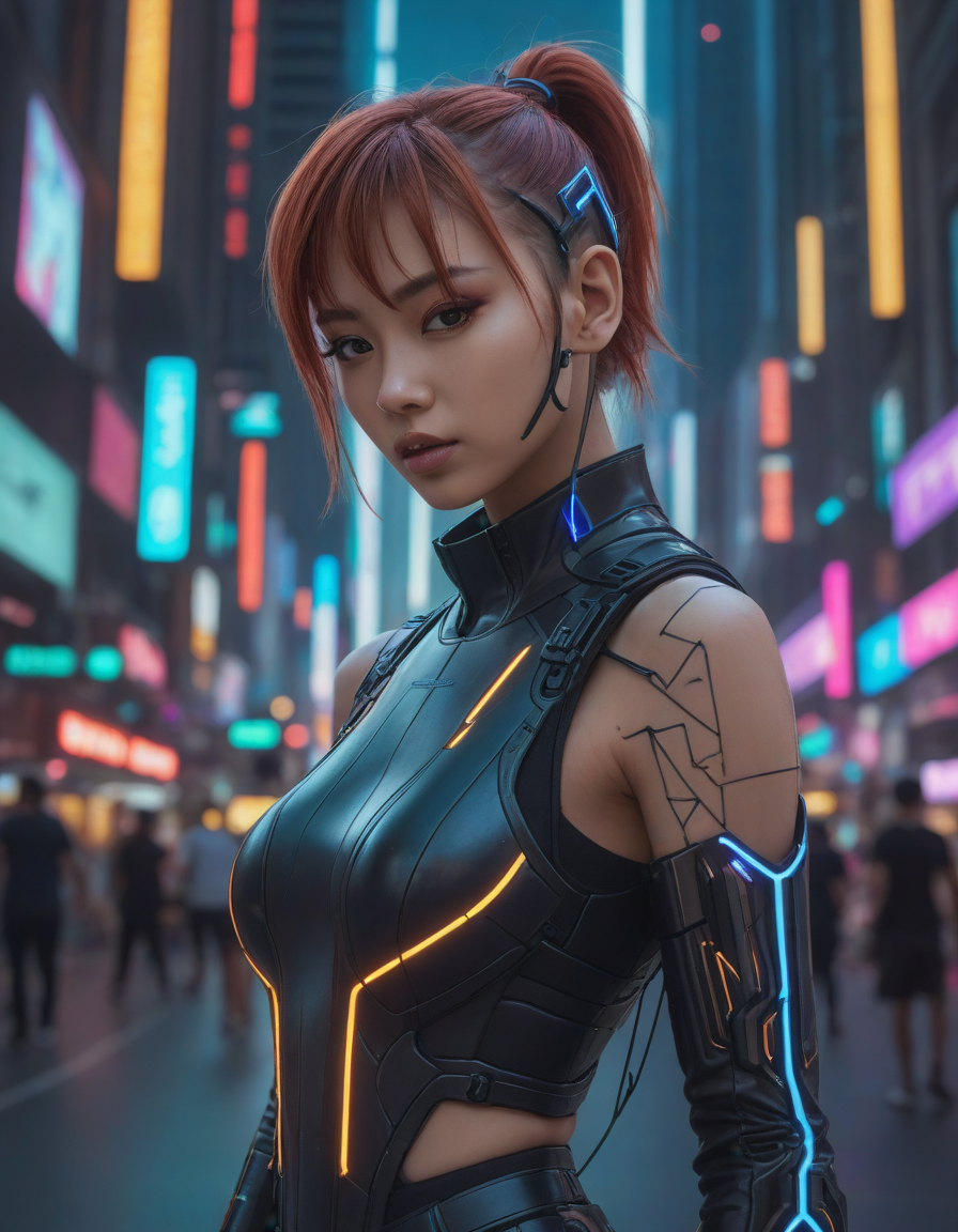 drab old-fashioned clothing, outdated style→futuristic cyberpunk outfit with glowing accents
