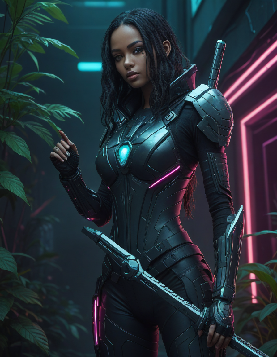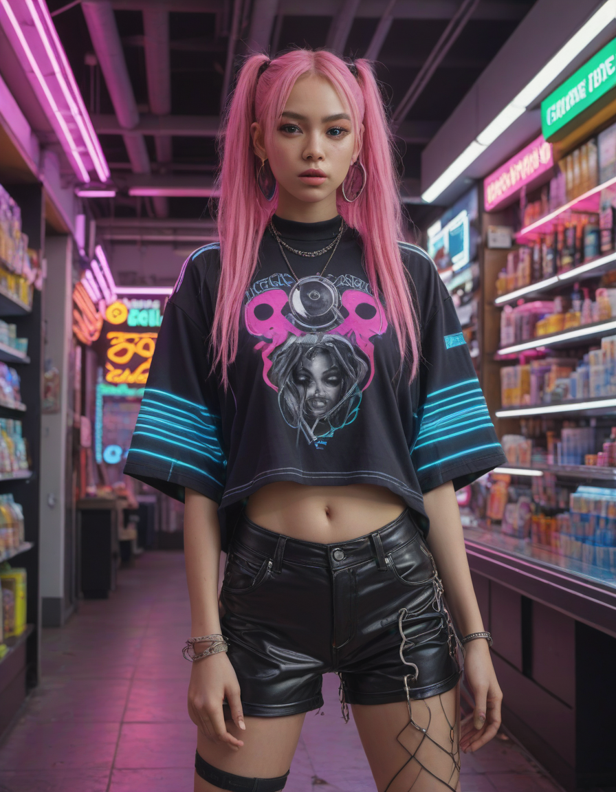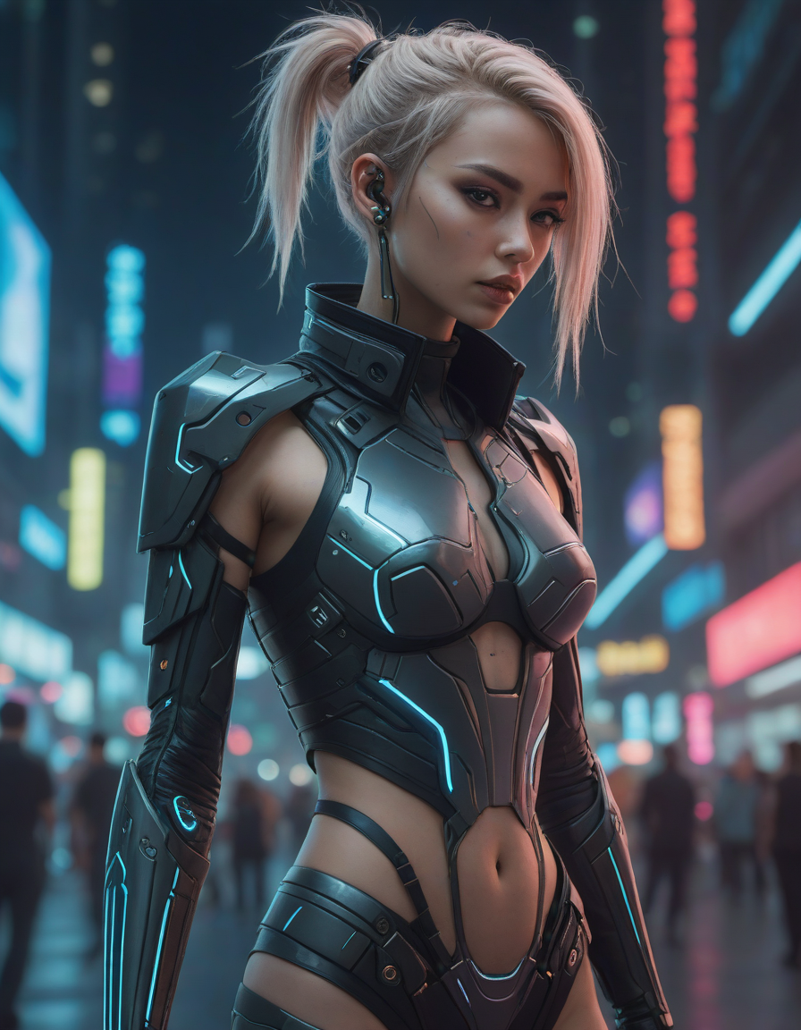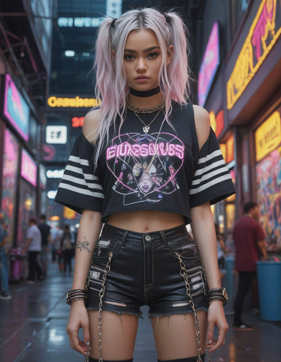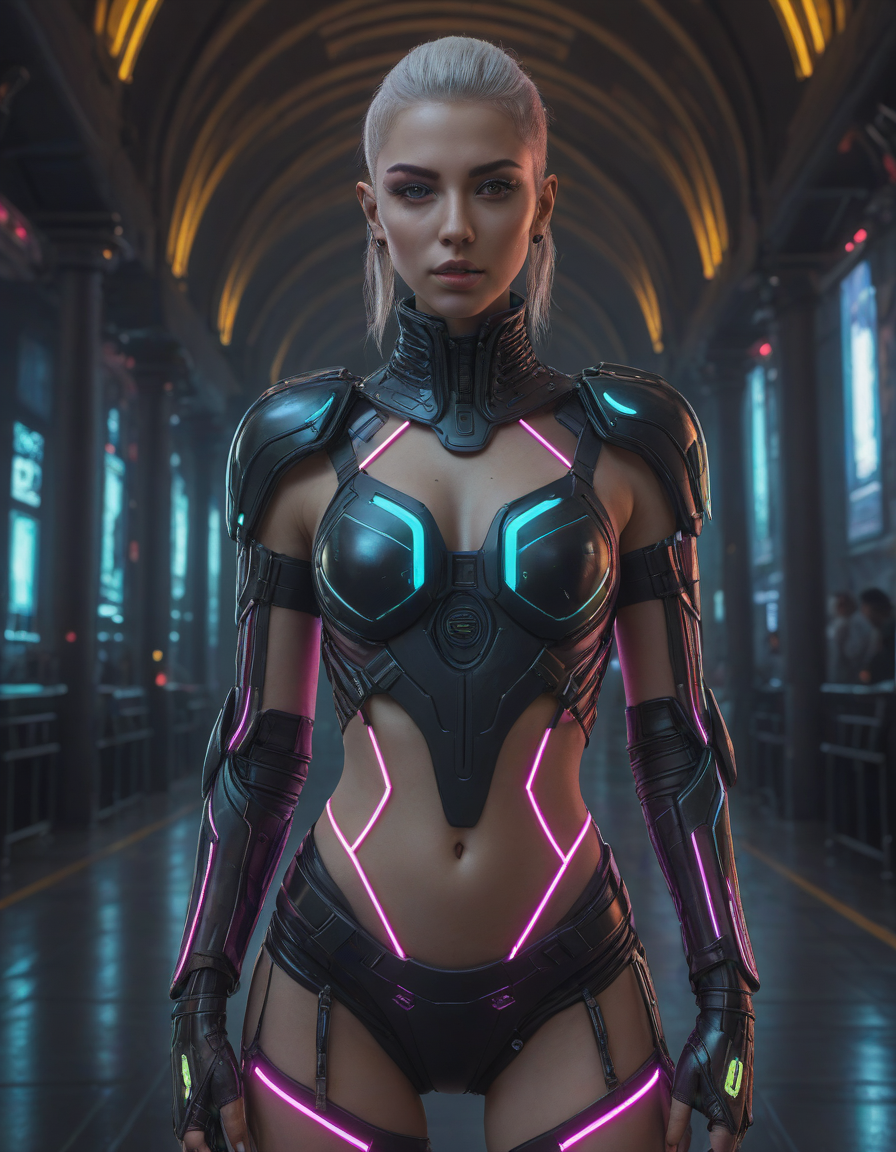 drab old-fashioned clothing, outdated style→futuristic cyberpunk outfit with glowing accents