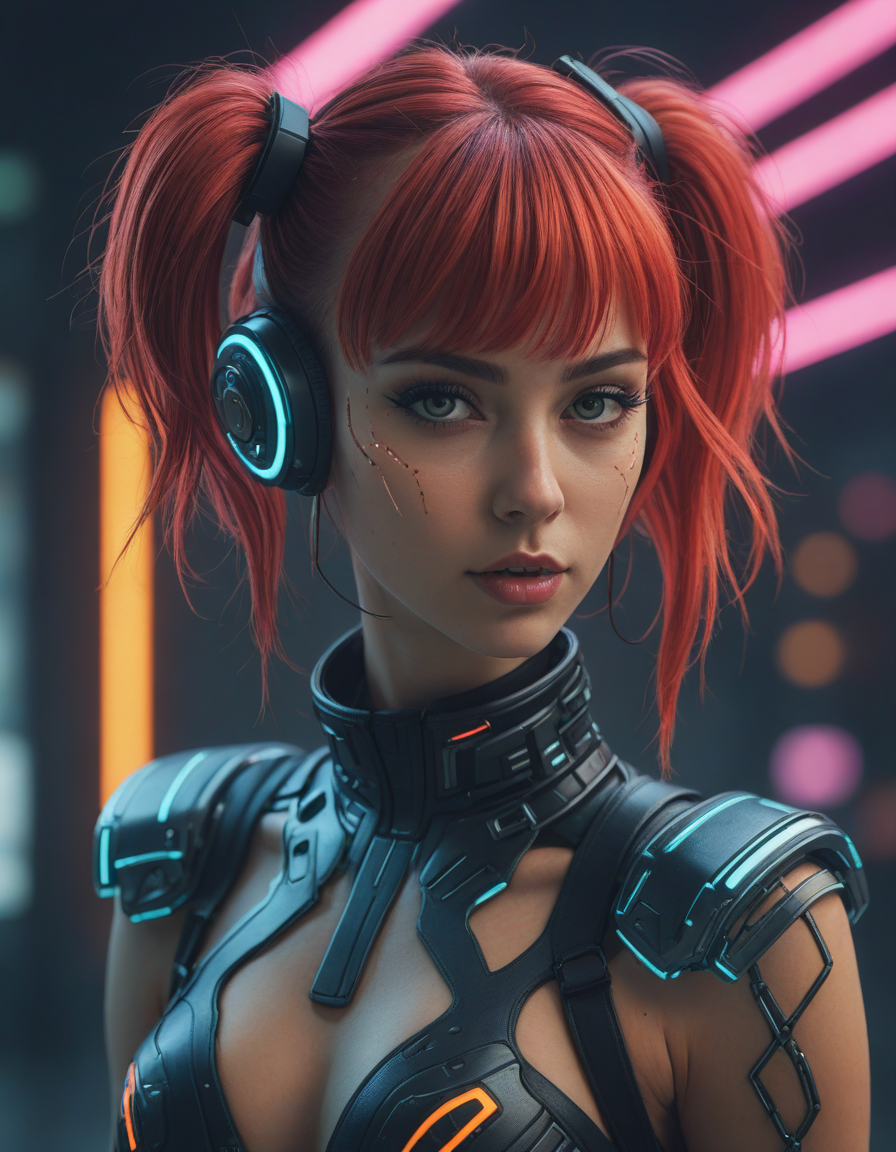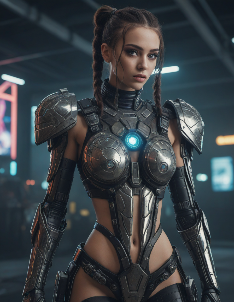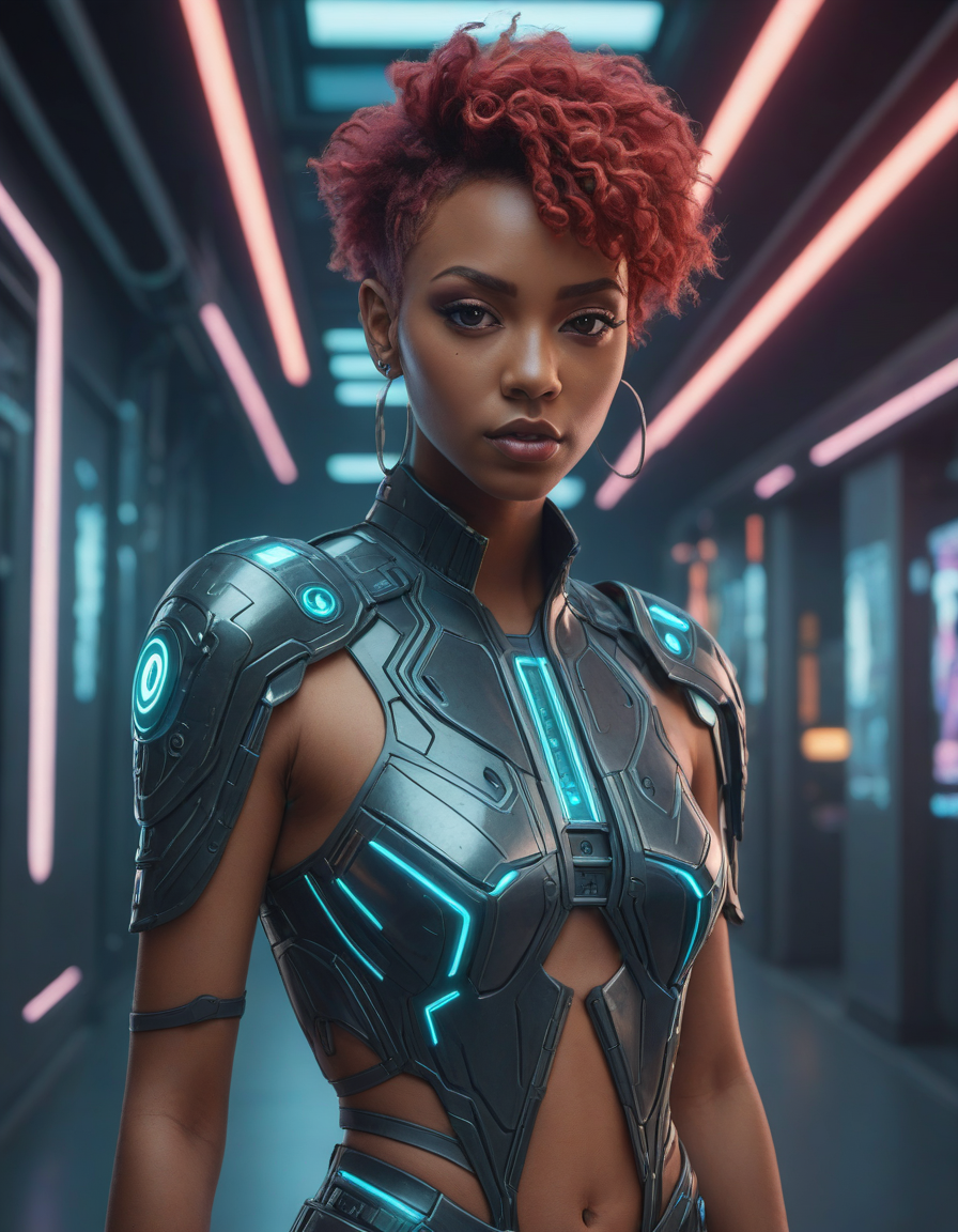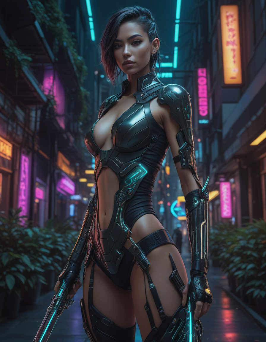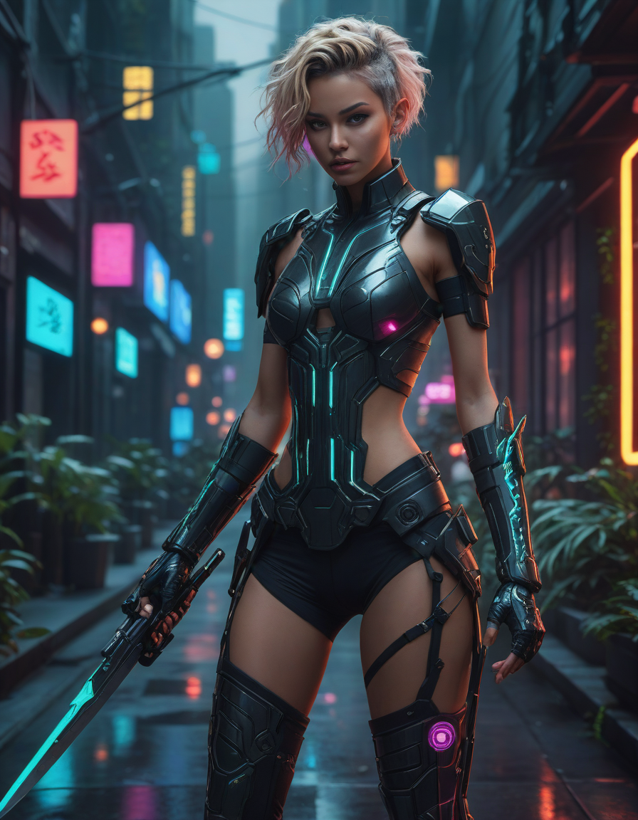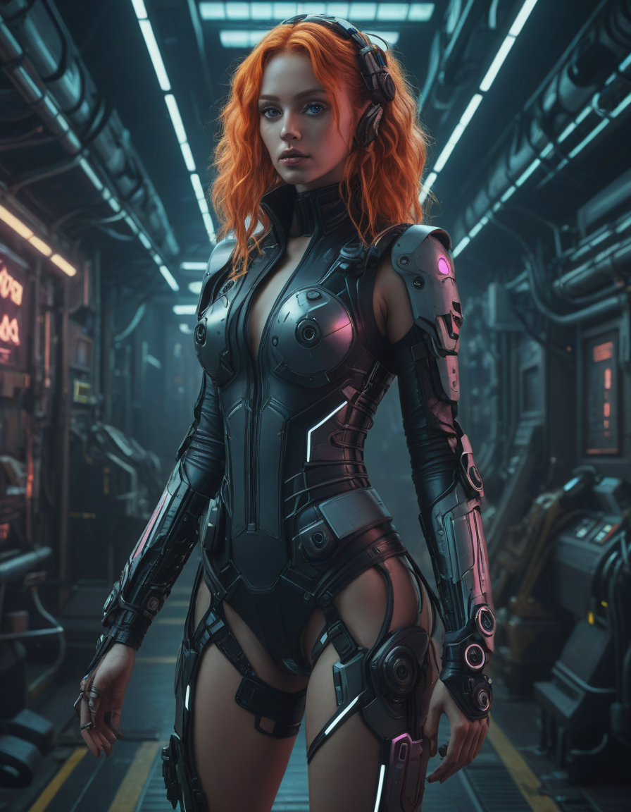 drab old-fashioned clothing, outdated style→futuristic cyberpunk outfit with glowing accents