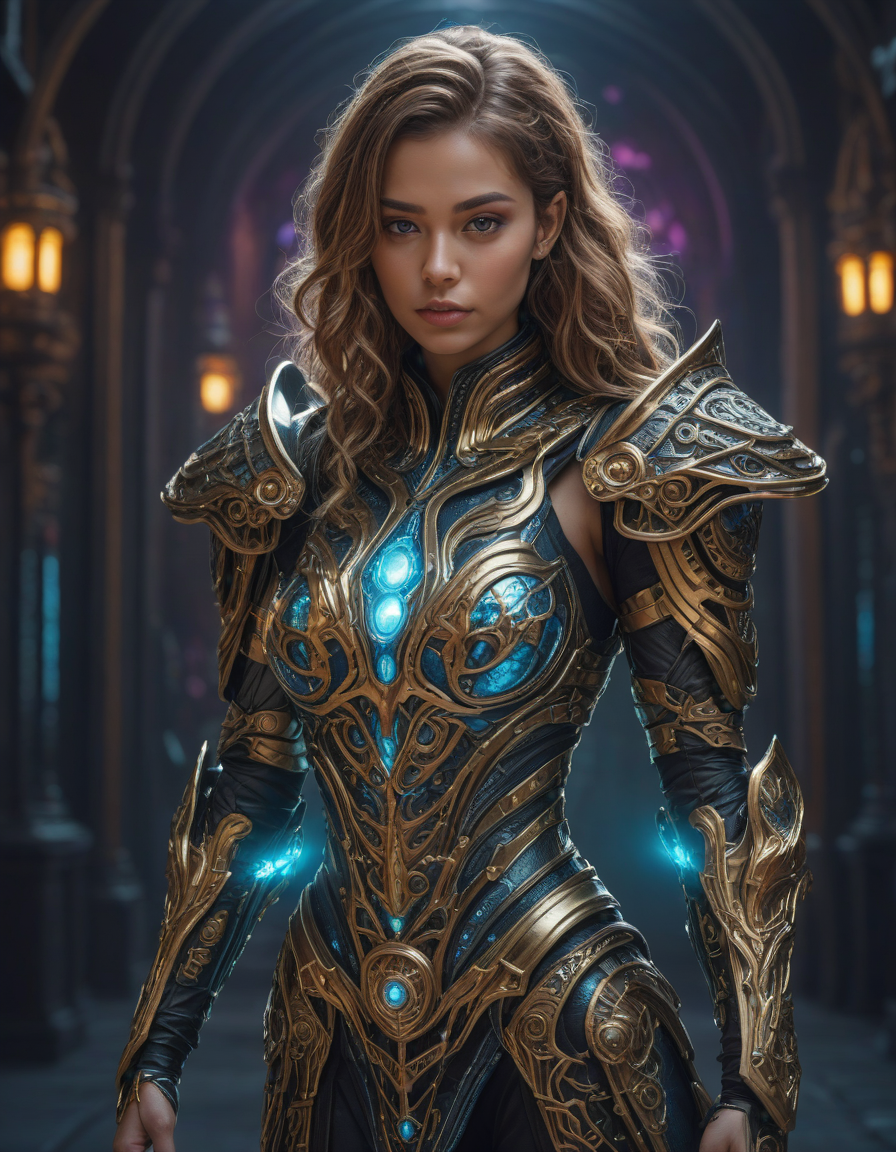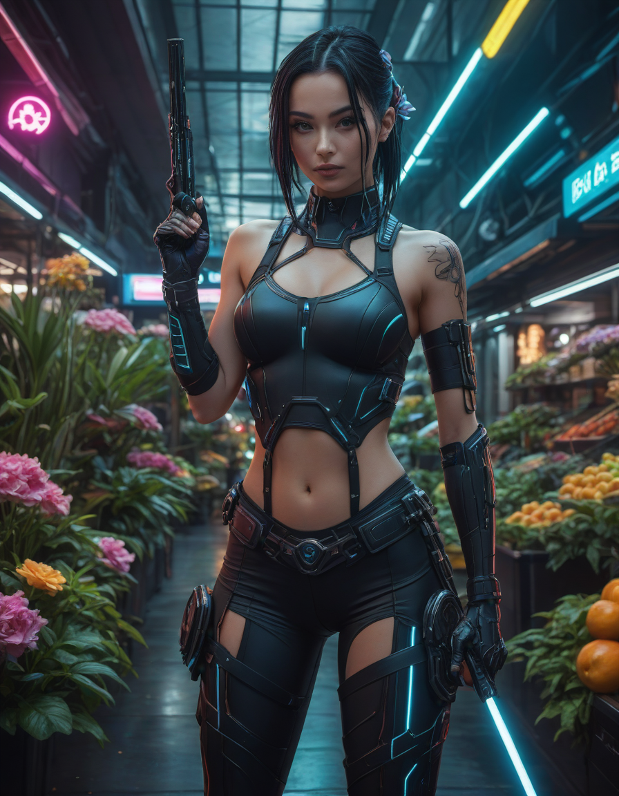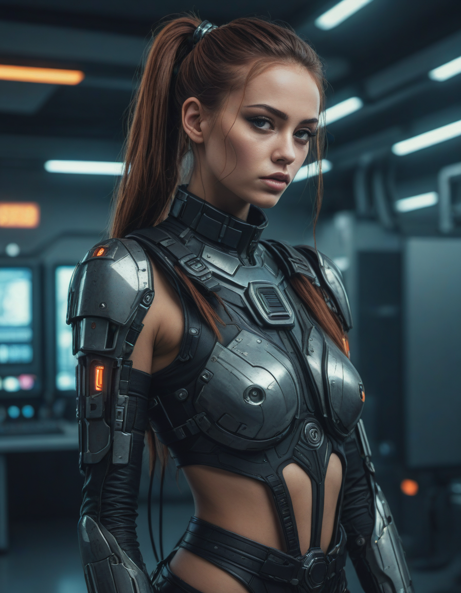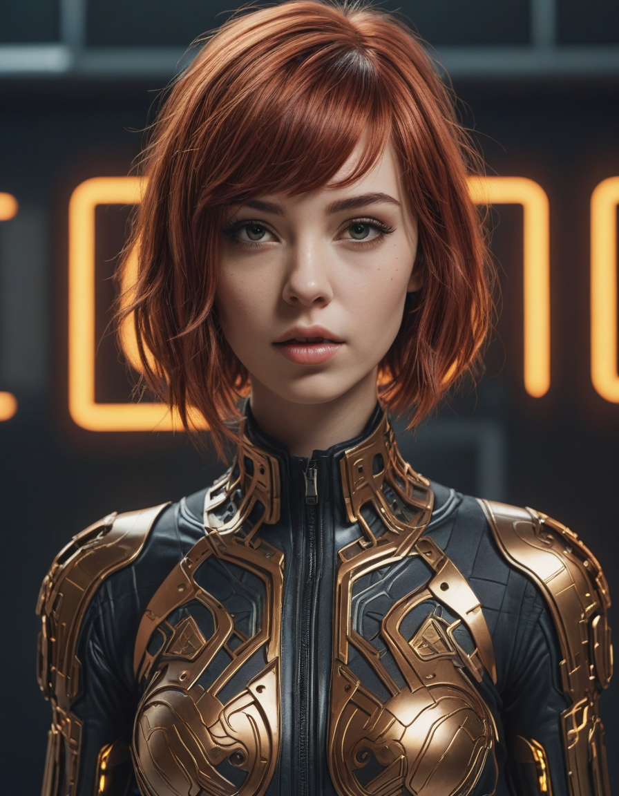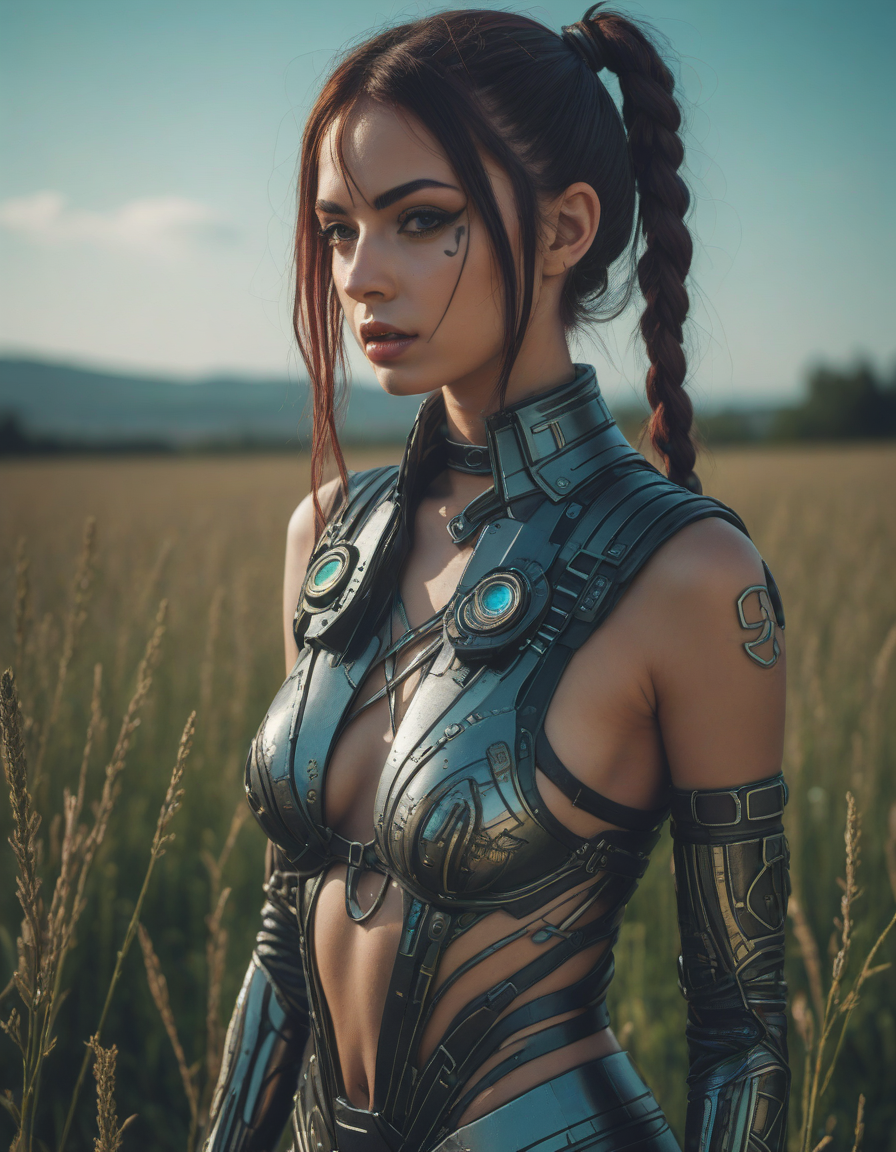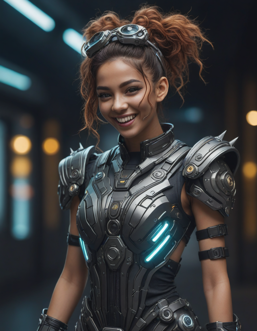 drab old-fashioned clothing, outdated style→futuristic cyberpunk outfit with glowing accents