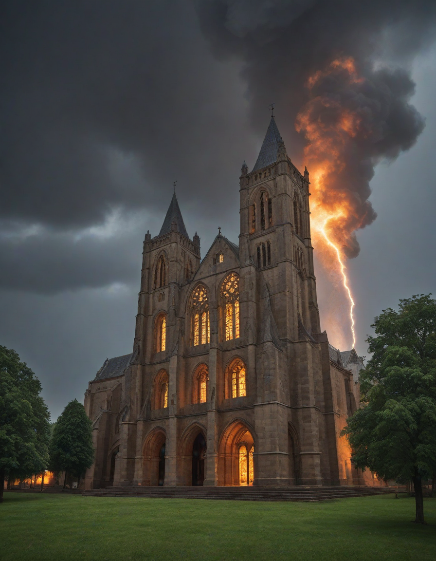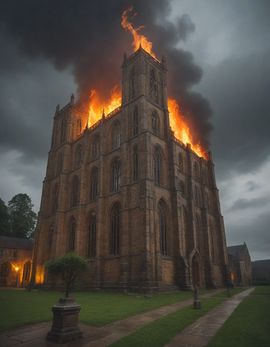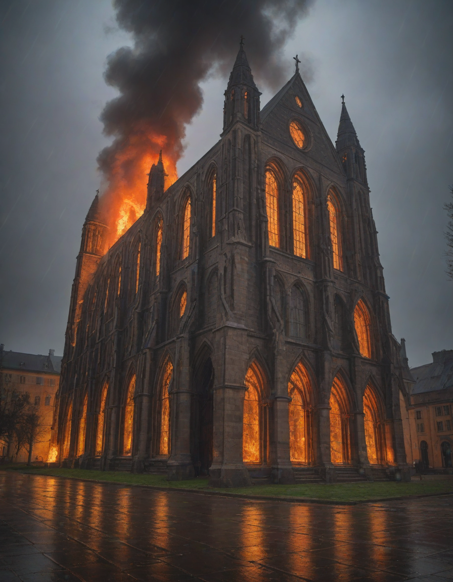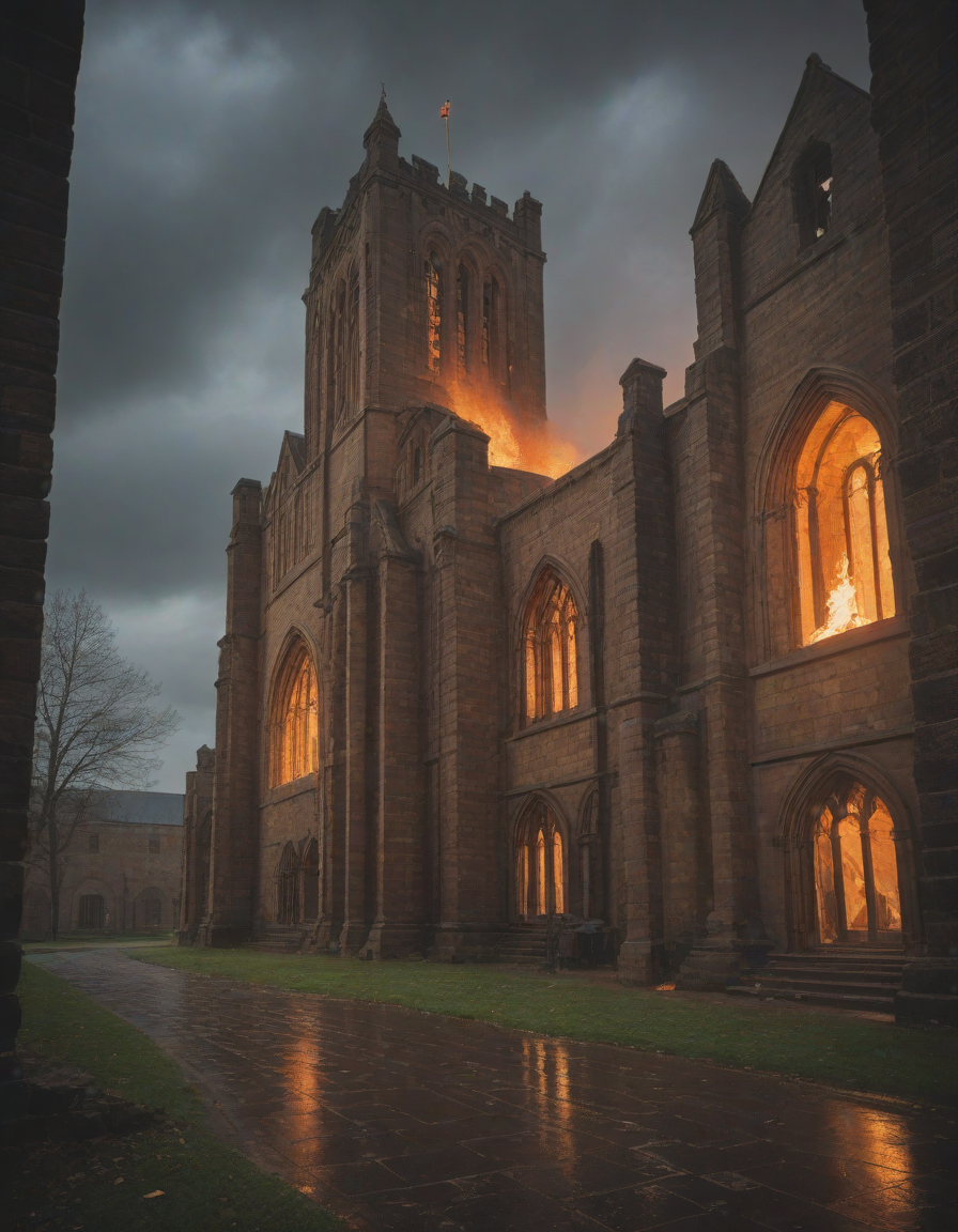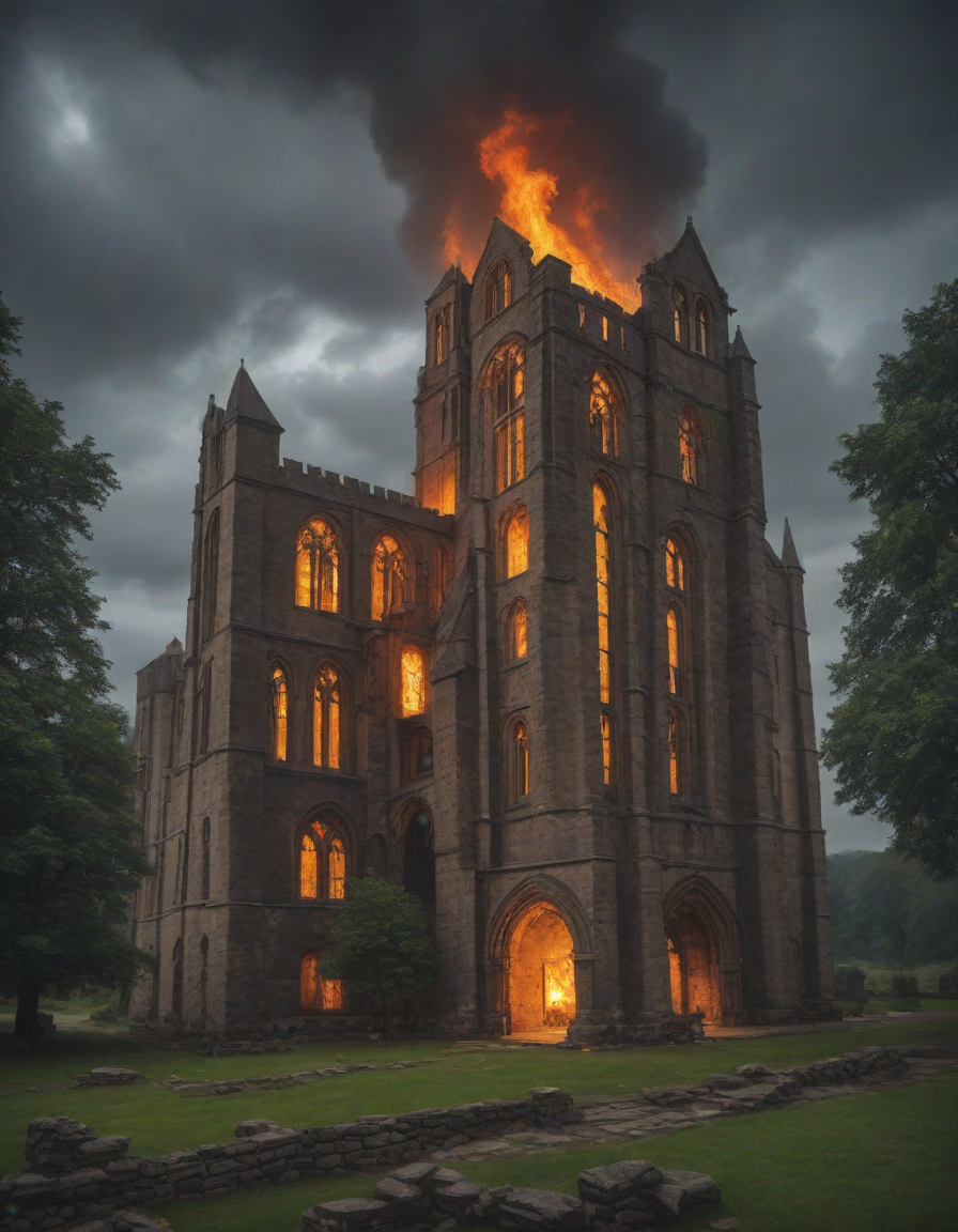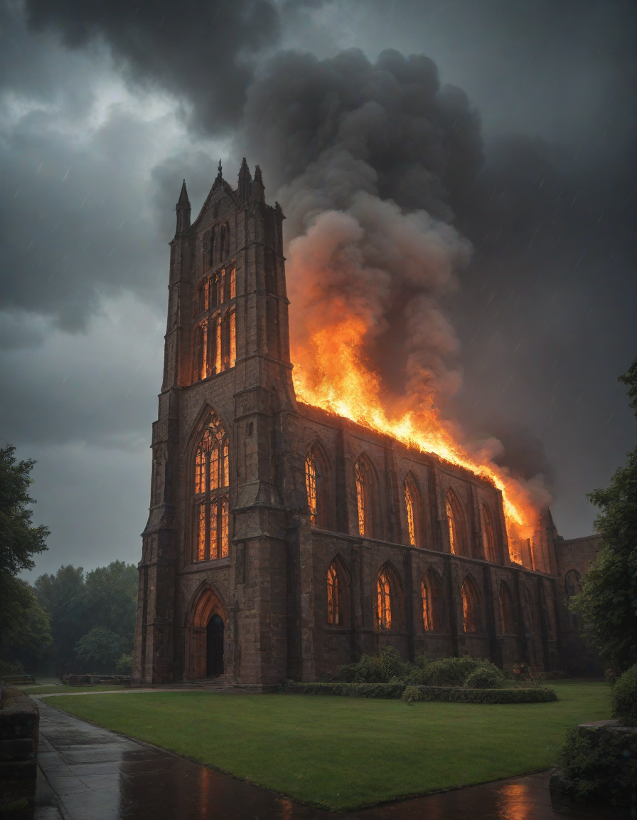 Old abbey on fire during dramatic rainstorm