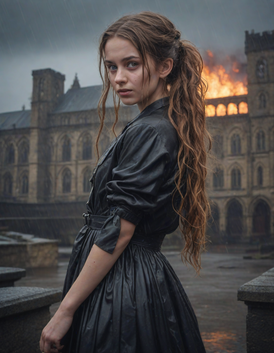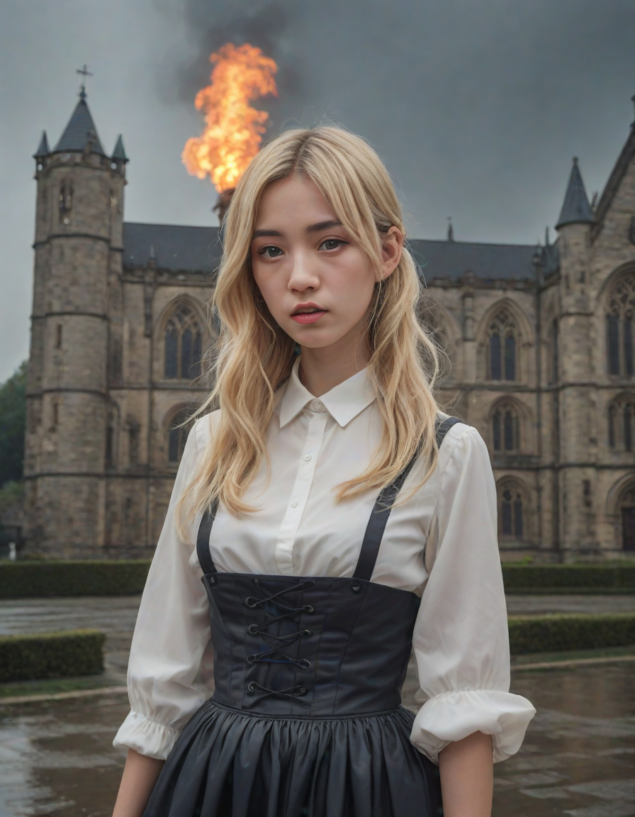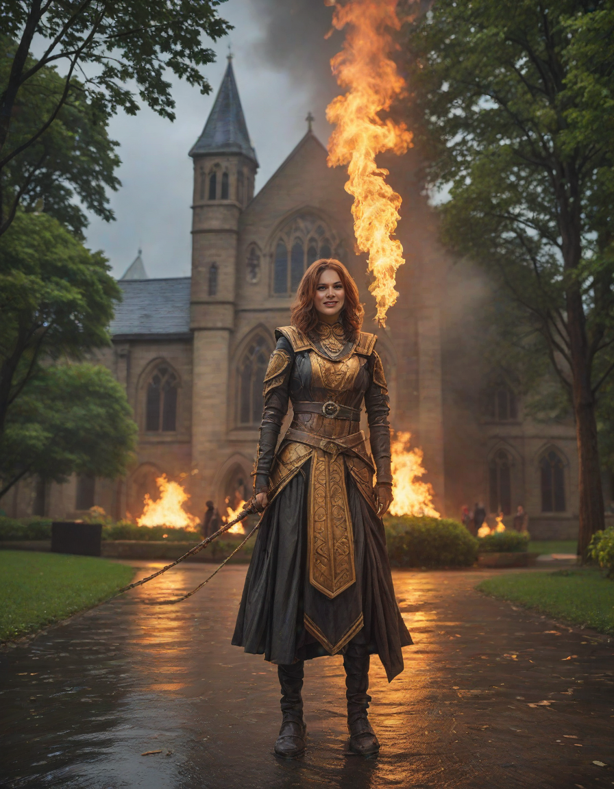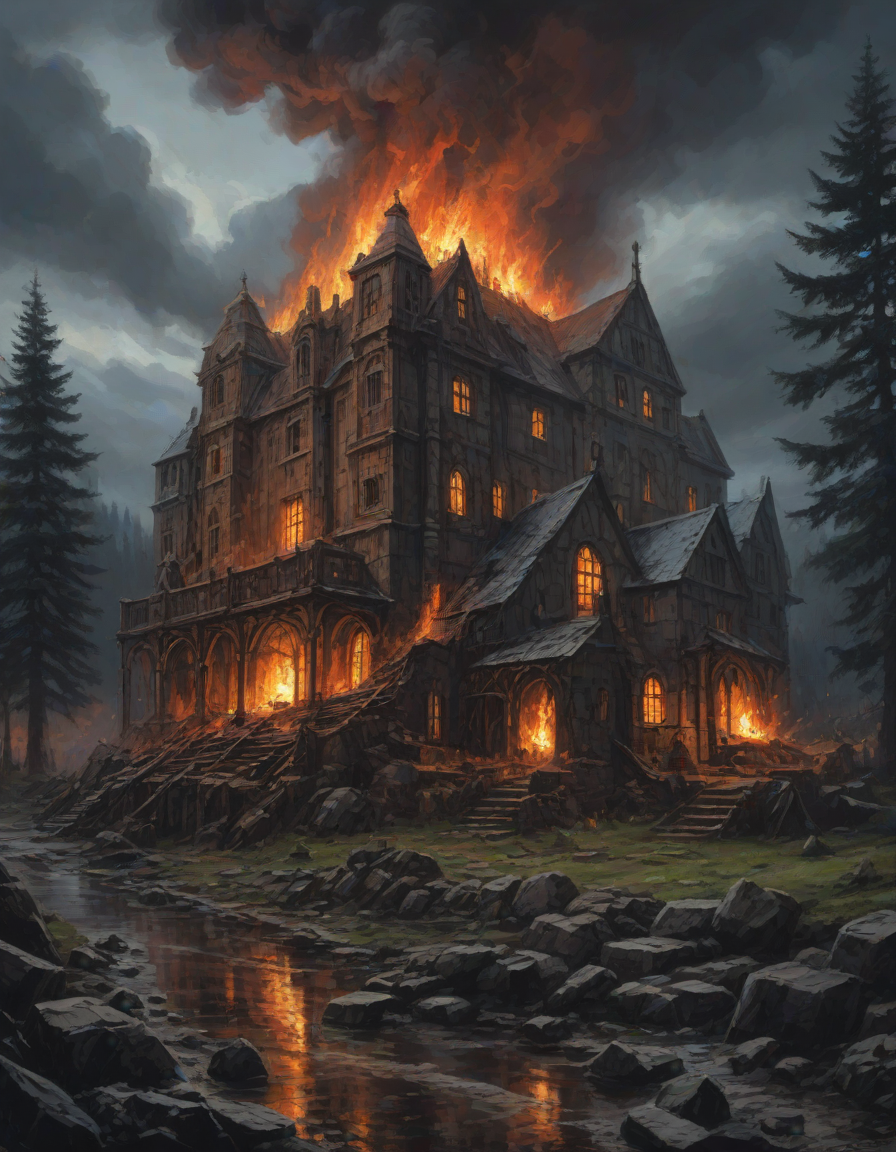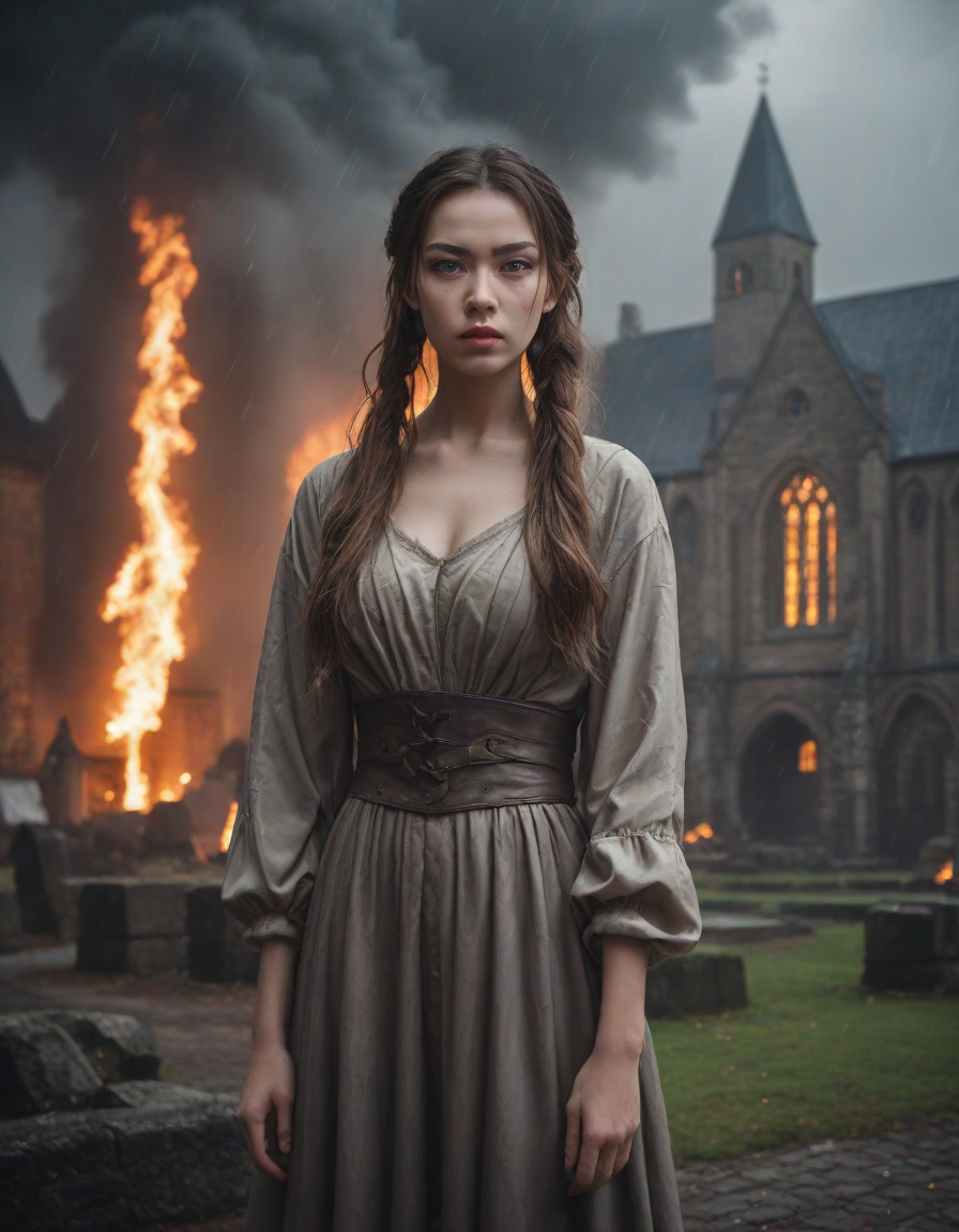 Old abbey on fire during dramatic rainstorm