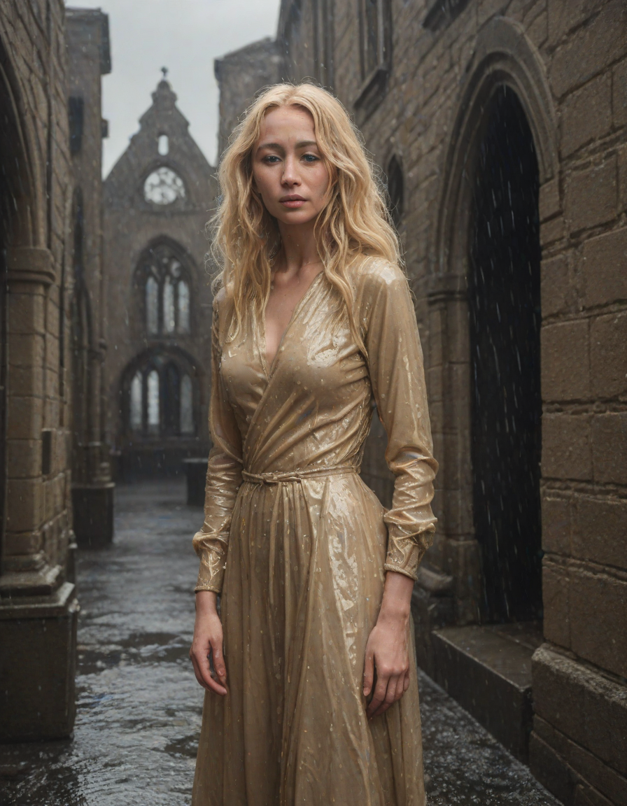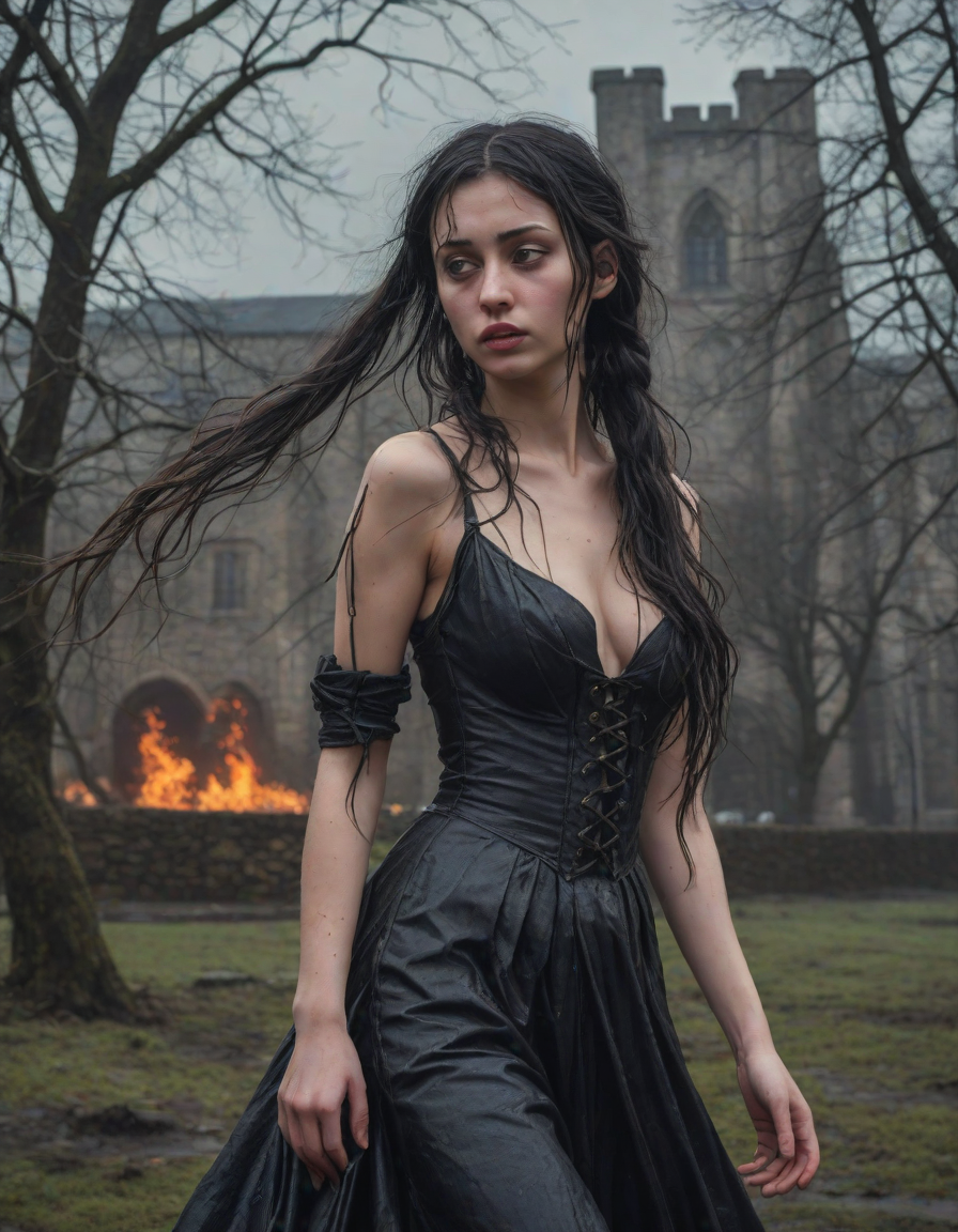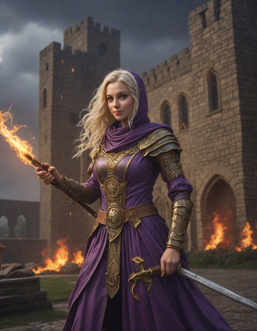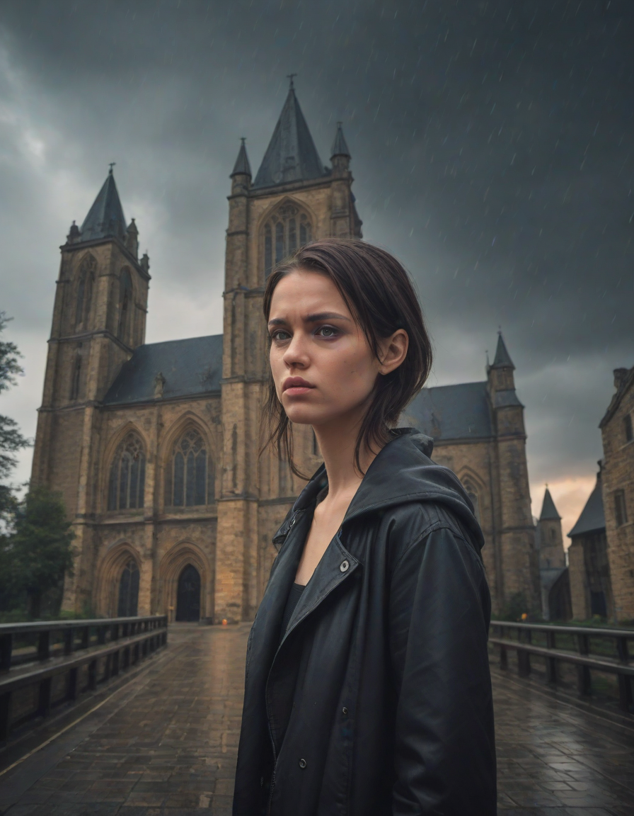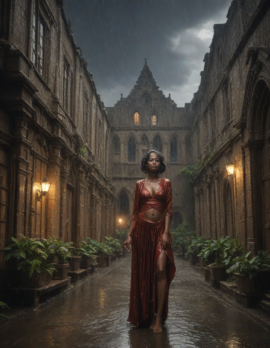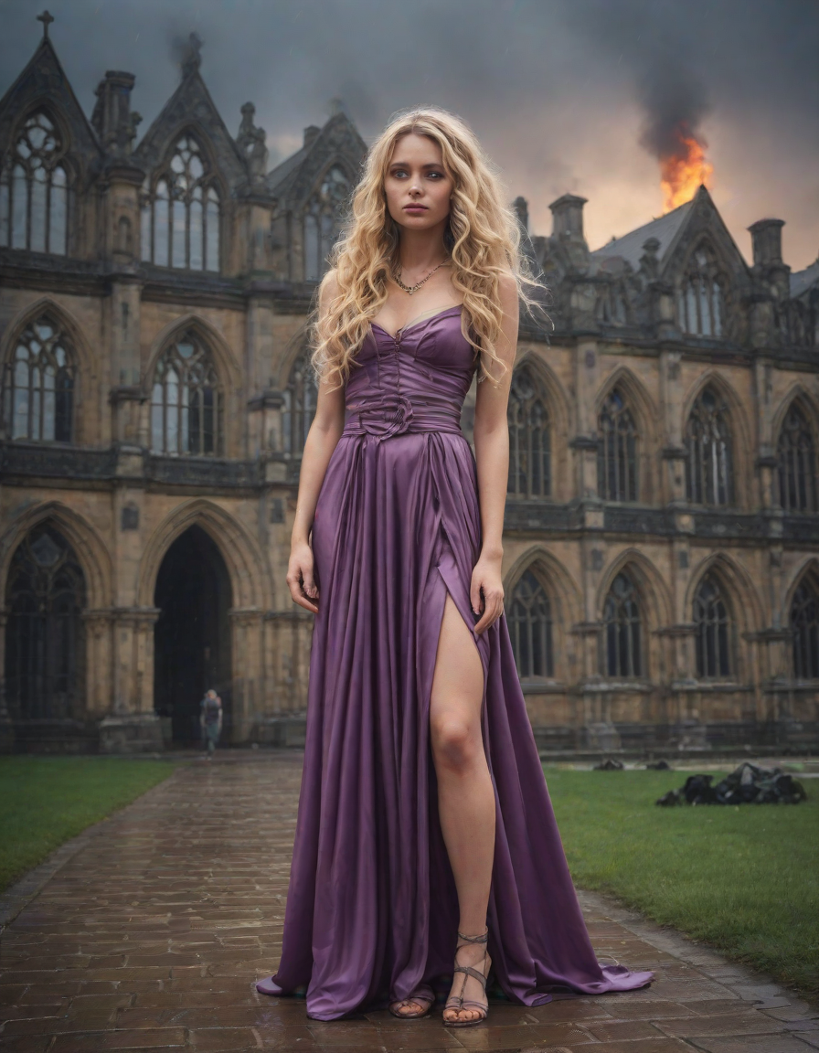 Old abbey on fire during dramatic rainstorm