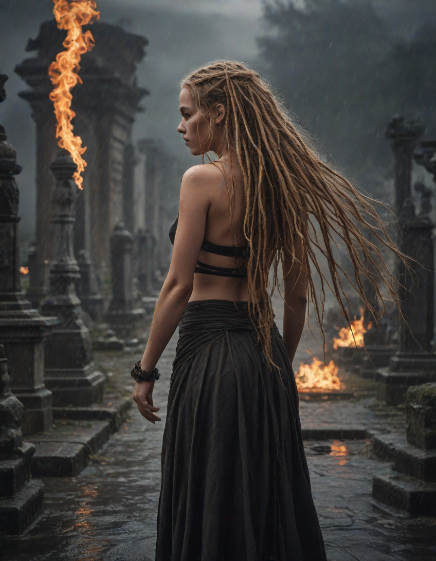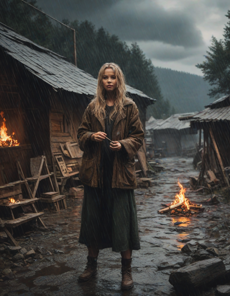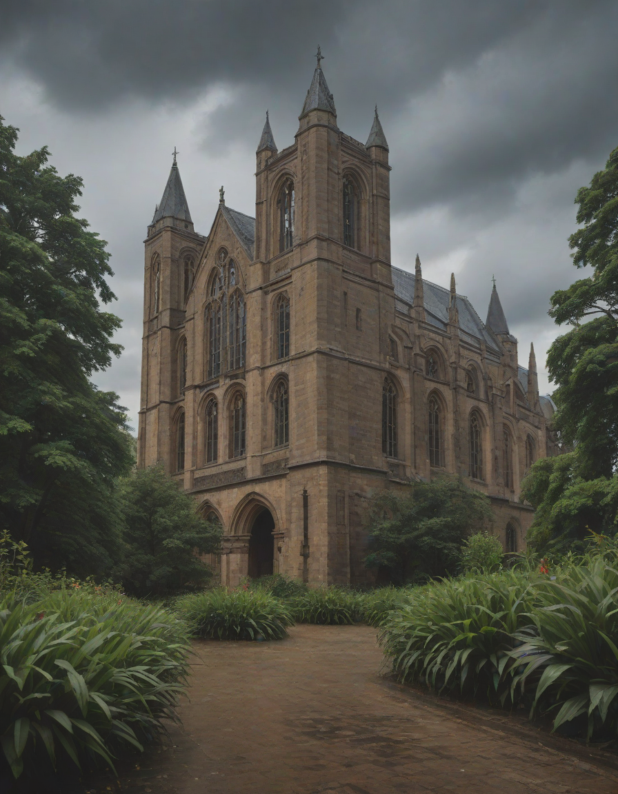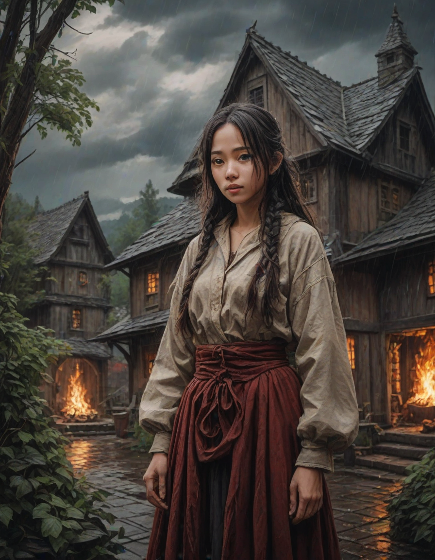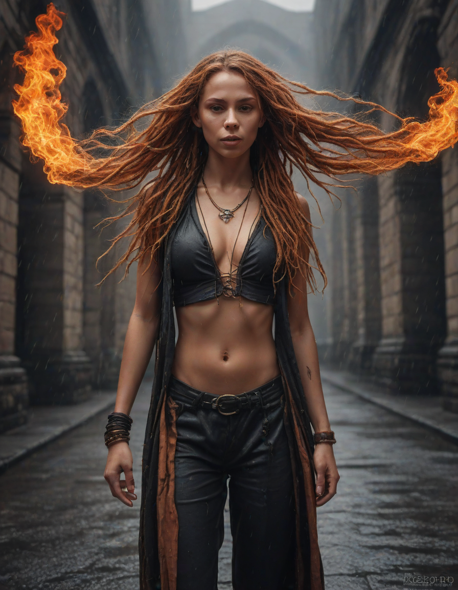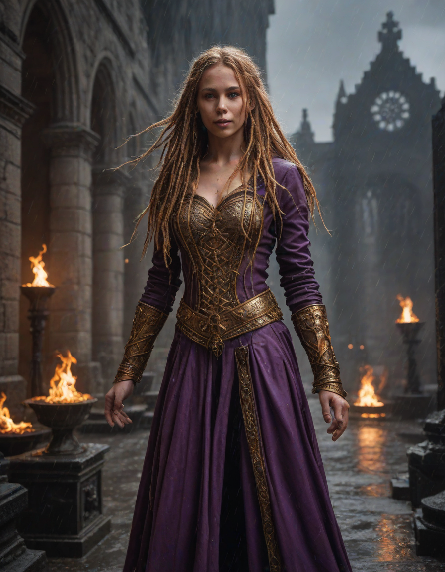 Old abbey on fire during dramatic rainstorm