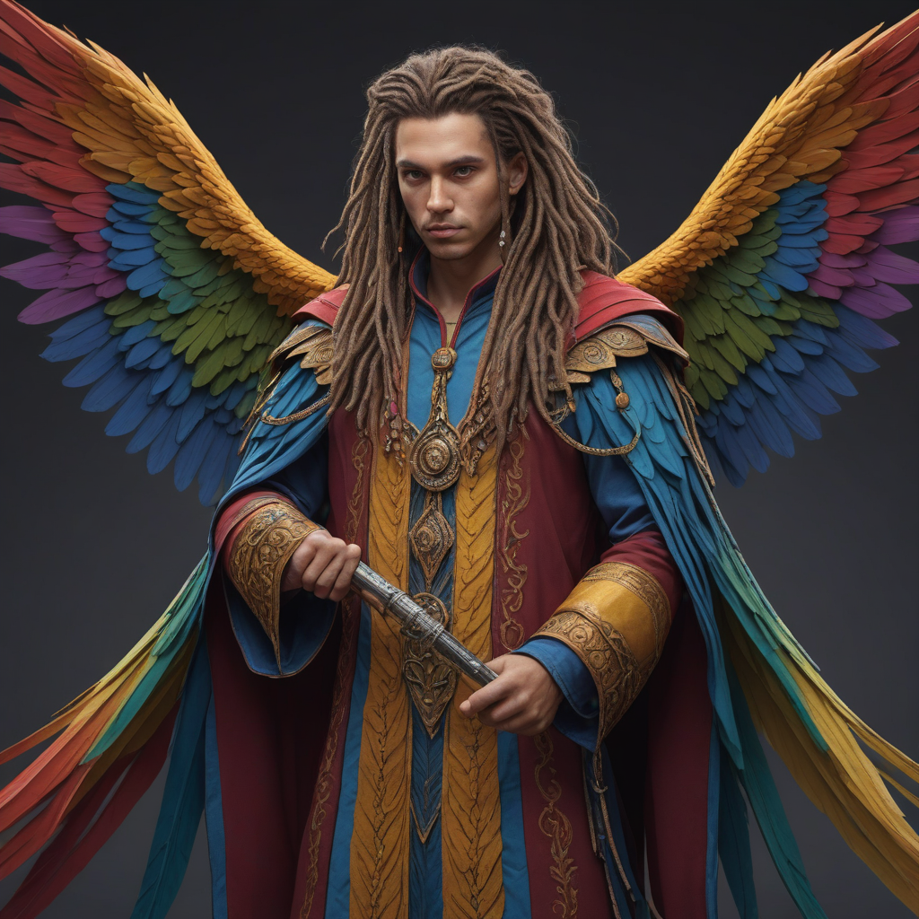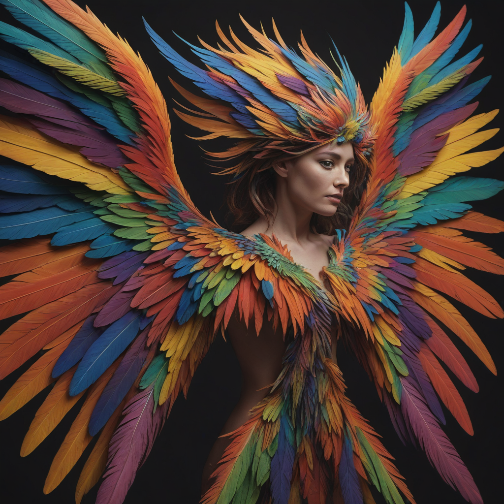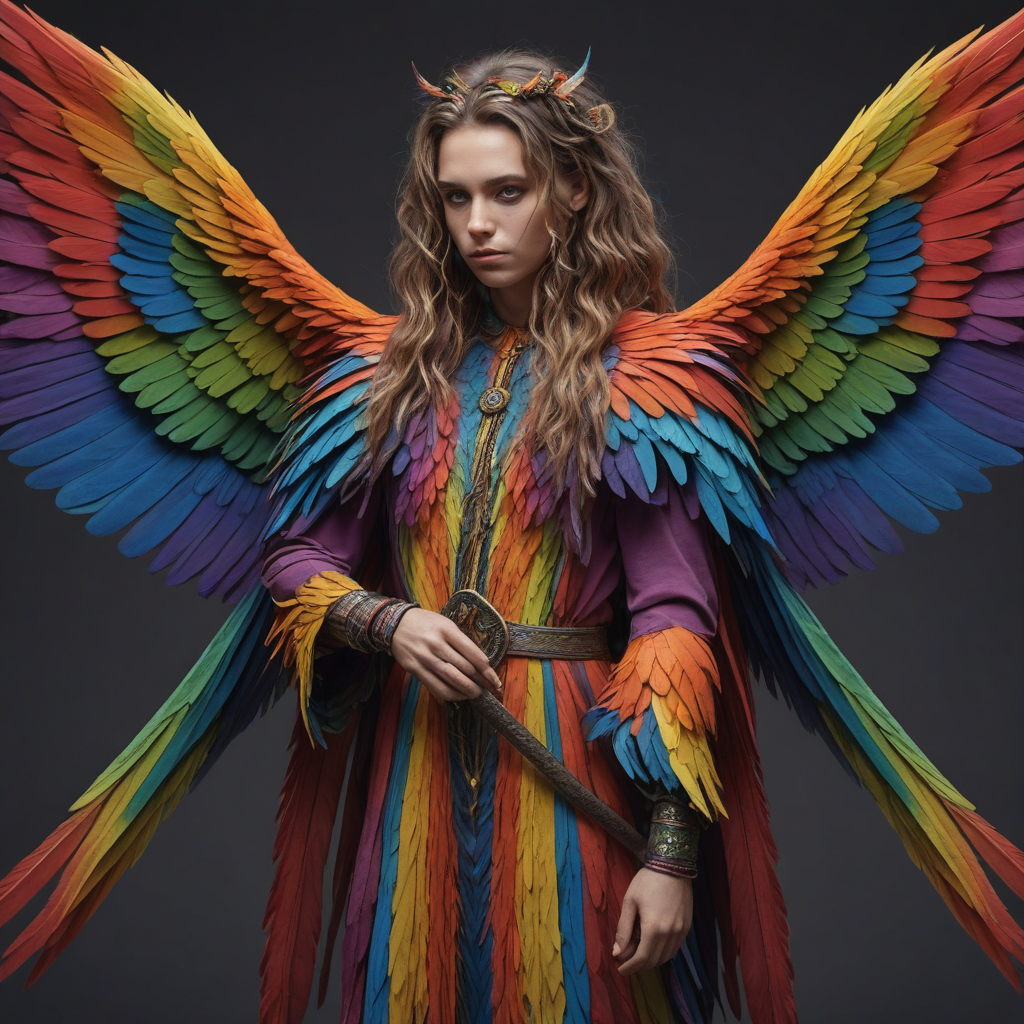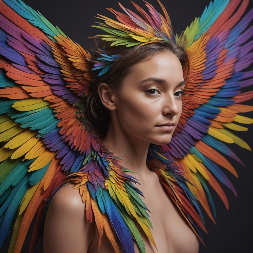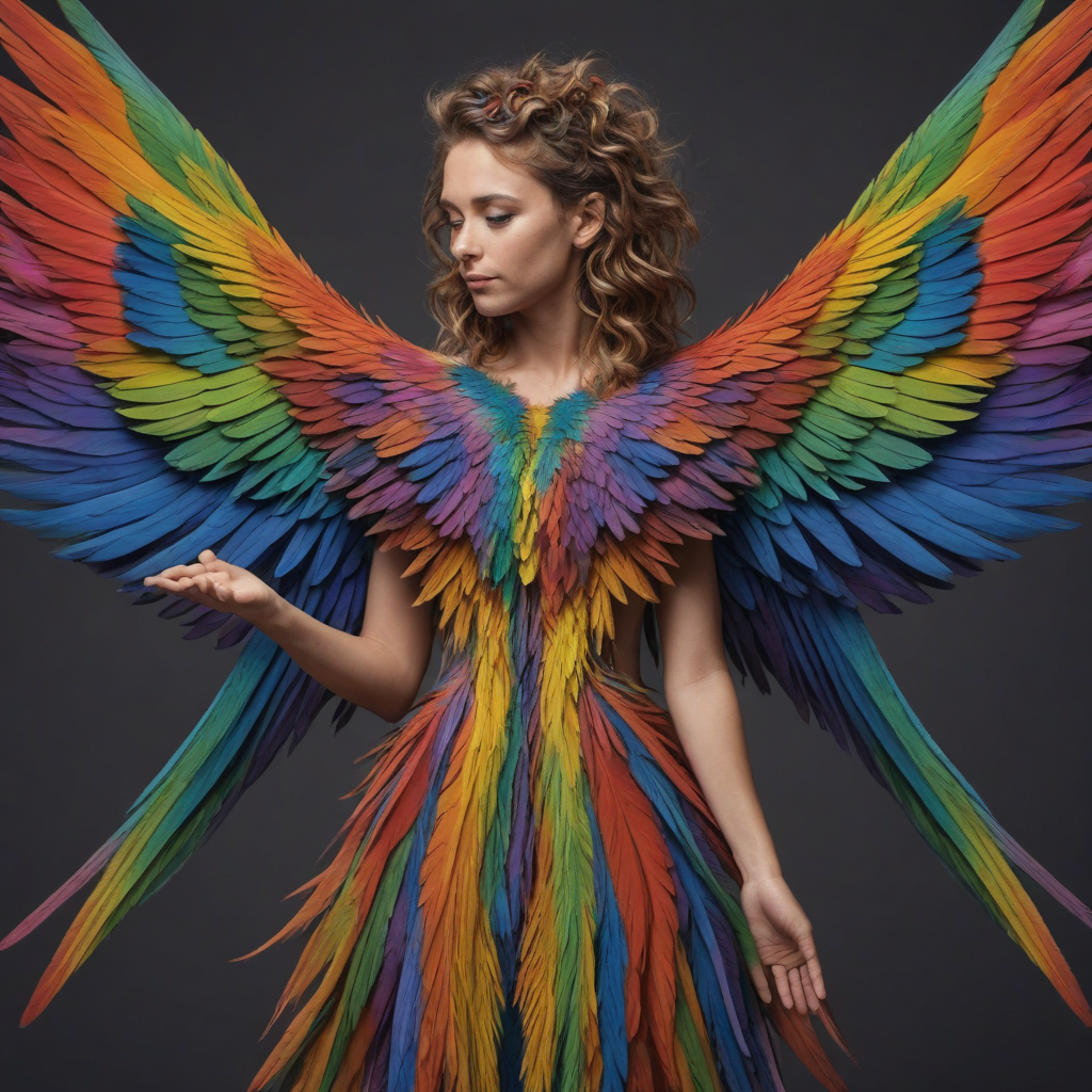 Rainbow-colored feathered wings