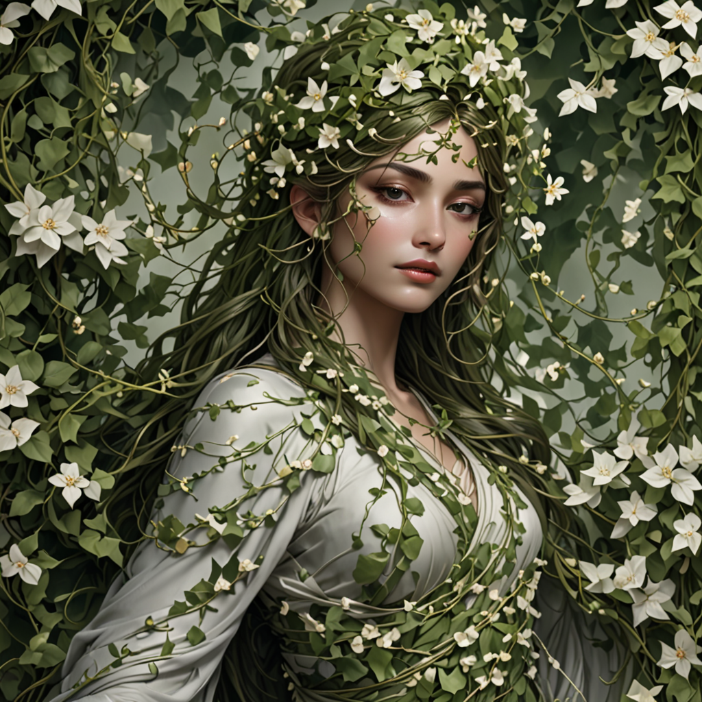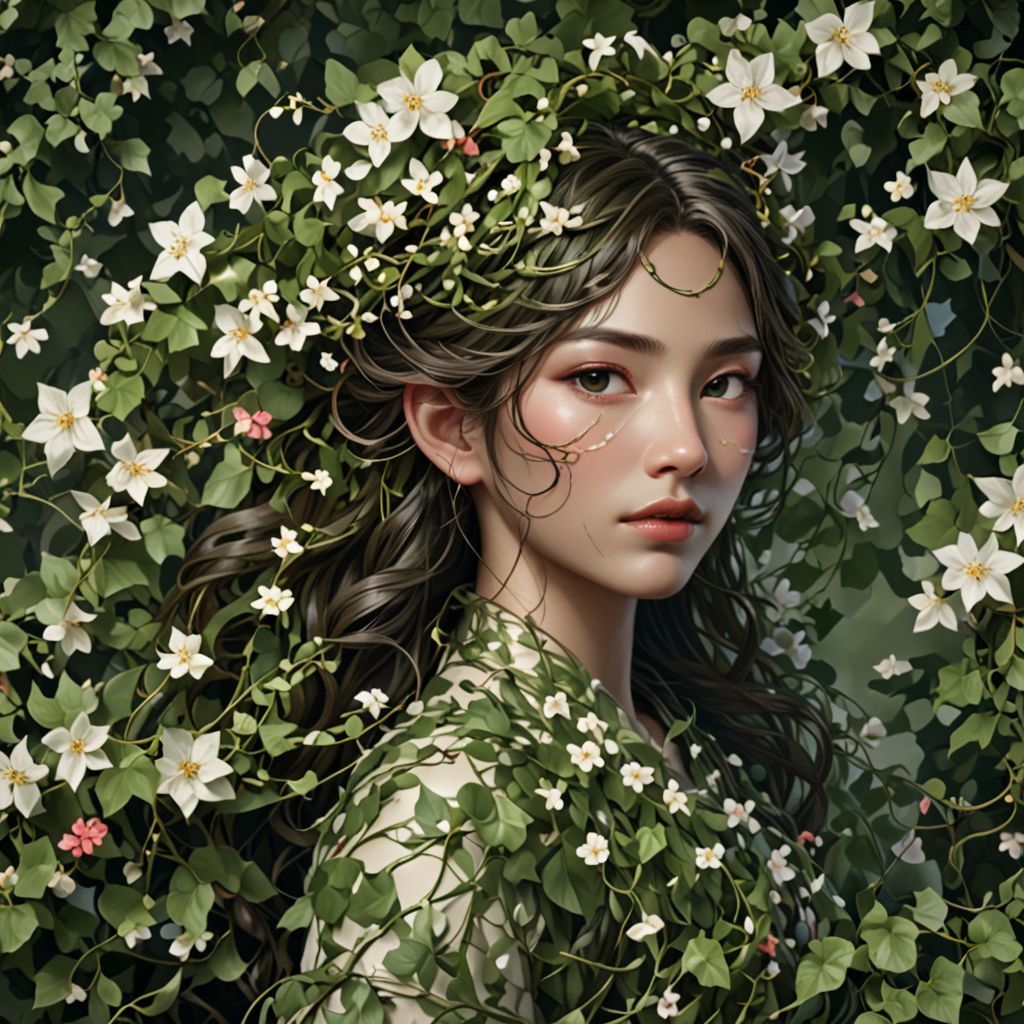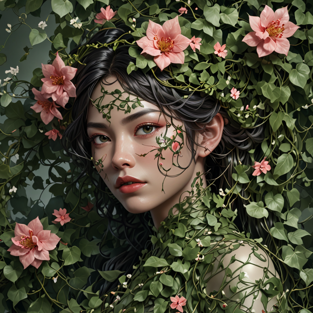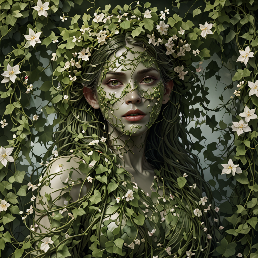 No plants, bare surroundings→Wrapped in flowering vines and foliage