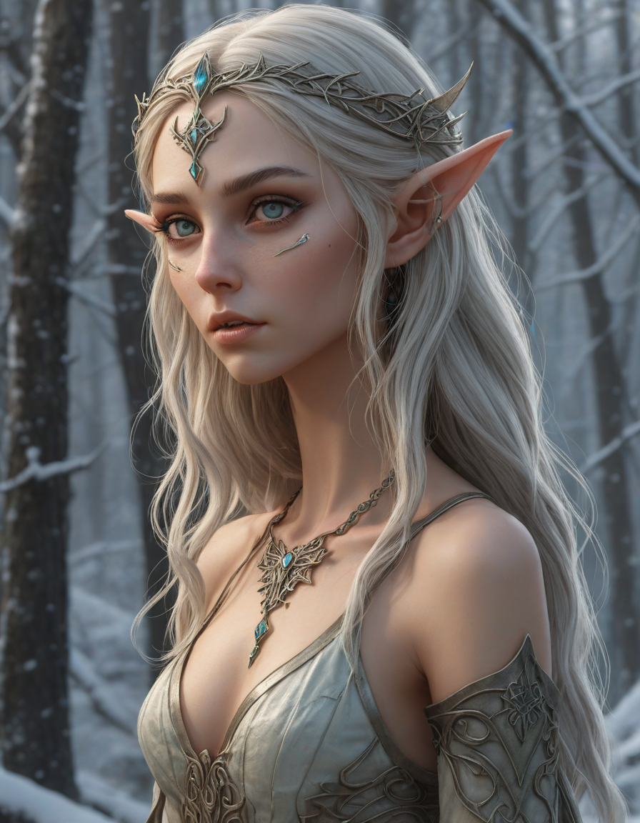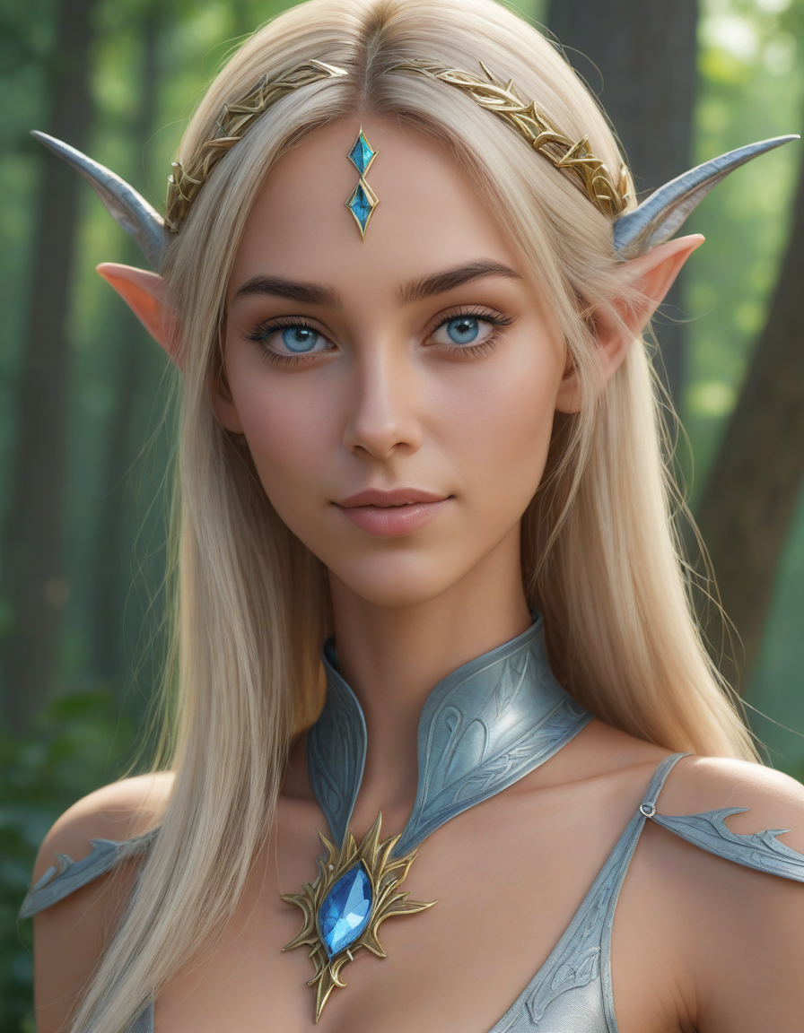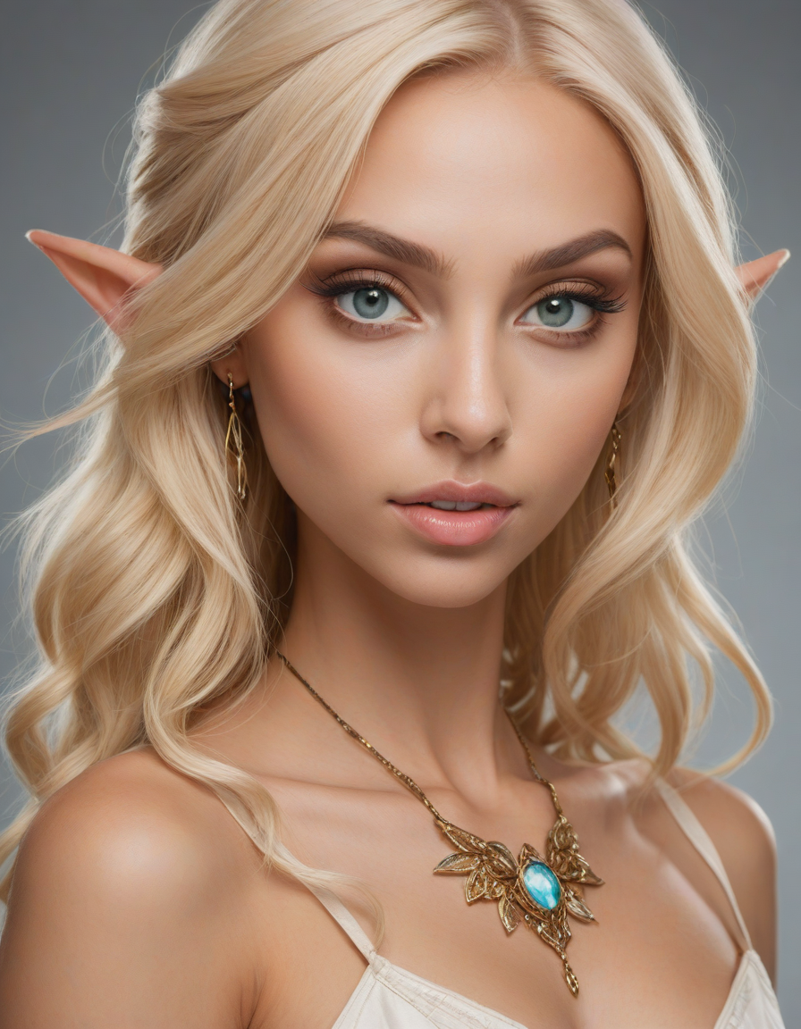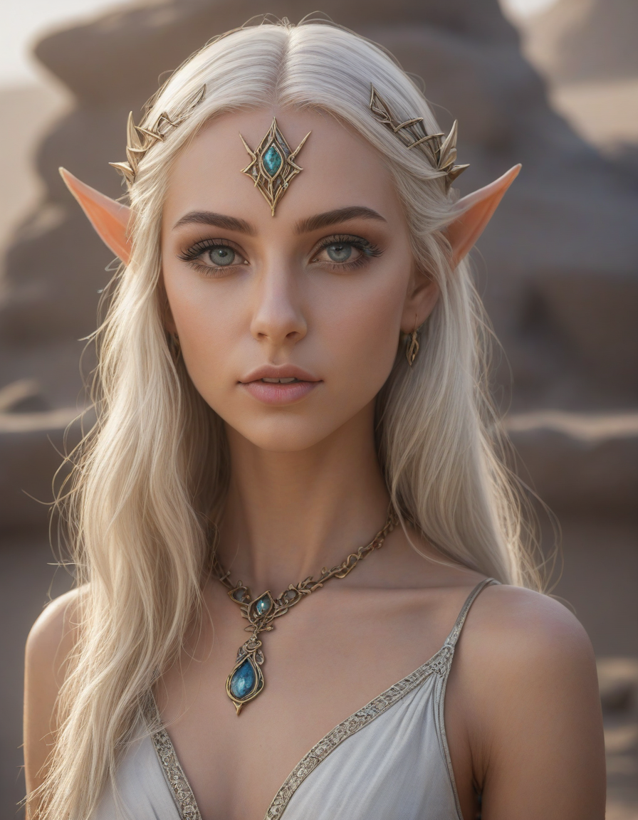 Neutral: female half-elf, partial Elven facial features, slight elven body, slightly almond-shaped eyes, high cheekbones, slightly pointed ears, ethereal beauty, textured smooth skin, slightly exotic, delicate features, tall, bright eye color,
