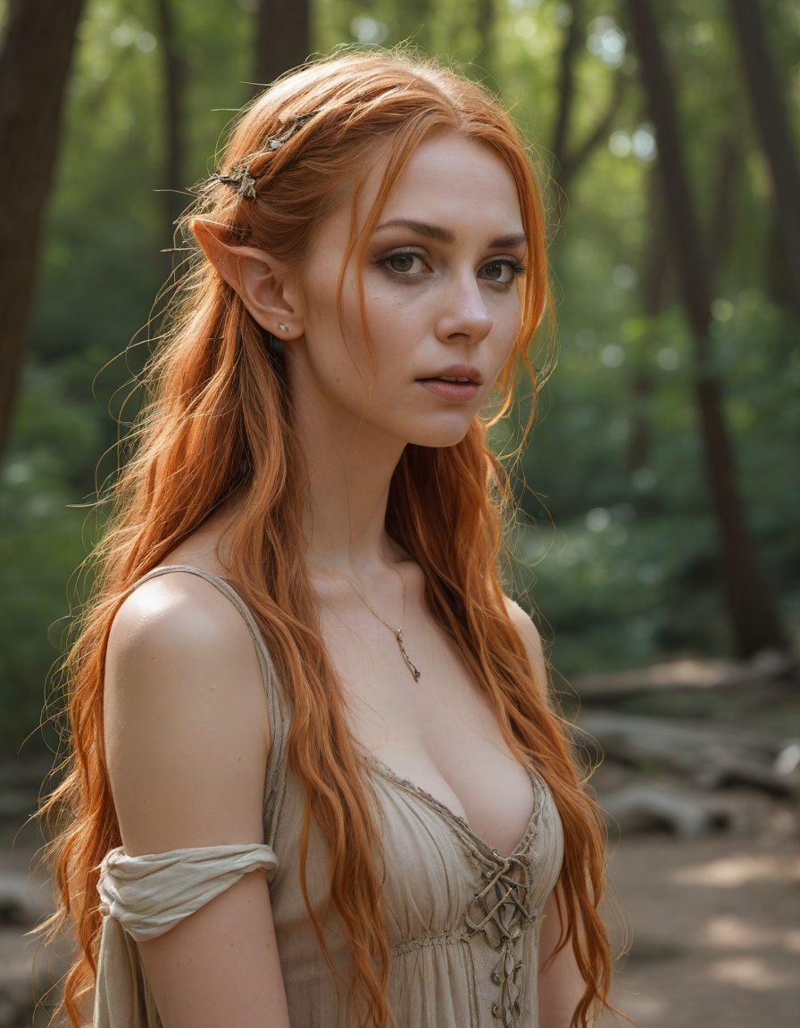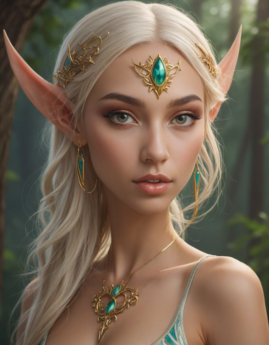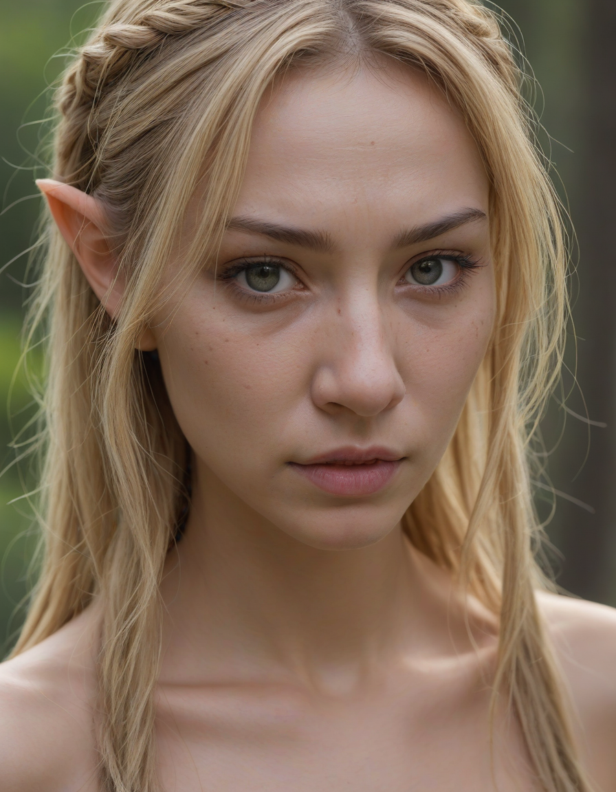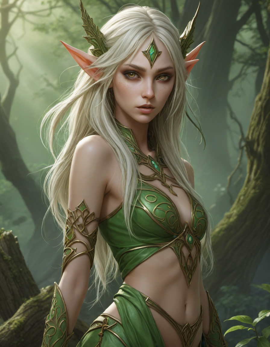 Target: female elf, Elven facial features, elven body, elven, lithe, distinct elven features, long elven legs, Slender, elongated physique, almond-shaped eyes, sharp cheekbones, pointed ears, ethereal beauty, graceful, agile, lithe, smooth skin, exotic, otherworldly aura, delicate features, tall and lean, vibrant eye color