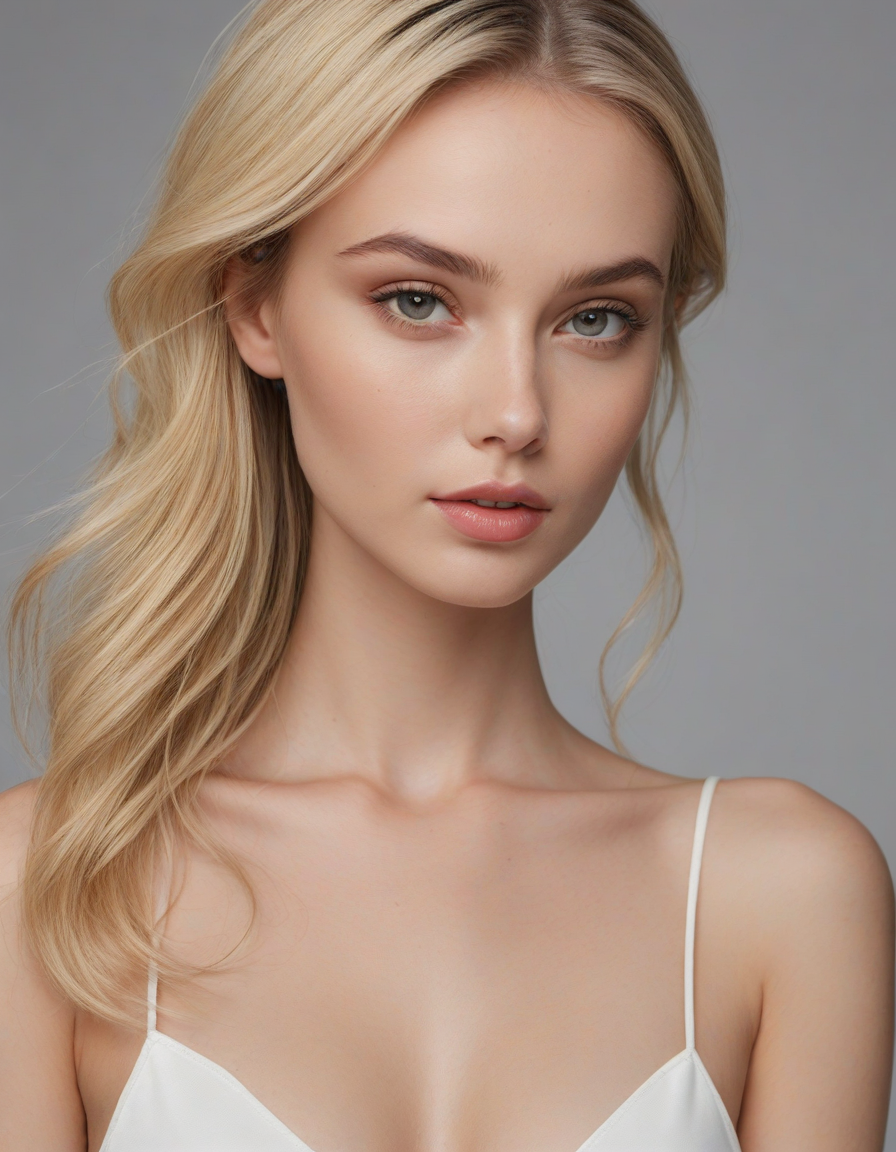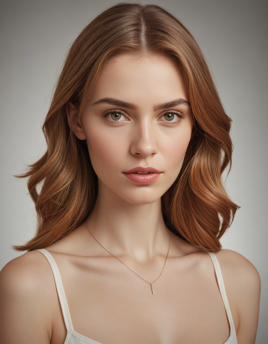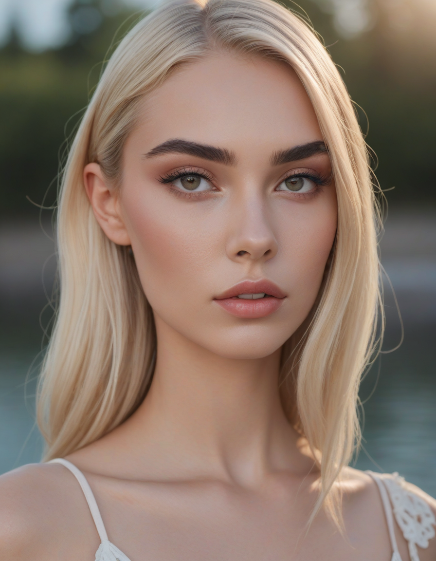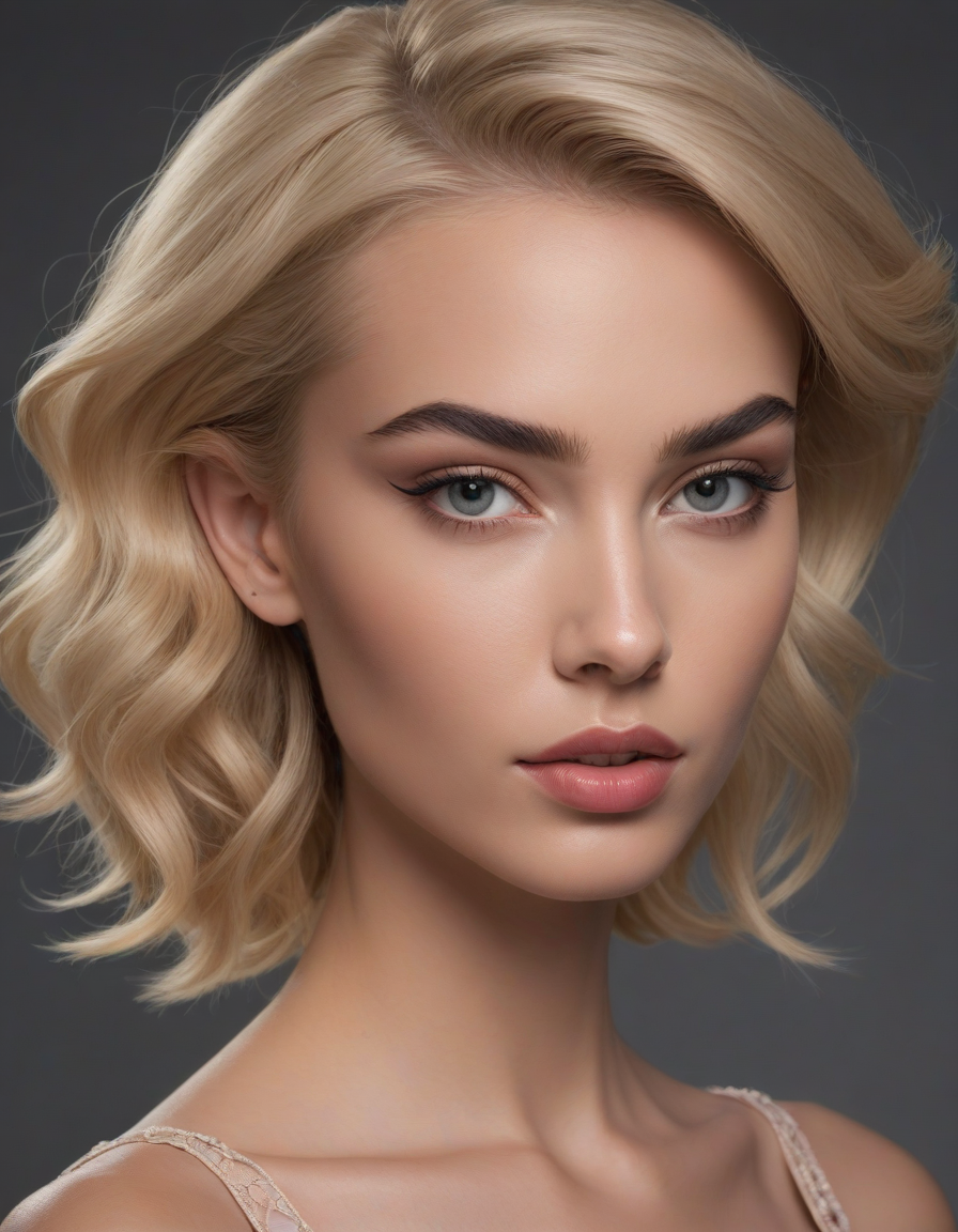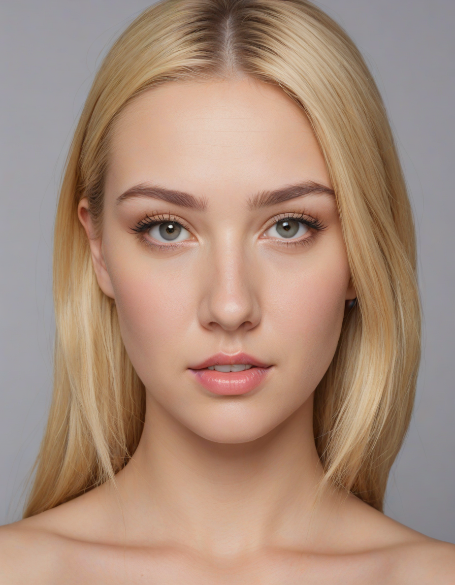 high-arched eyebrows, pronounced cheekbones, full lips, narrow facial structure, small chin, pointed nose tip, deep-set eyes, prominent jawline, smooth forehead, elongated face shape, subtle eye creases, thin nose bridge, voluminous cheek appearance, defined lip contour, sculpted facial silhouette, soft nasolabial folds, high forehead, delicate ear shape, refined jaw angle, sleek facial contour, Caucasian American Girl, Bimbo Facial Features, Barbie-esque Facial Features, british, pale, 18yo, 18 year old, young, youthful,