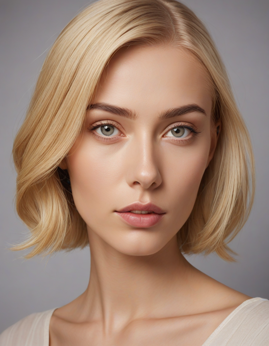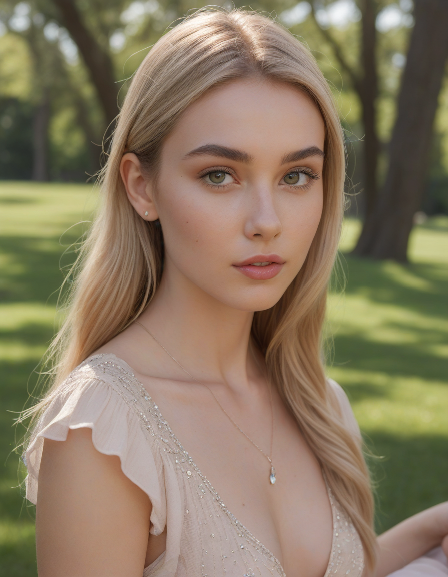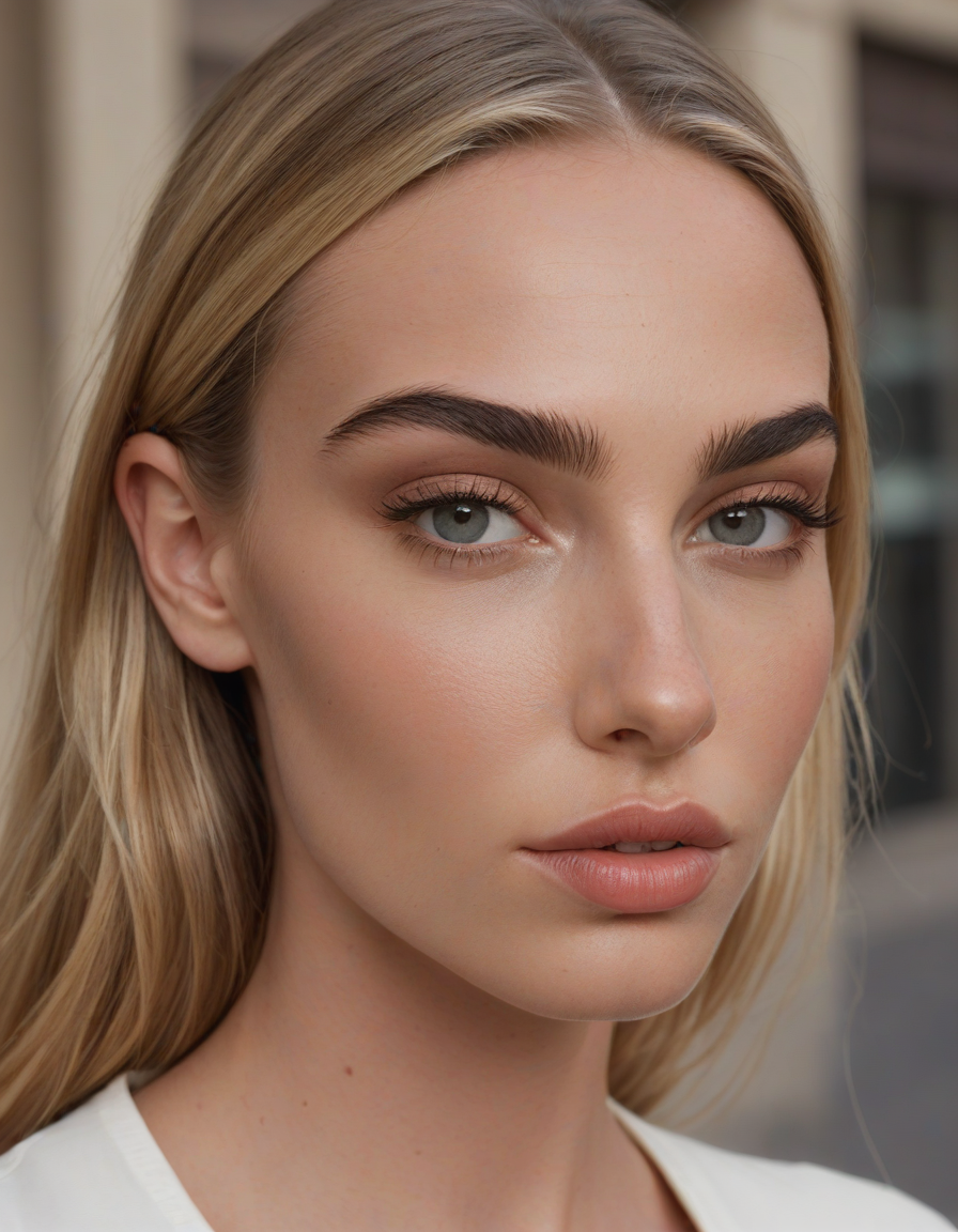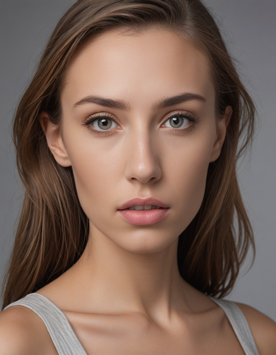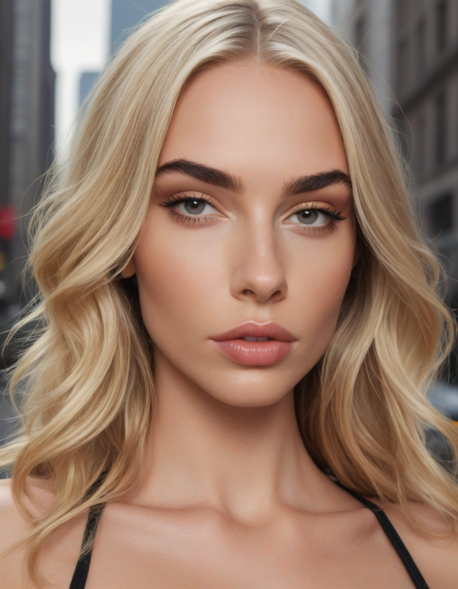 high-arched eyebrows, pronounced cheekbones, full lips, narrow facial structure, small chin, pointed nose tip, deep-set eyes, prominent jawline, smooth forehead, elongated face shape, subtle eye creases, thin nose bridge, voluminous cheek appearance, defined lip contour, sculpted facial silhouette, soft nasolabial folds, high forehead, delicate ear shape, refined jaw angle, sleek facial contour, Caucasian American Girl, Bimbo Facial Features, Barbie-esque Facial Features, british, pale, 18yo, 18 year old, young, youthful,