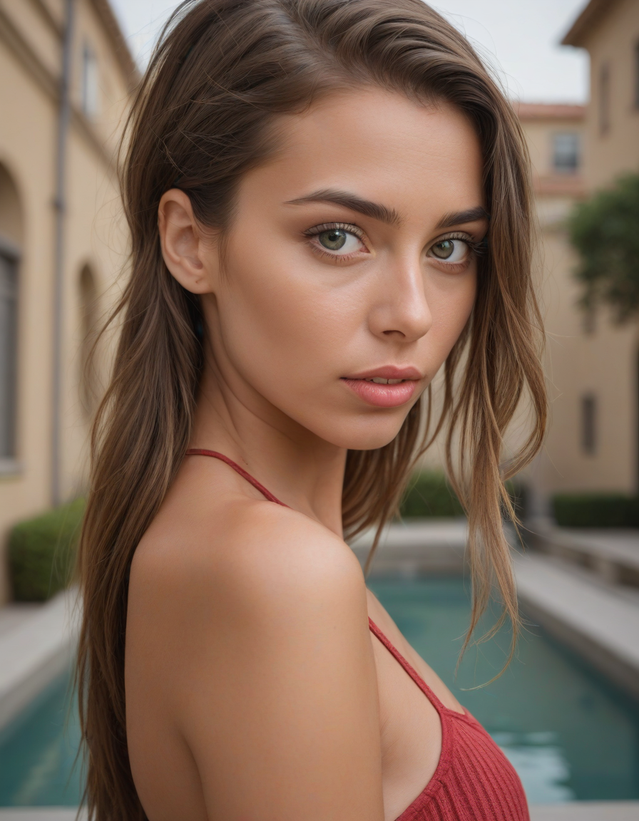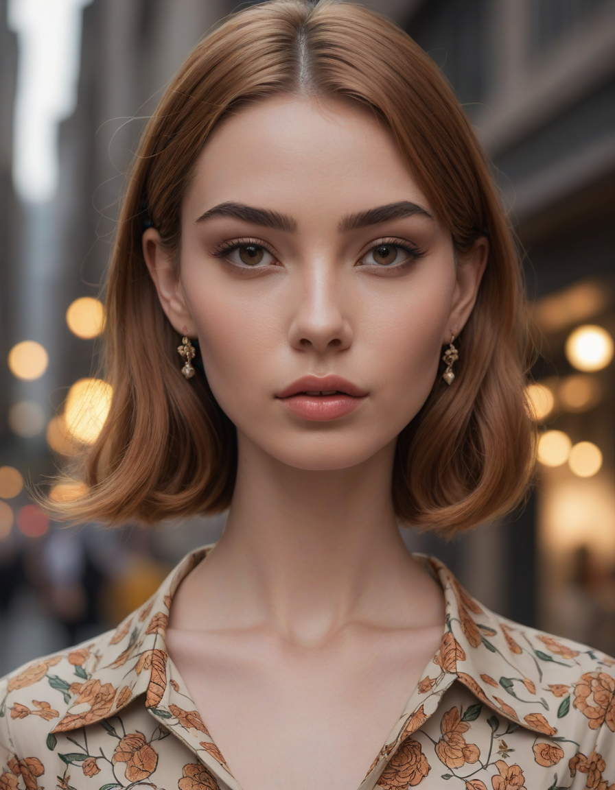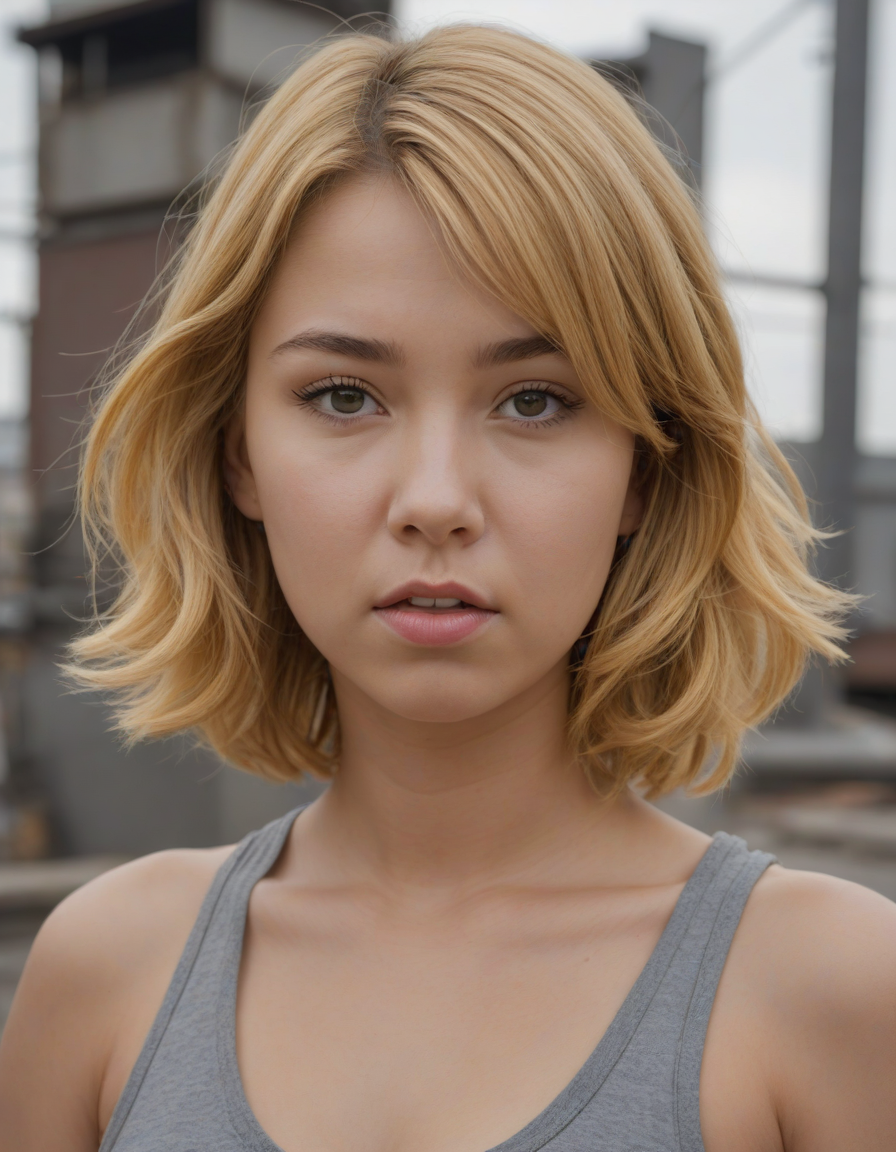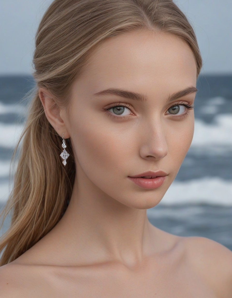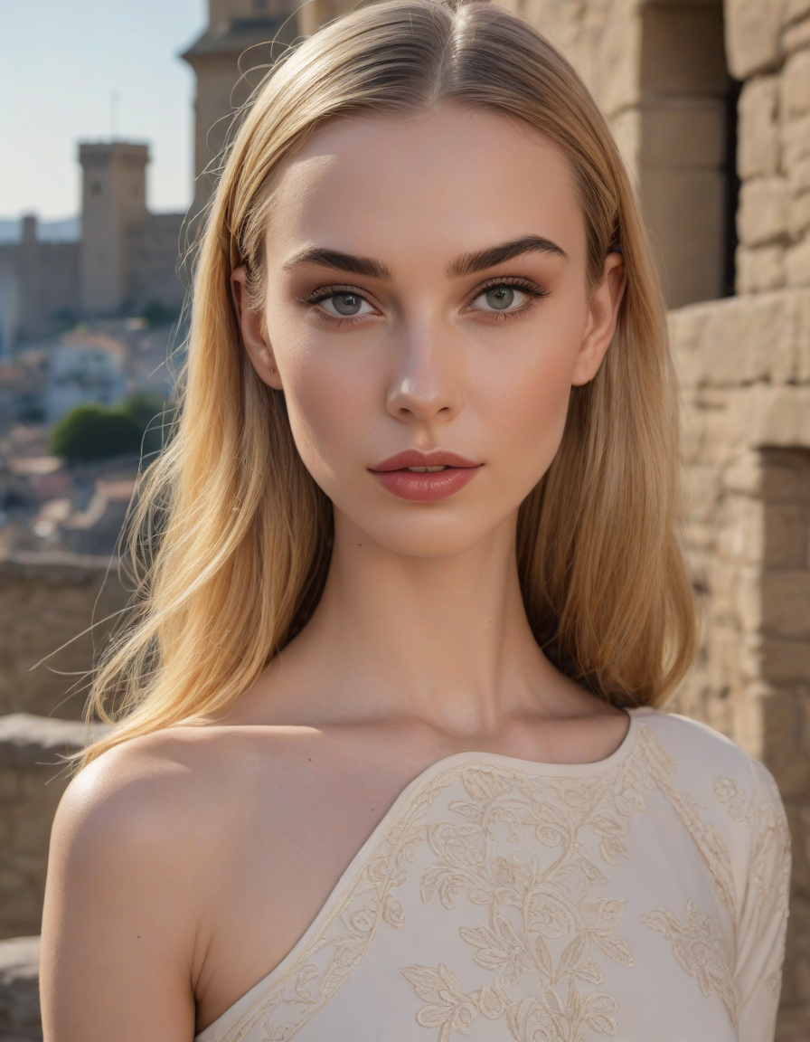 high-arched eyebrows, pronounced cheekbones, full lips, narrow facial structure, small chin, pointed nose tip, deep-set eyes, prominent jawline, smooth forehead, elongated face shape, subtle eye creases, thin nose bridge, voluminous cheek appearance, defined lip contour, sculpted facial silhouette, soft nasolabial folds, high forehead, delicate ear shape, refined jaw angle, sleek facial contour, Caucasian American Girl, Bimbo Facial Features, Barbie-esque Facial Features, british, pale, 18yo, 18 year old, young, youthful,