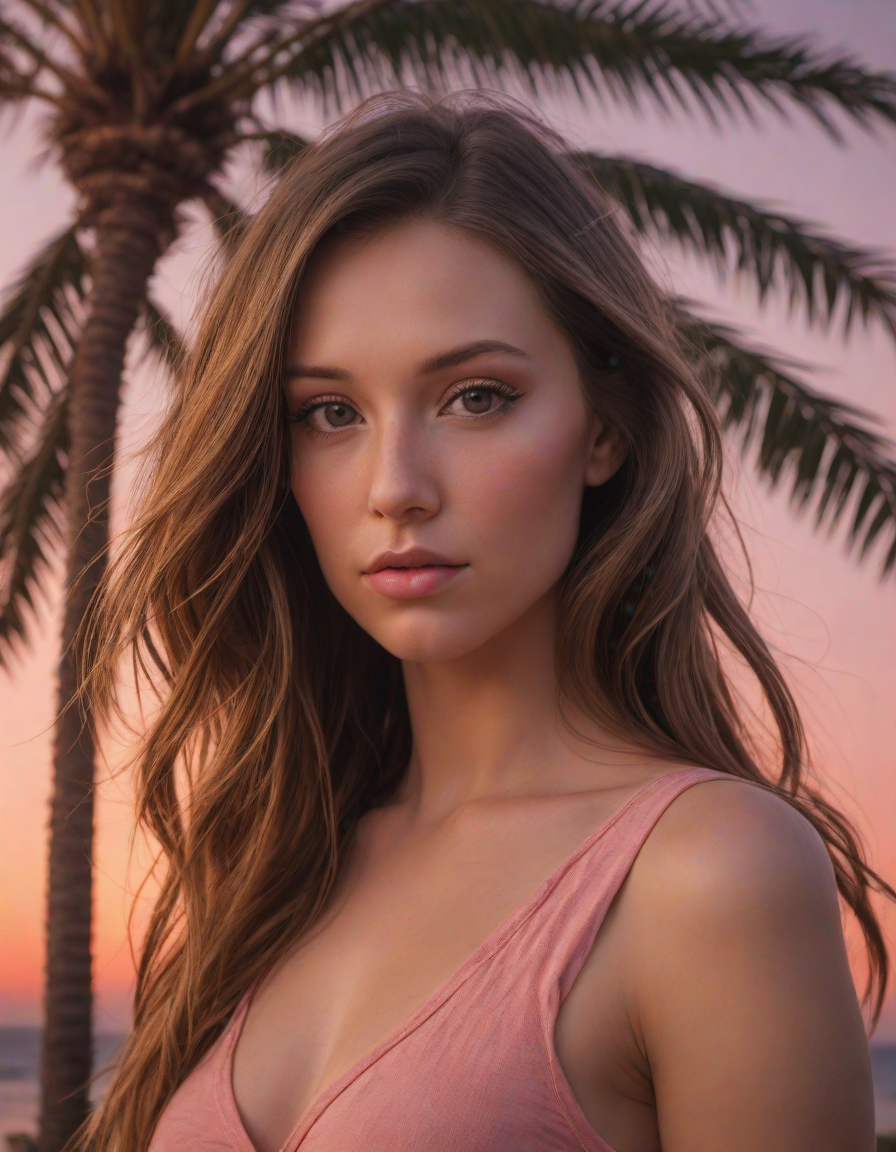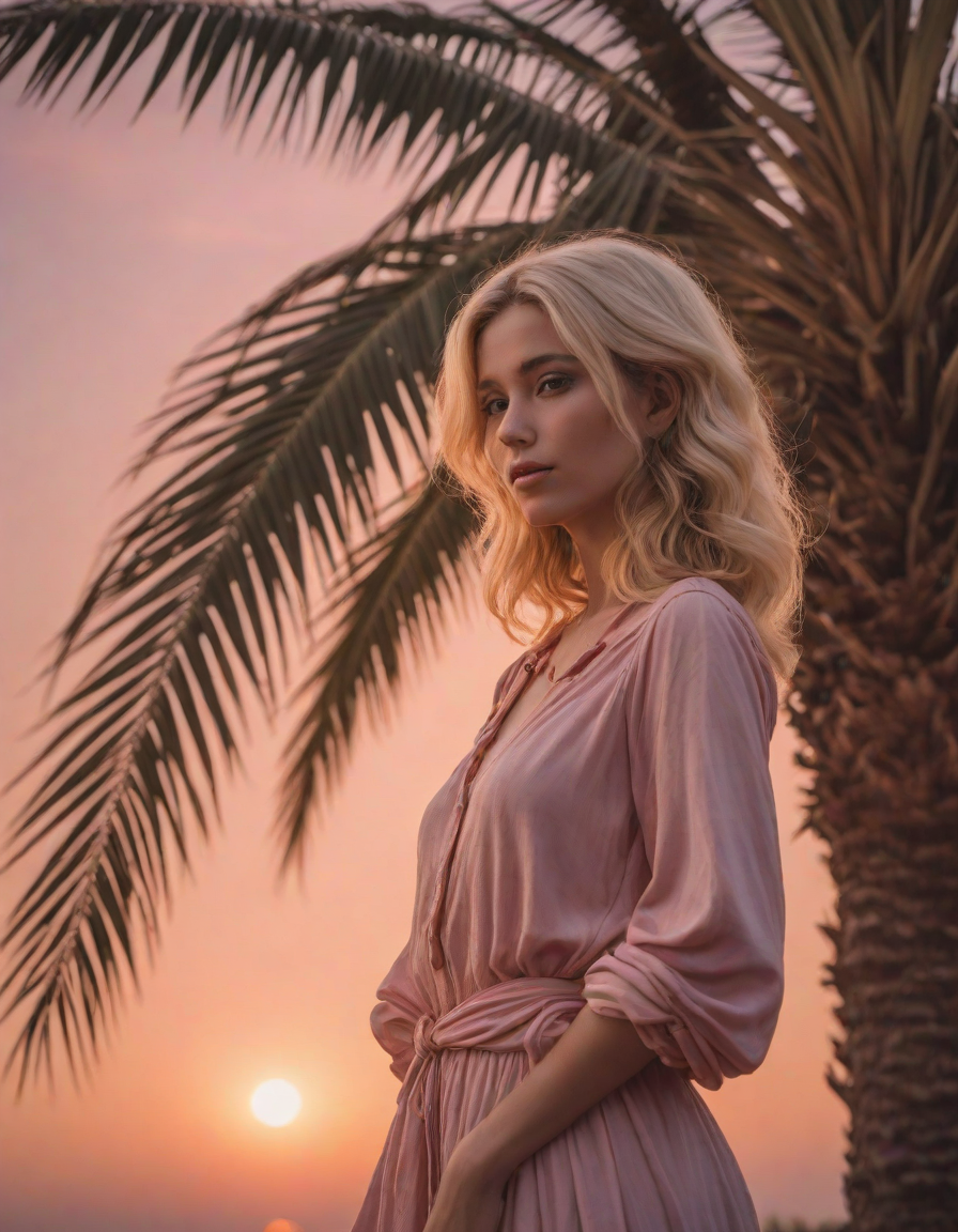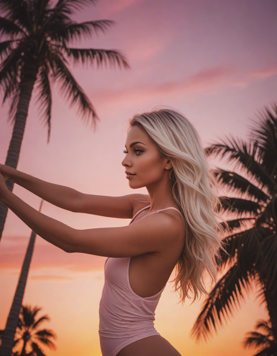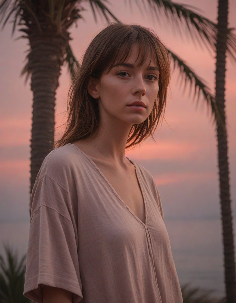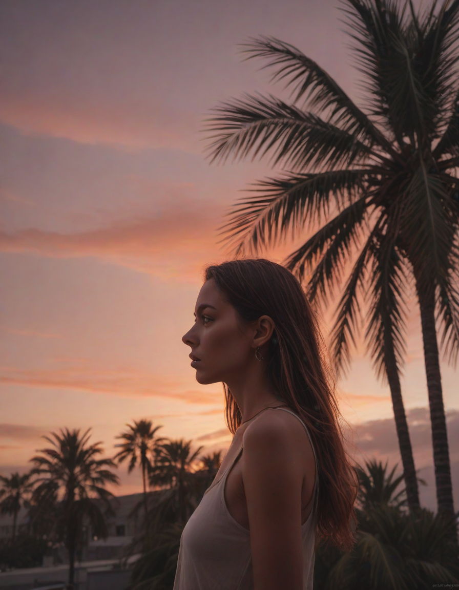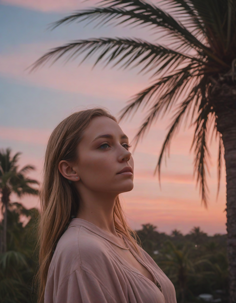 Eyes unmoving, transfixed upon a soothingly swaying slender palm tree silhouetted softly against a radiantly rosy sunrise colored sky stretched expansively beyond her sightline