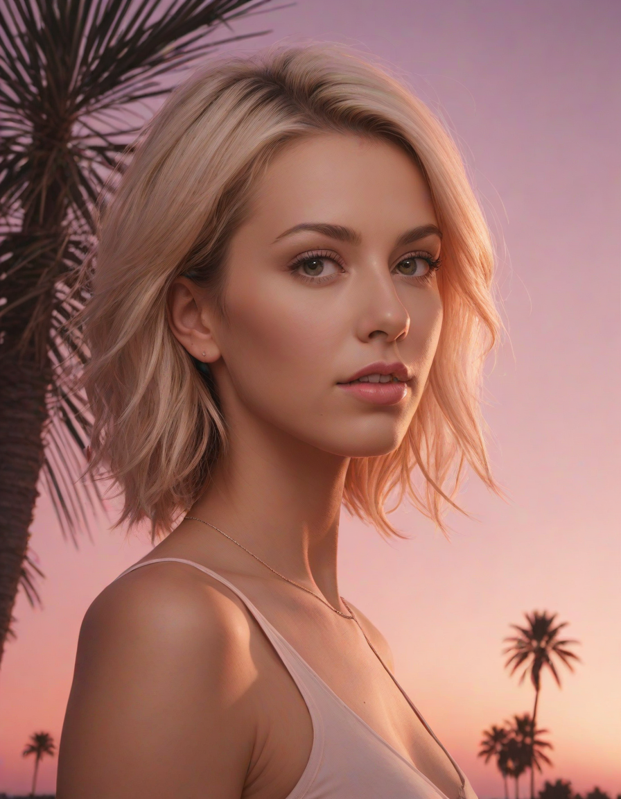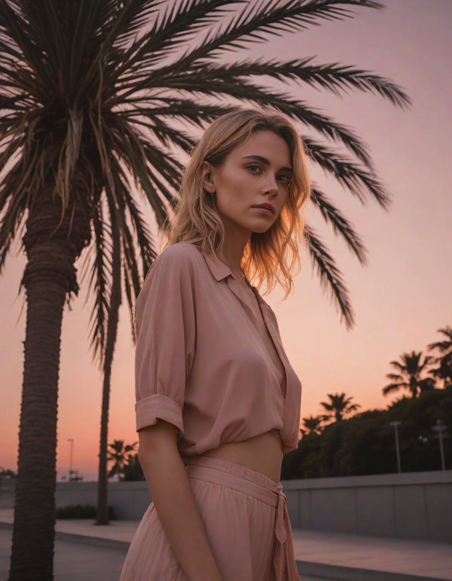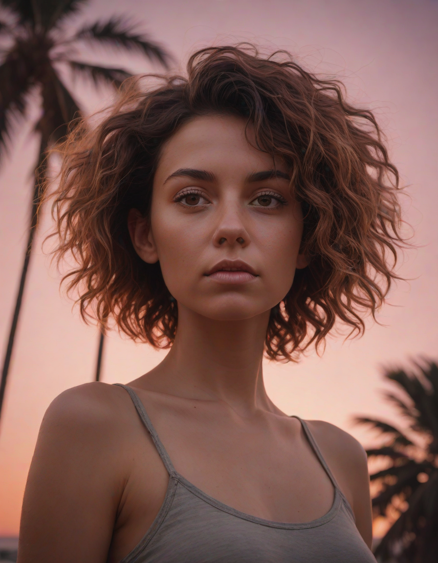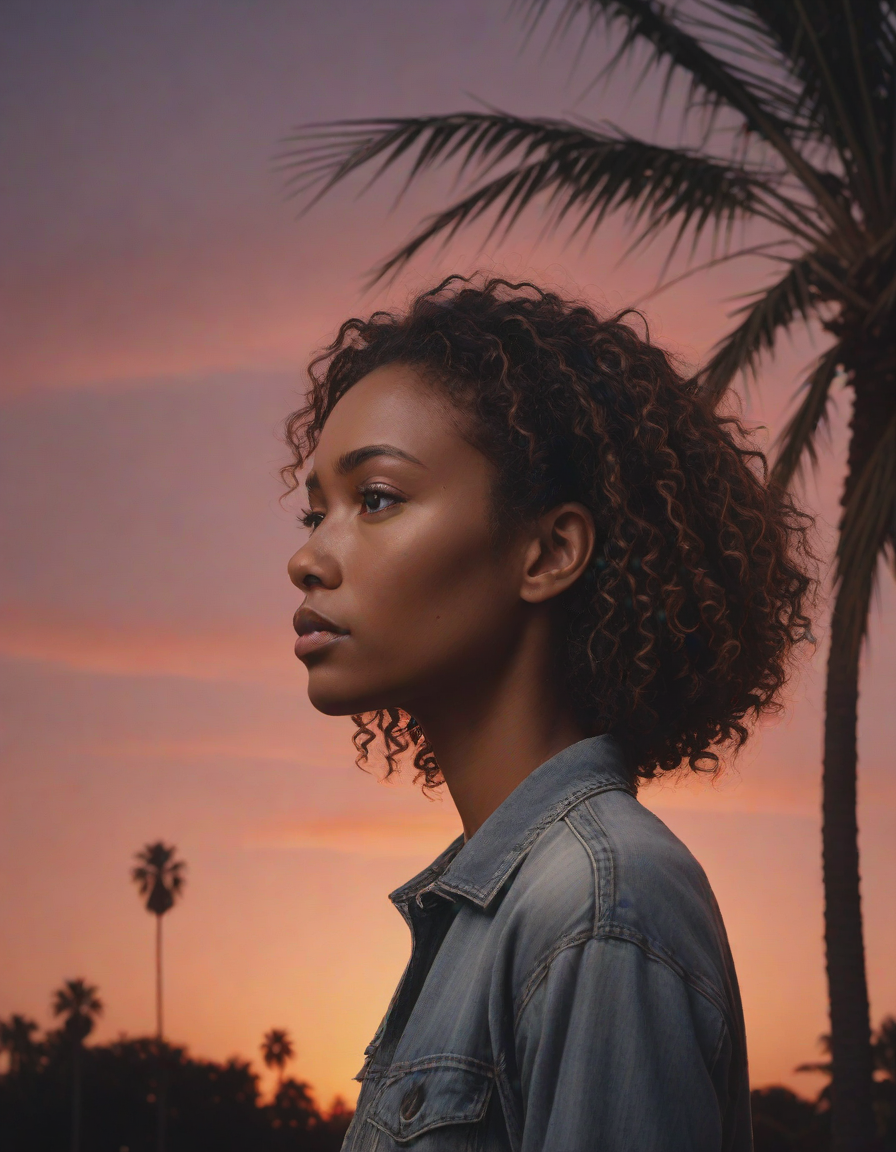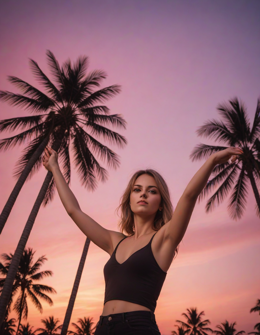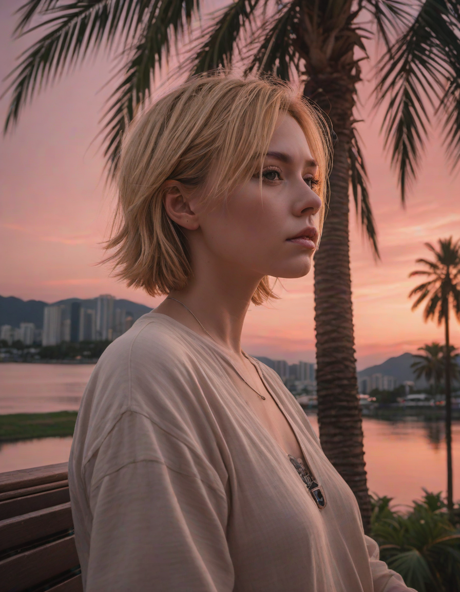 Eyes unmoving, transfixed upon a soothingly swaying slender palm tree silhouetted softly against a radiantly rosy sunrise colored sky stretched expansively beyond her sightline