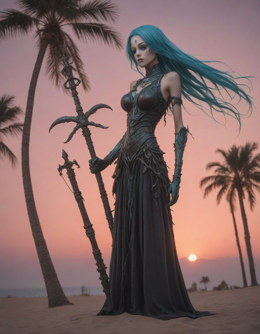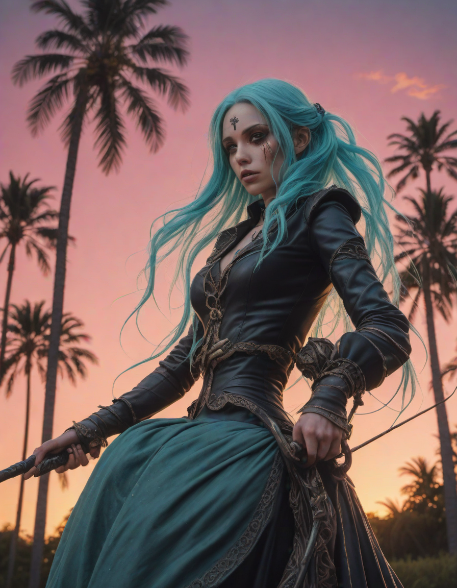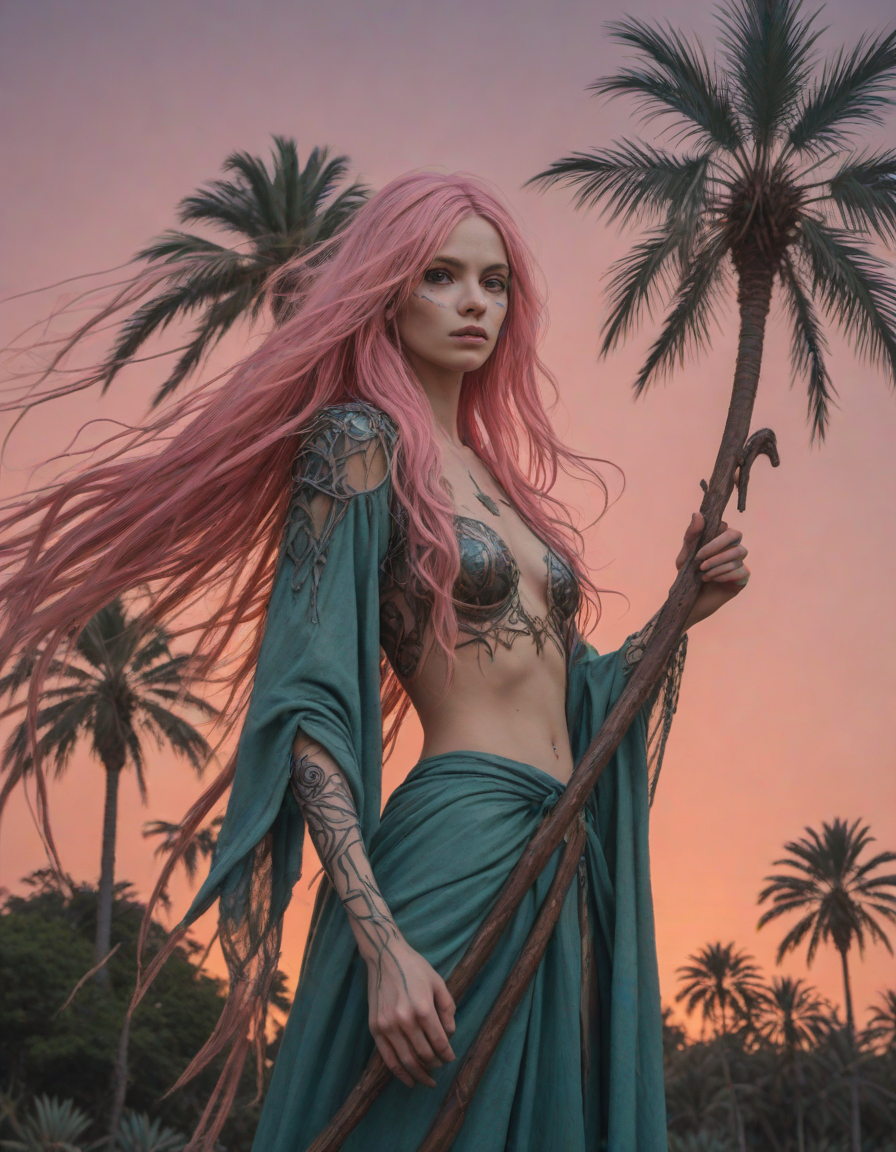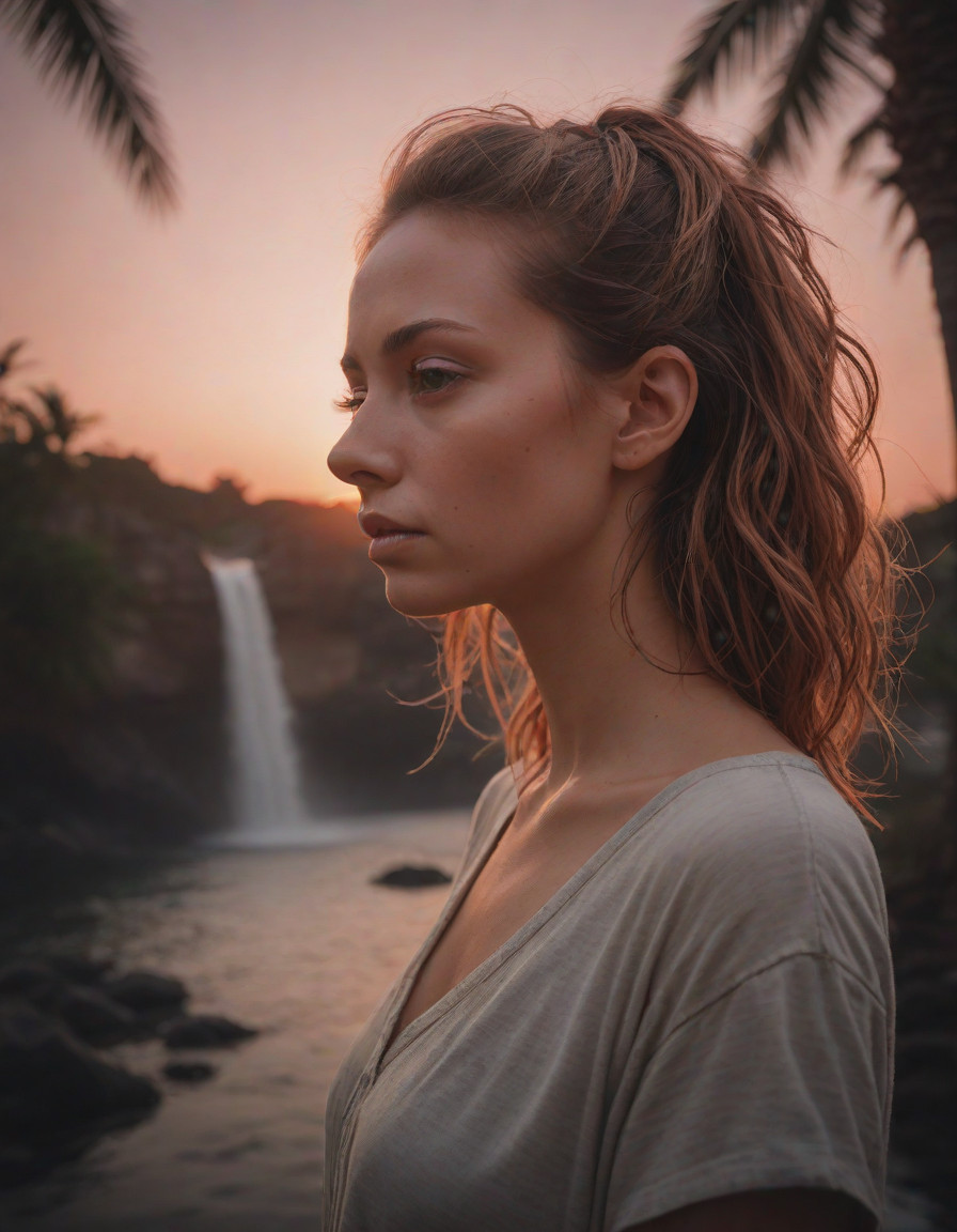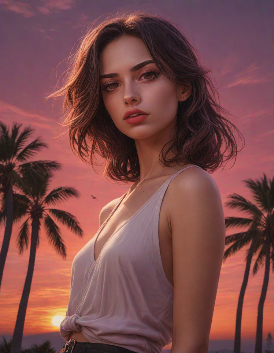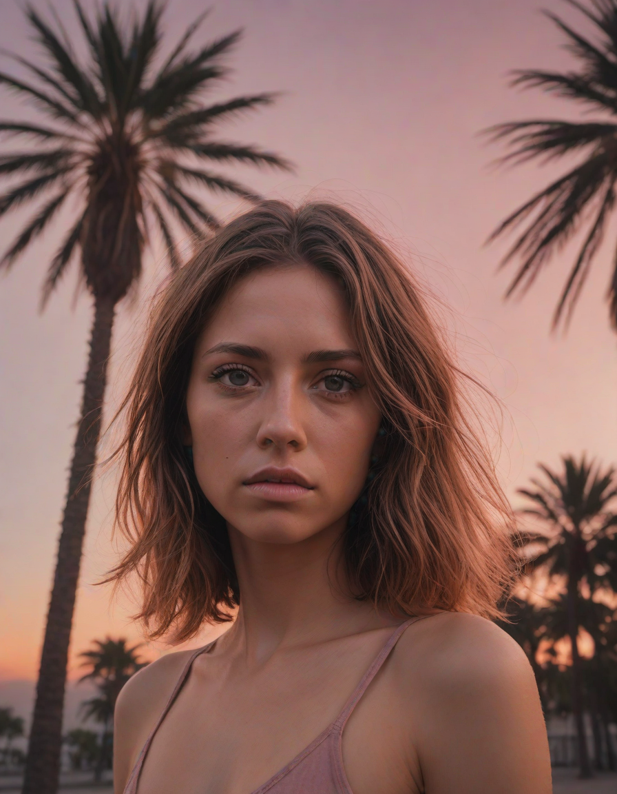 Eyes unmoving, transfixed upon a soothingly swaying slender palm tree silhouetted softly against a radiantly rosy sunrise colored sky stretched expansively beyond her sightline
