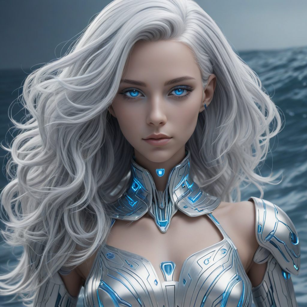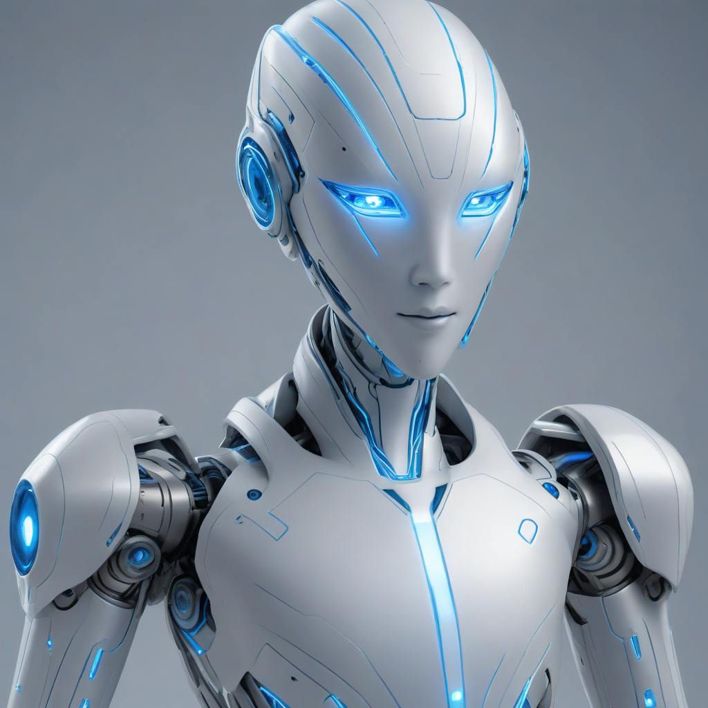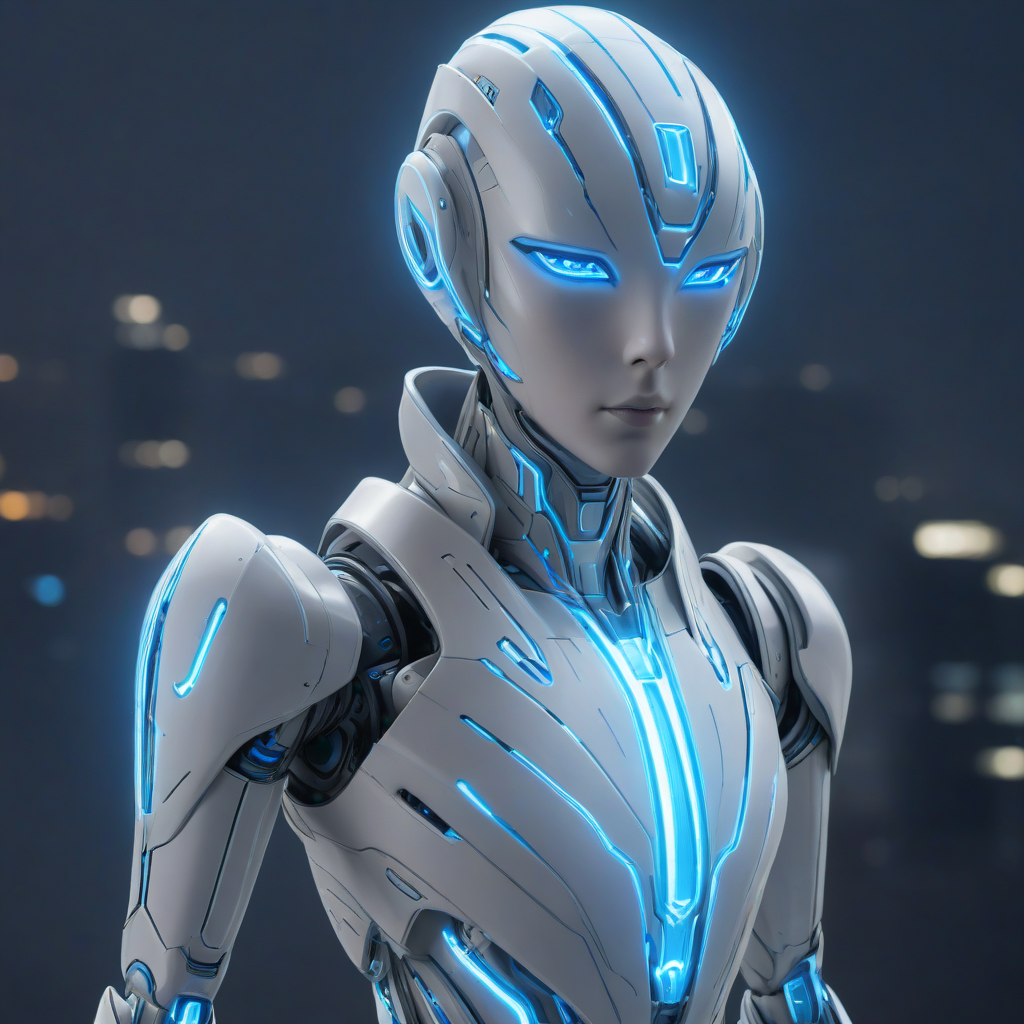 Zephyr, a sleek silver and white humanoid android with glowing blue accents, angular features, short white hair, and bright intelligent eyes, highly detailed