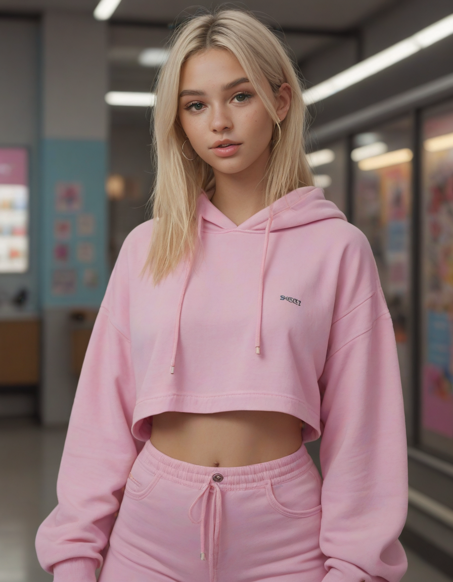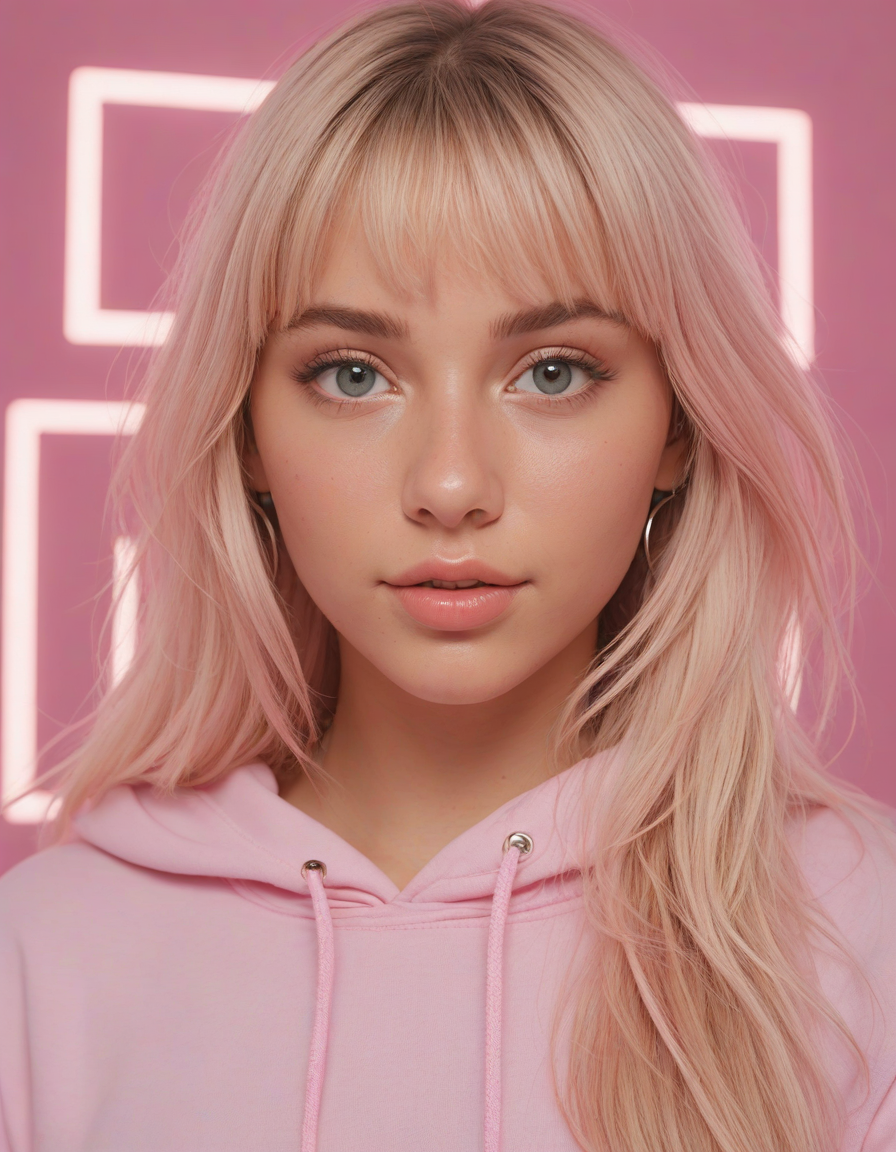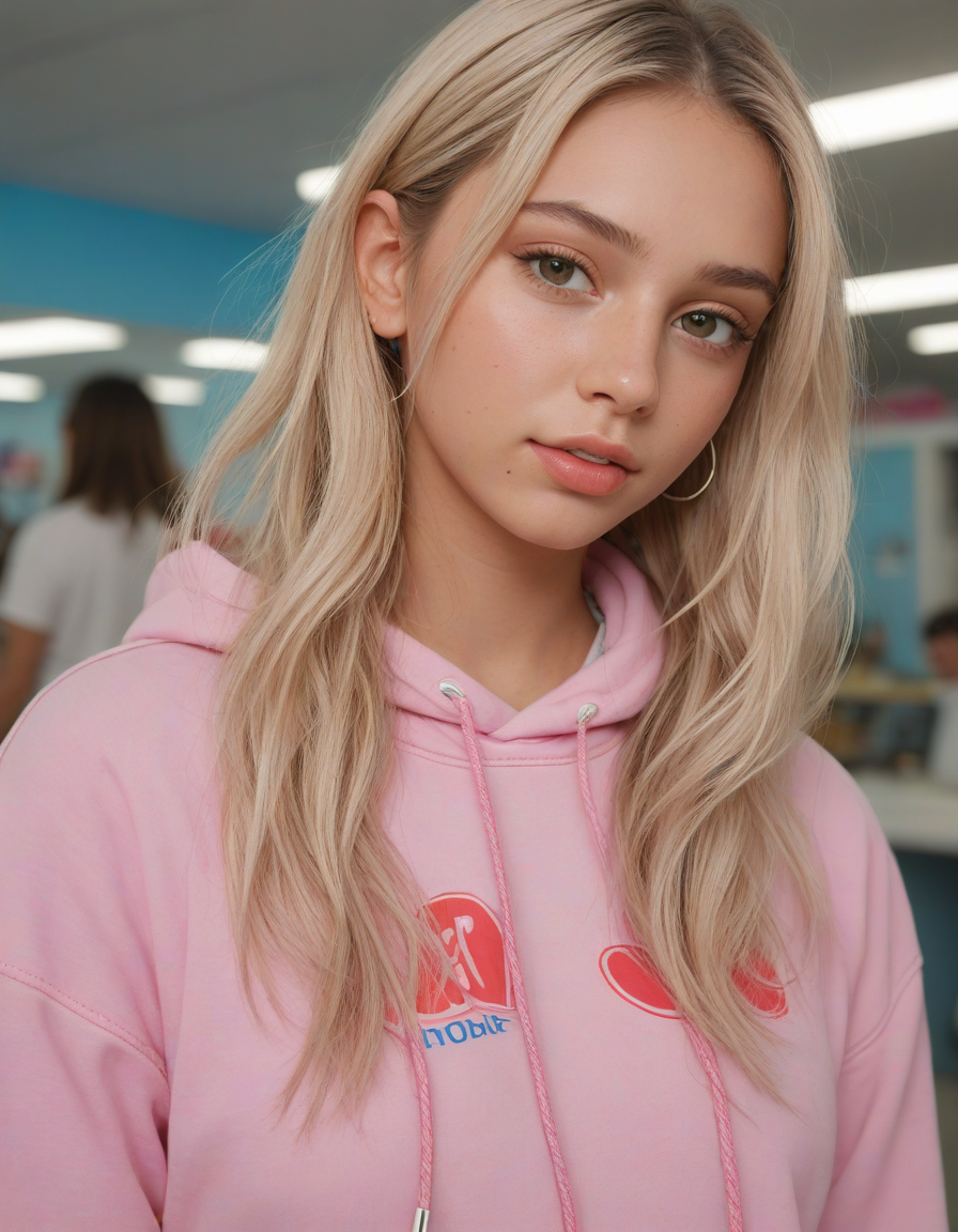 oval face shape, almond-shaped eyes, voluminous lashes, slightly arched eyebrows, narrow nasal bridge, rounded nose tip, symmetrical nostrils, full lips, pronounced cupid's bow, slightly fuller lower lip, defined cheekbones, rounded chin, smooth complexion, softly contoured jawline, balanced facial proportions, symmetrical features, gently curved eyelids, soft brow ridge, harmonious cheek to jawline transition, subtle philtrum, delicate ear lobes, straight blonde hair, clear skin, hooded eyelids, light pink lip color, slightly pouty expression, casual pose with hand on face, slight head tilt, indoor lighting, Light blue irises, Medium-thickness eyebrows, Softly angled eyebrows, A hint of freckles across the nose and cheeks, Natural makeup, Gentle frown lines between the eyebrows, Soft nasolabial folds, Smooth forehead, Subtle dimple on the chin, Clear facial contour without distinct shadows, Even skin tone with a hint of natural pink undertones, Slightly rosy cheeks, Tapered jawline, Fine hair texture with gentle waves, Youthful appearance with soft facial features