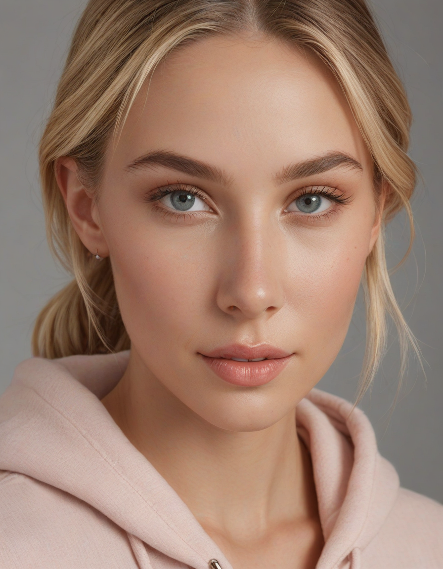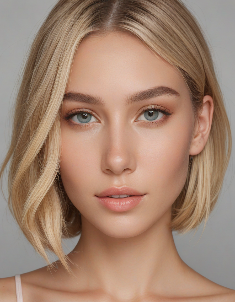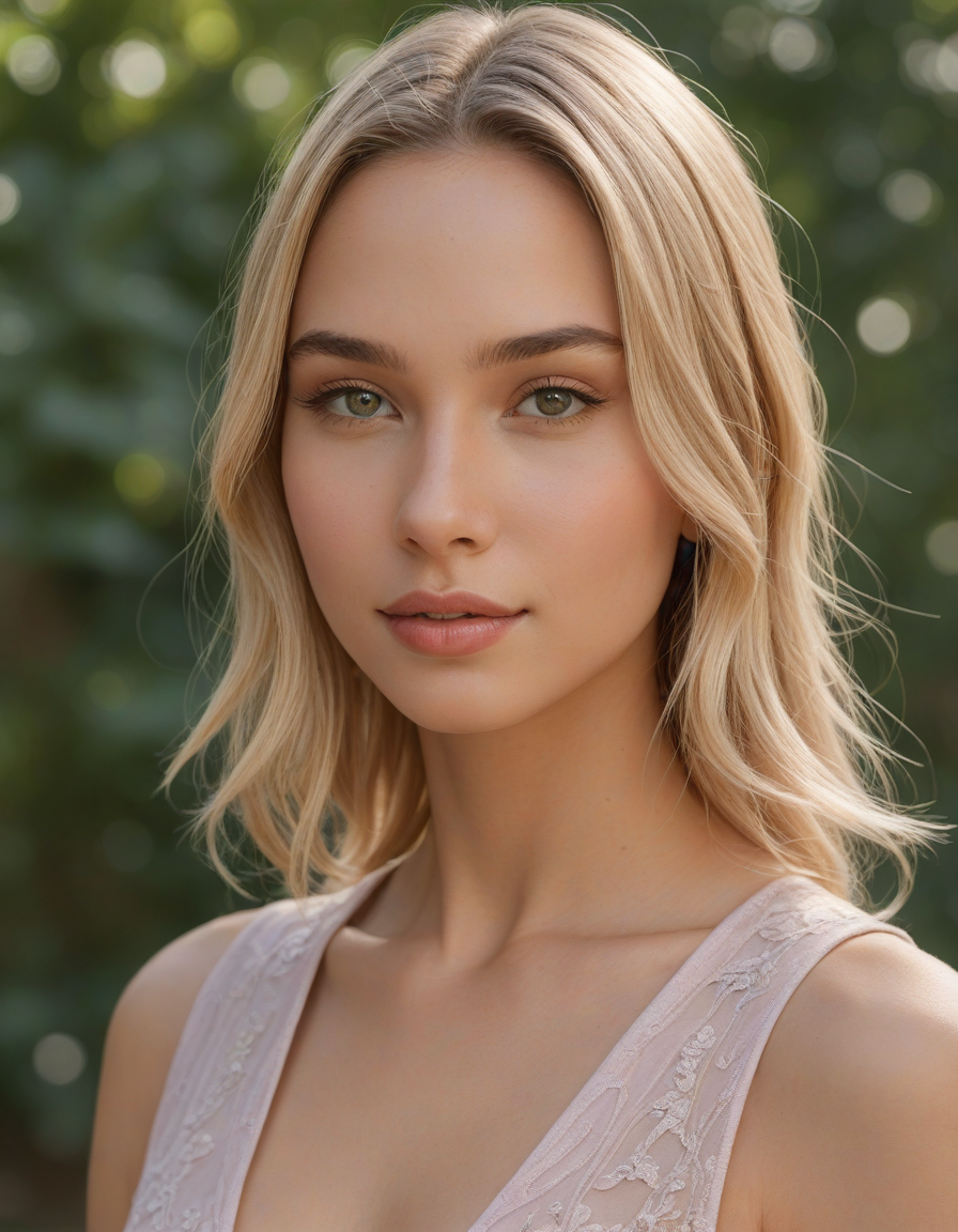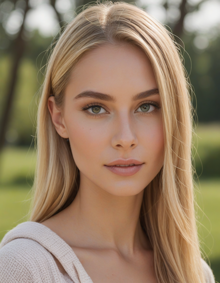 Neutral: Heart-shaped face, captivatingly wide almond eyes with medium-thick lashes, gently arched eyebrows that balance straightness with a soft peak, a medium nasal bridge leading to a subtly contoured nose tip, symmetrical nostrils that hint at precision, lips that marry fullness with refinement, a cupid's bow that's delicately defined, a harmonious balance between the upper and lower lips, cheekbones that rise to prominence with a natural grace, a chin that blends roundness with definition, skin that glows with a smooth but naturally textured finish, a jawline that softly contours into the neck, facial proportions that strike a perfect chord between symmetry and unique charm, eyelids that suggest depth with a slight curve, a brow ridge that complements the facial structure without overpowering, cheeks that transition smoothly into a well-defined jawline, a philtrum that marks the path to a smile full of stories, ear lobes that gently frame the face, hair that cascades in soft, sun-kissed waves of light brown, skin that radiates health under a subdued light, eyelids that fold softly over eyes bright with a mix of light green and blue hues, lips painted in a soft peach blush, an expression that flirts with both joy and serenity, a pose that's both relaxed and poised, with a gentle head tilt that invites conversation, ambient lighting that whispers of golden hour, eyebrows that find a middle ground in thickness, with a natural curve that's neither too sharp nor too flat, a complexion clear yet kissed by the faintest sprinkling of freckles across the bridge of the nose, makeup that enhances without overshadowing, a face that shows life's joy through subtle smile lines and soft folds, a forehead that speaks of open skies, and a chin that carries a hint of a dimple as if harboring a secret smile, facial contours that play with light and shadow to reveal the depth of natural beauty, skin tone that's evenly kissed by the sun, cheeks blushing with the gentle rush of life, a jawline that gracefully narrows, merging strength with softness, hair texture that balances finesse with vitality, embodying a youthful spirit with an air of sophisticated allure