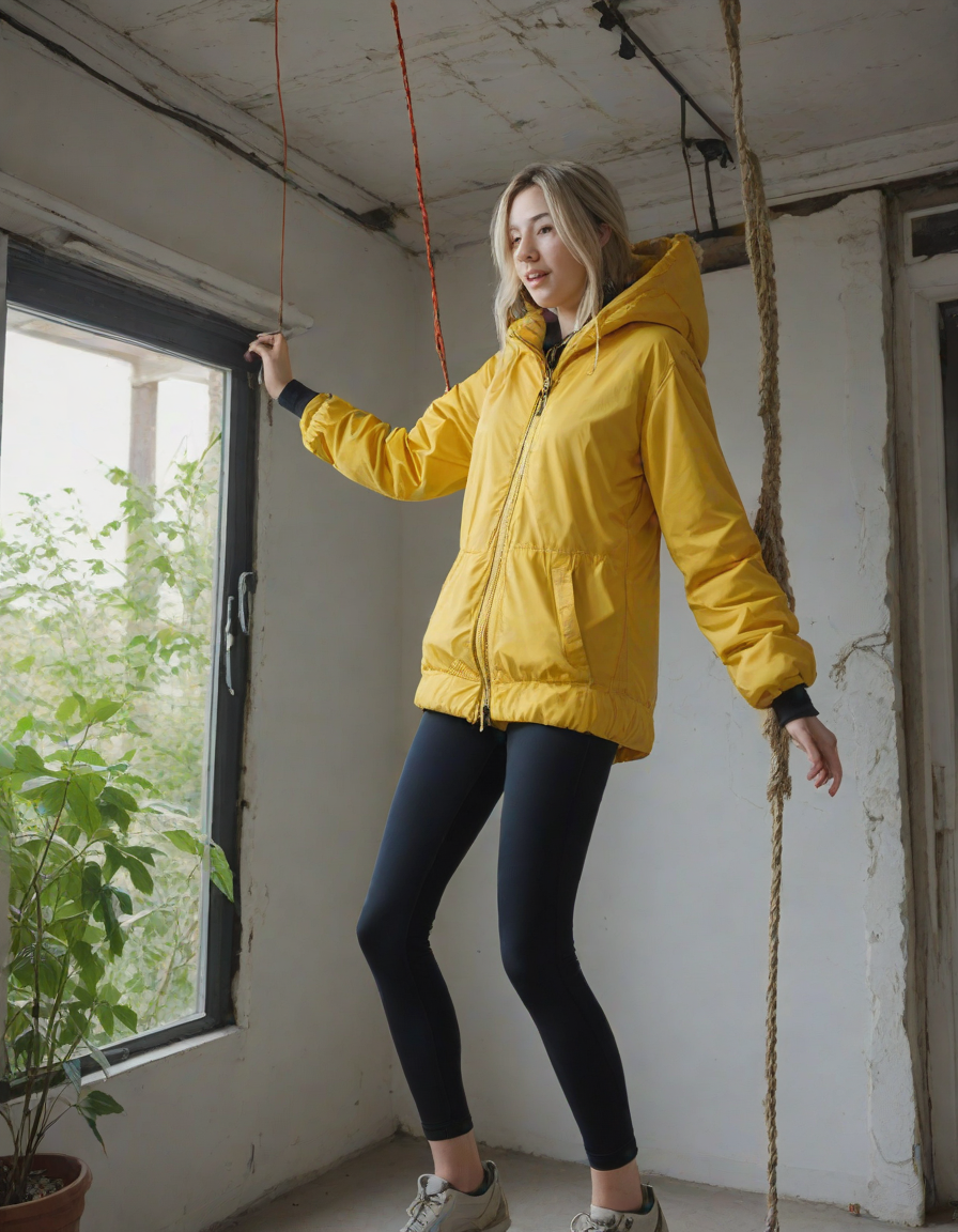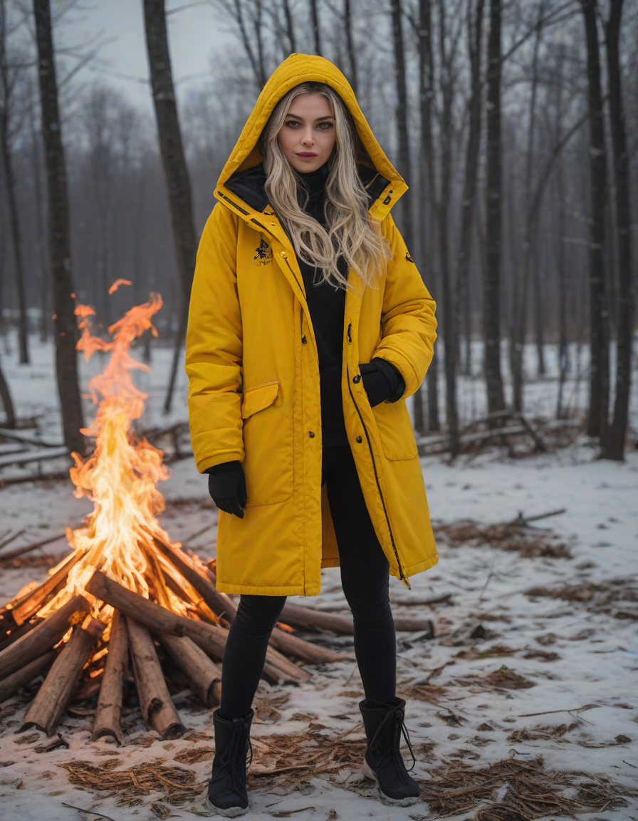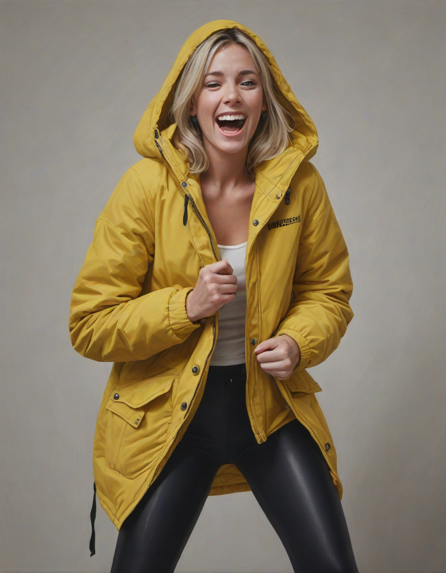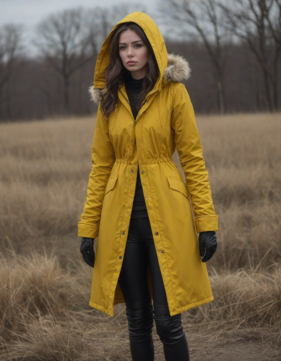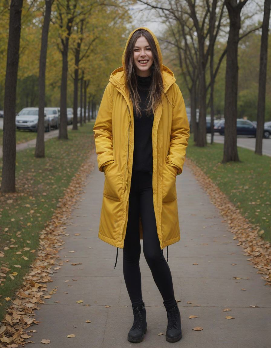 a lady wearing a hooded yellow parka and a pair of formfitting black leggings