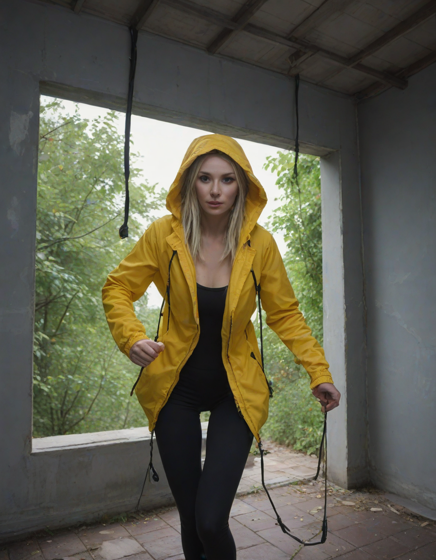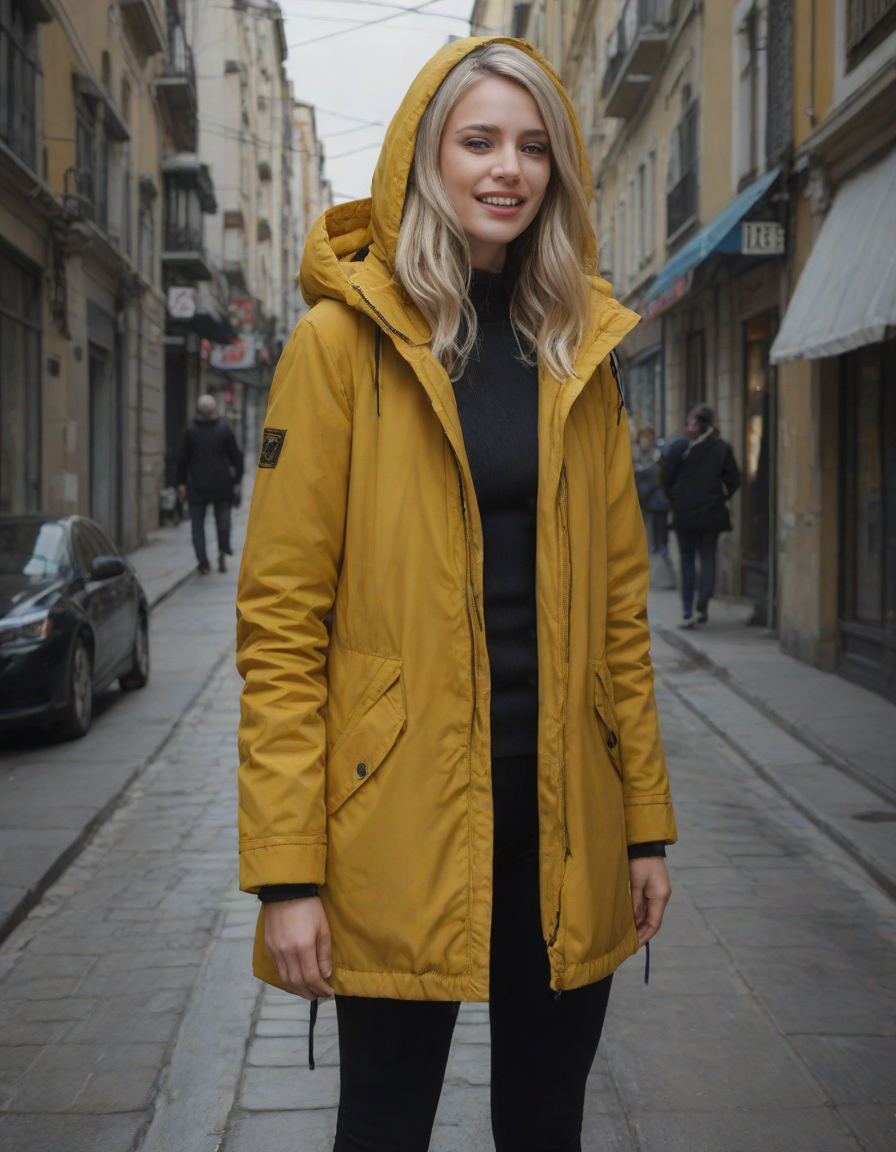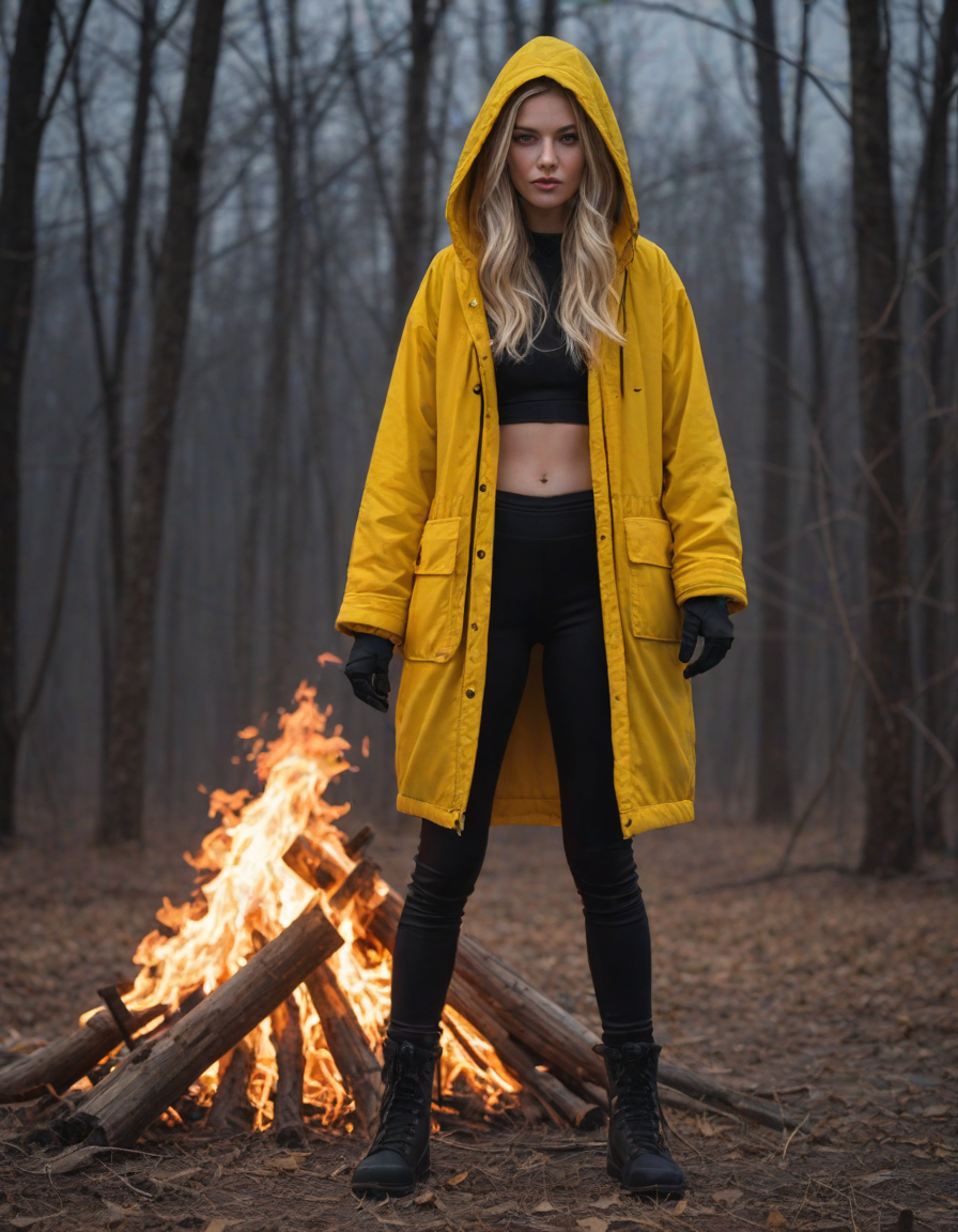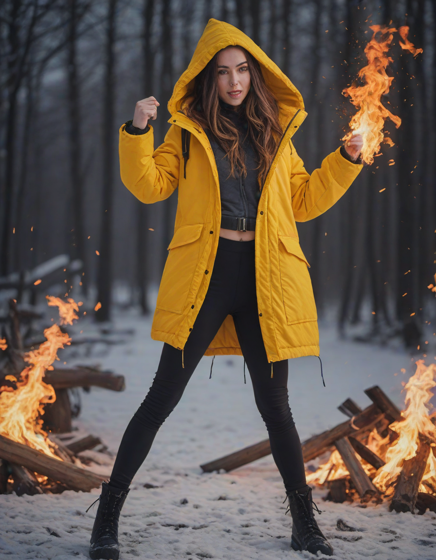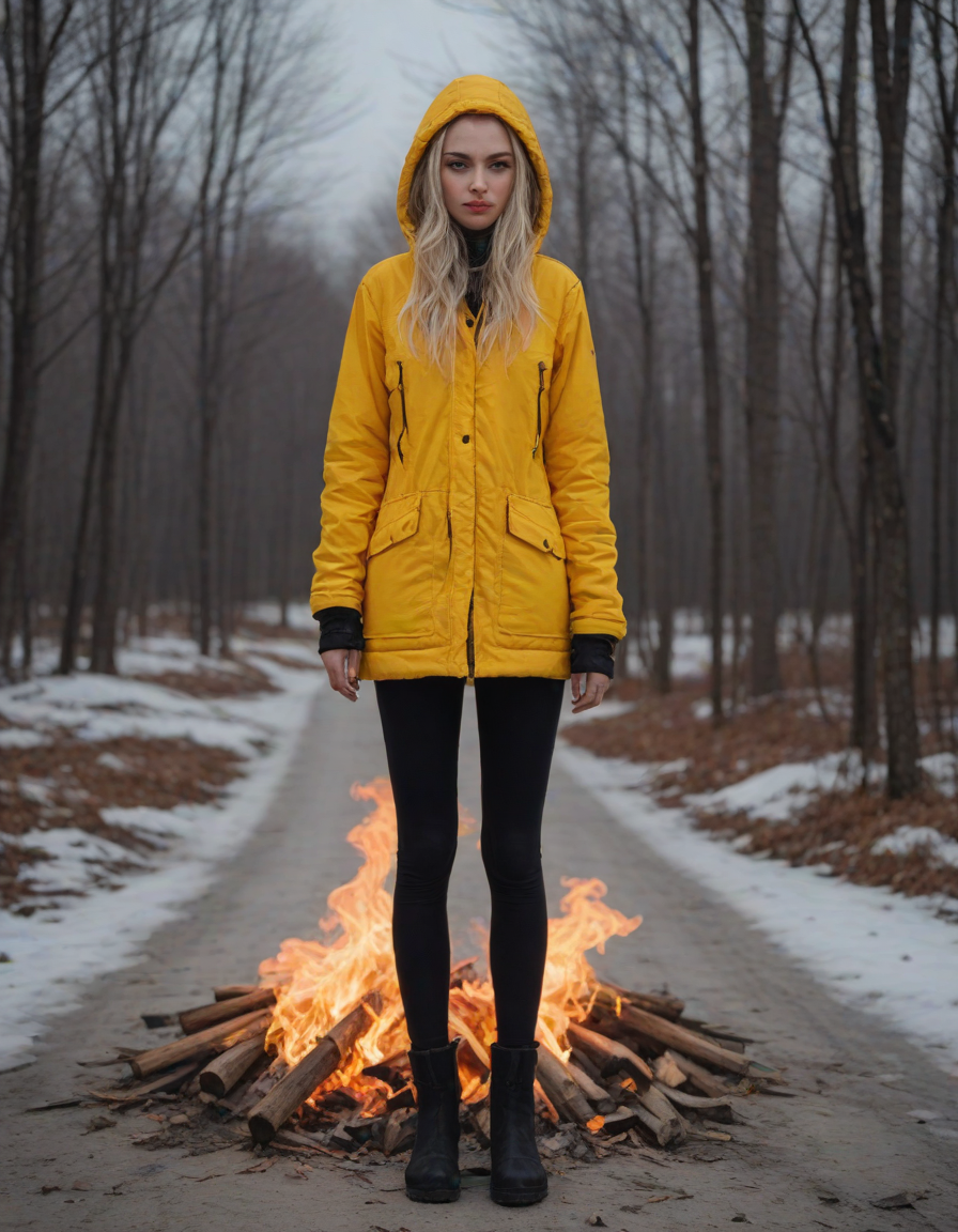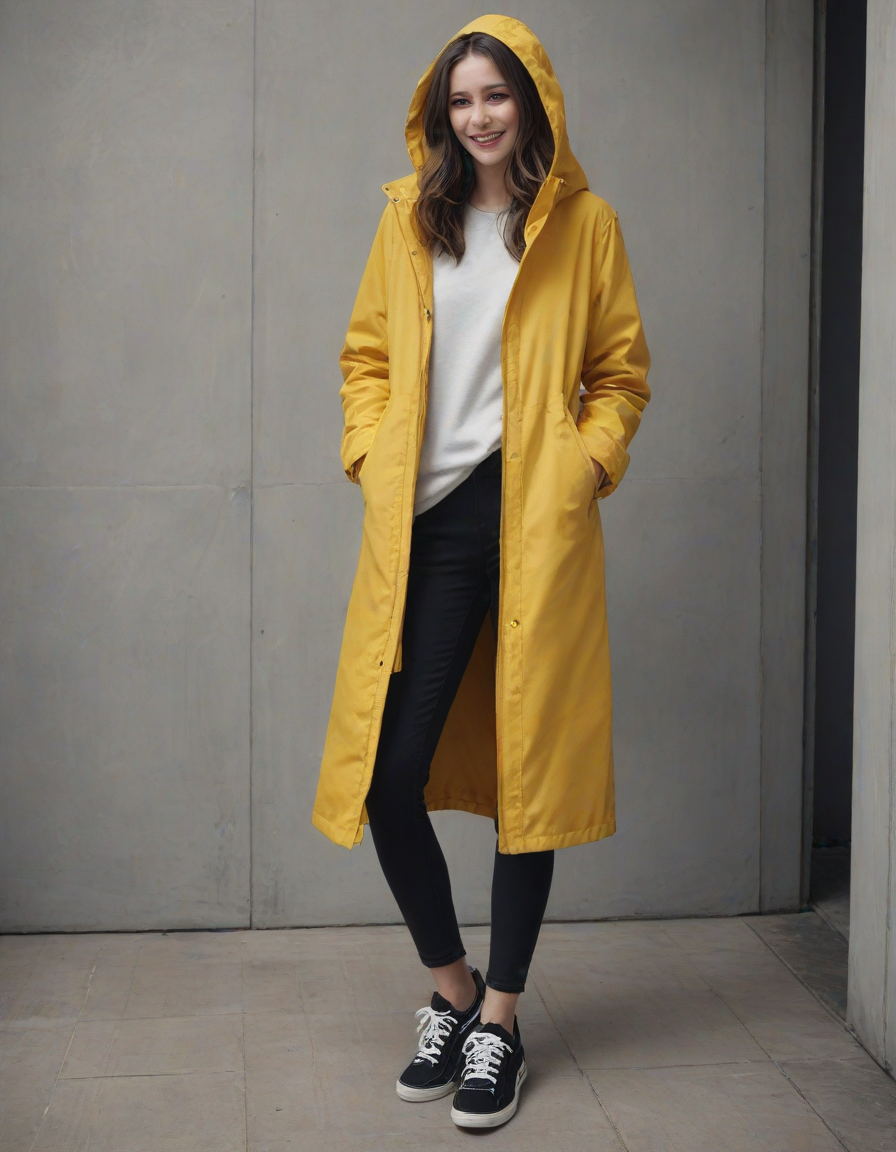 a lady wearing a hooded yellow parka and a pair of formfitting black leggings