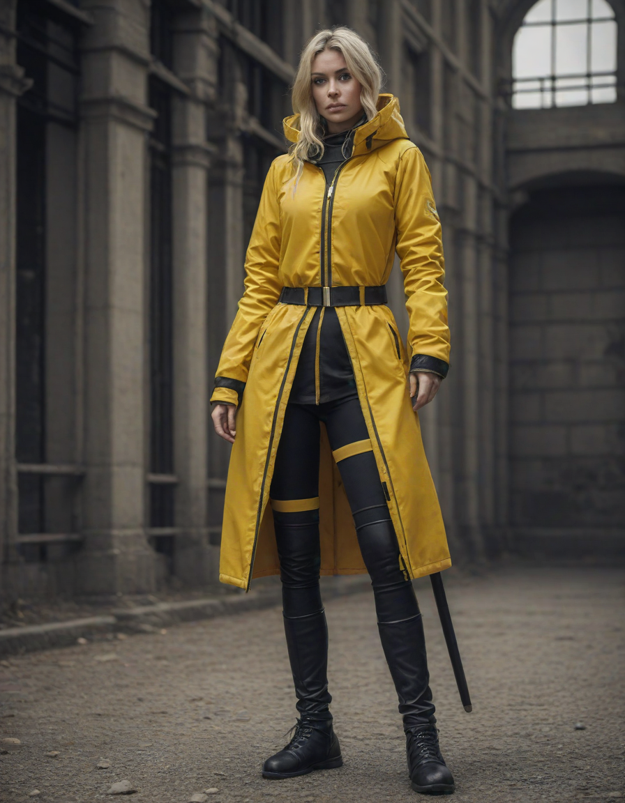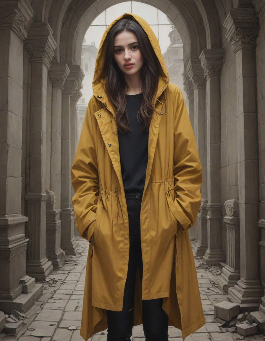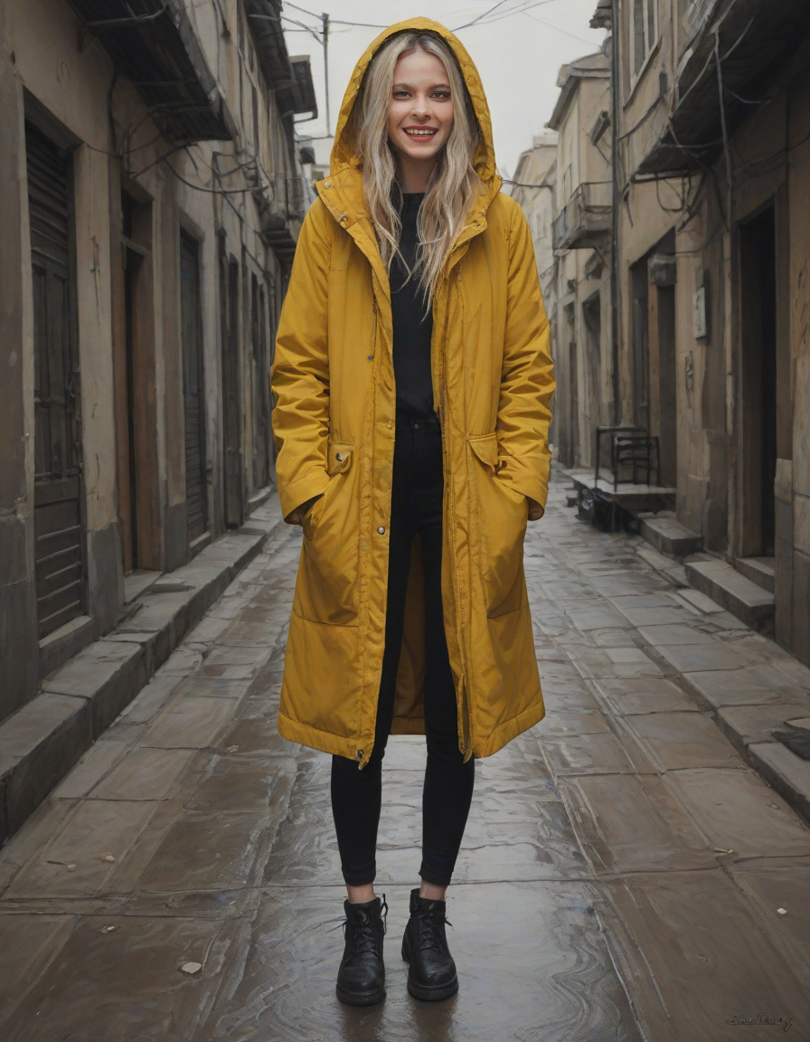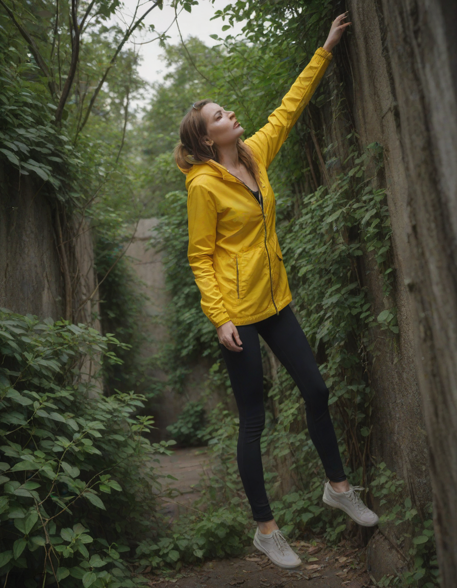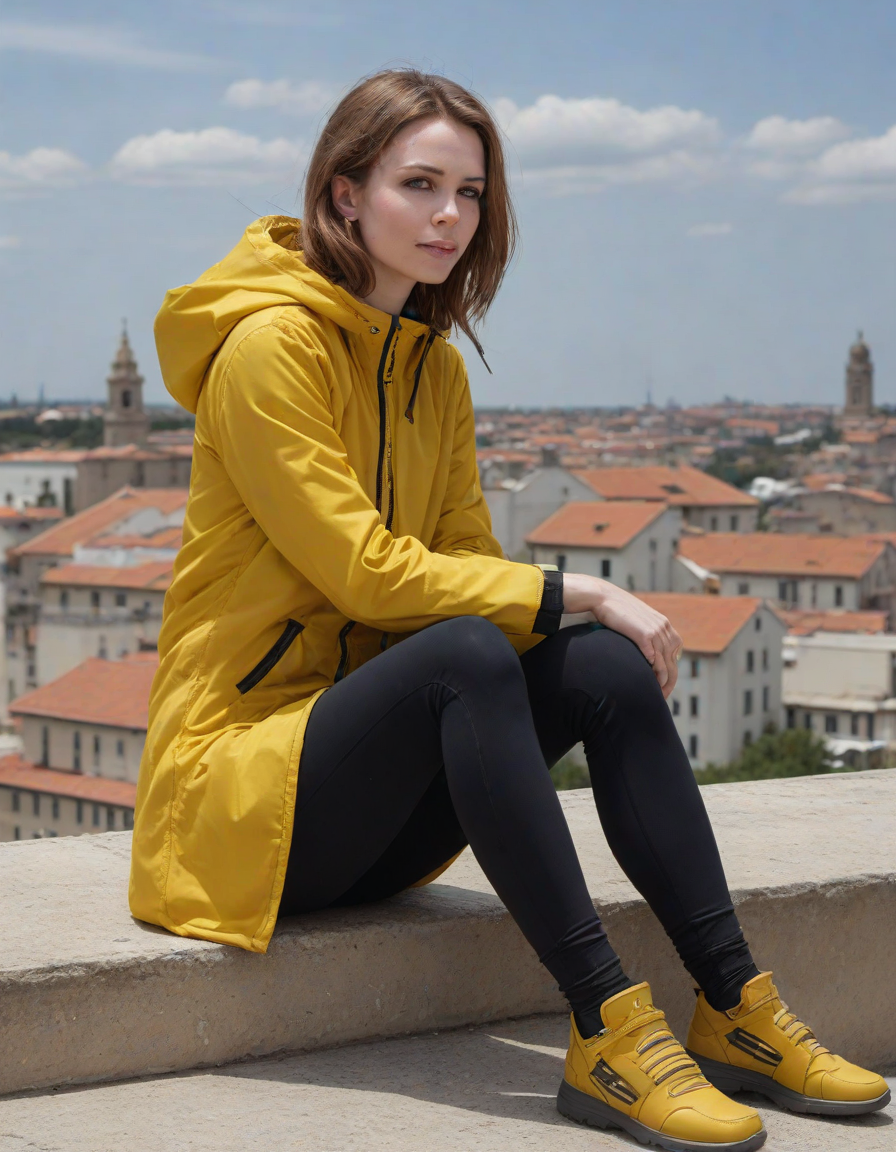 a lady wearing a hooded yellow parka and a pair of formfitting black leggings