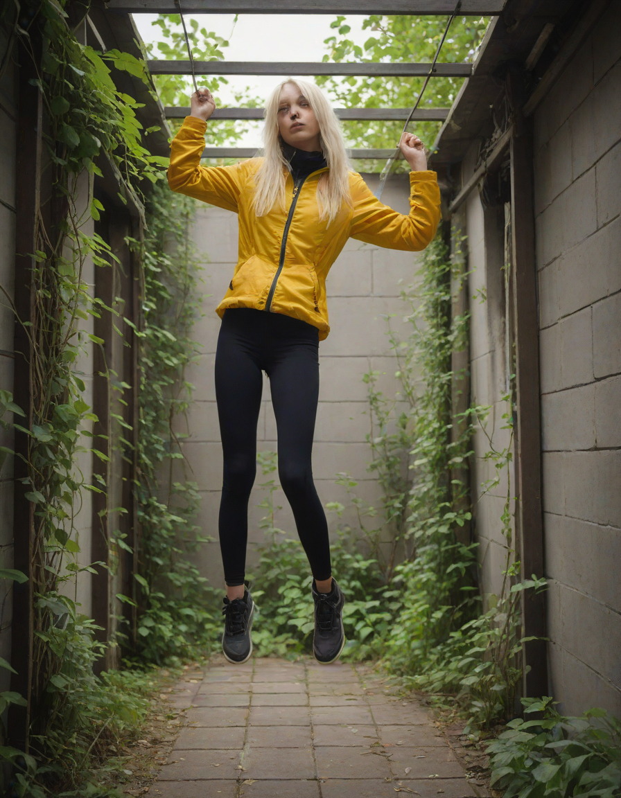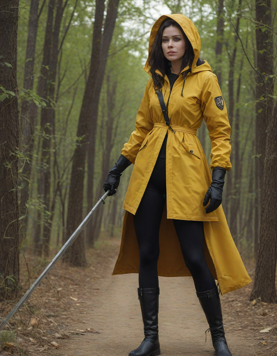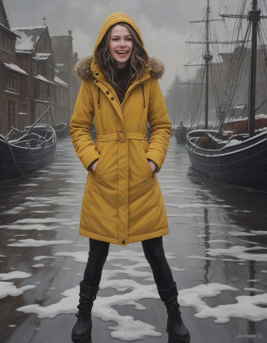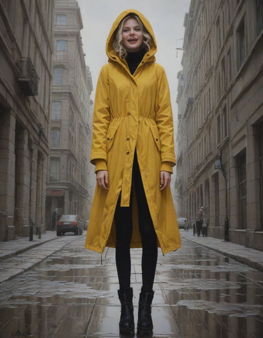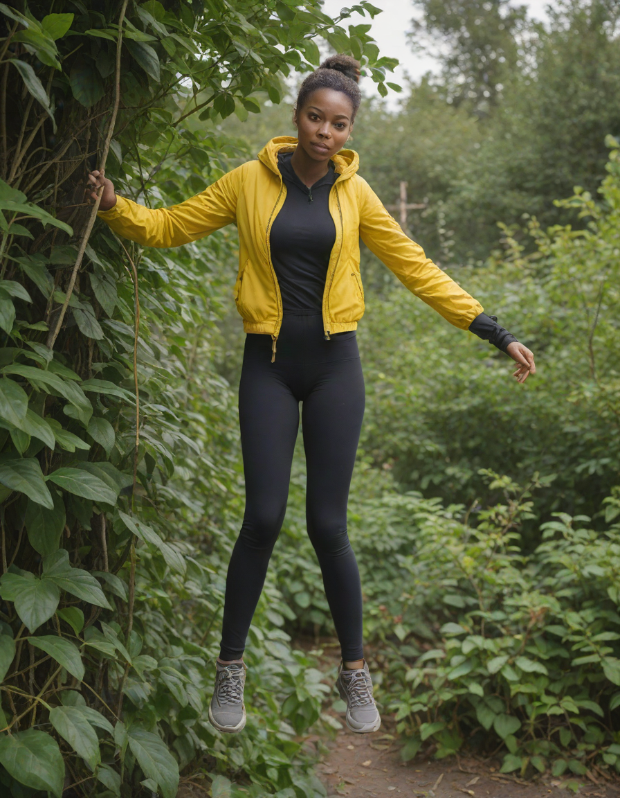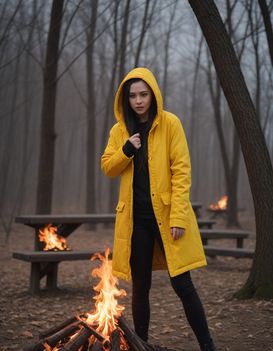 a lady wearing a hooded yellow parka and a pair of formfitting black leggings