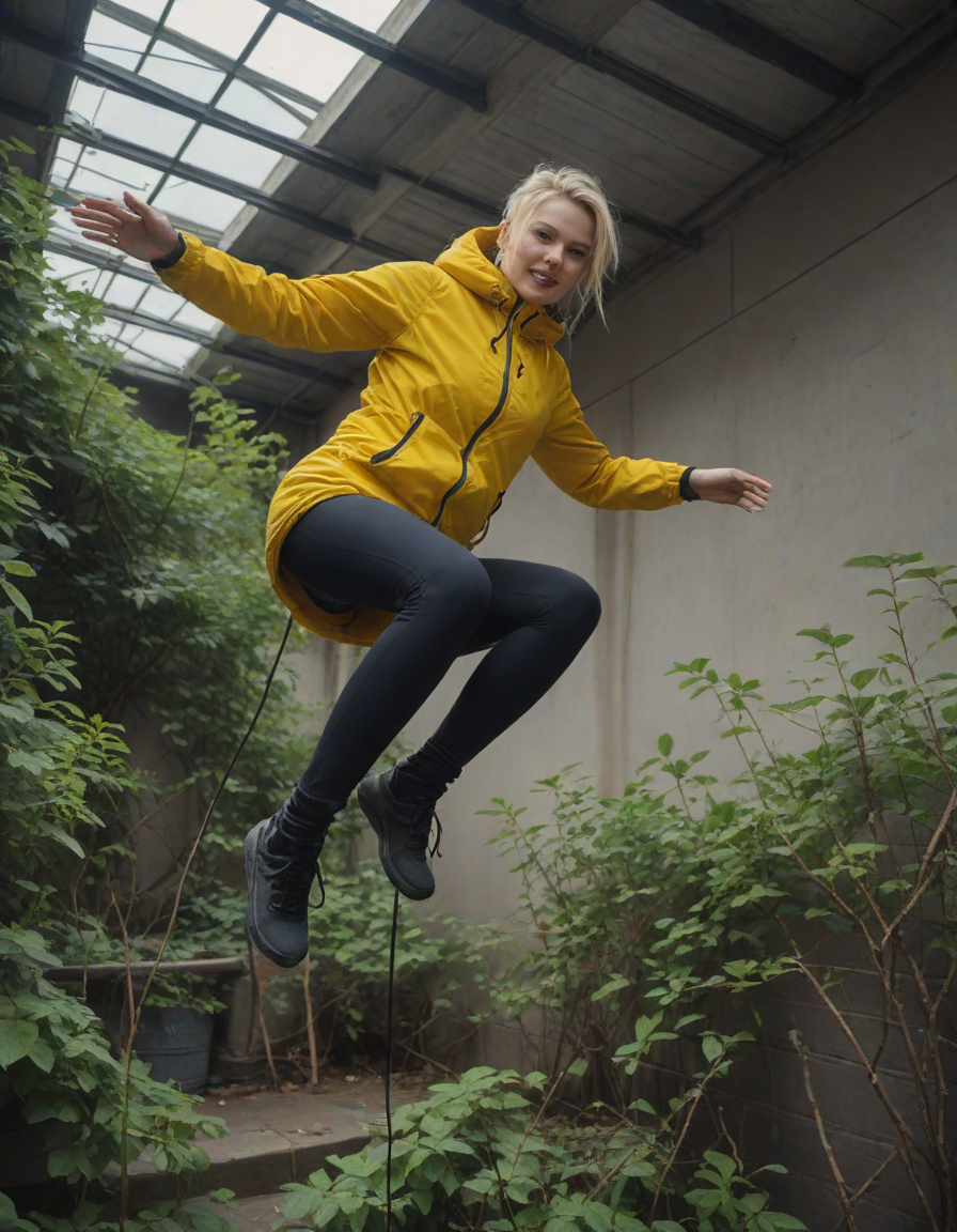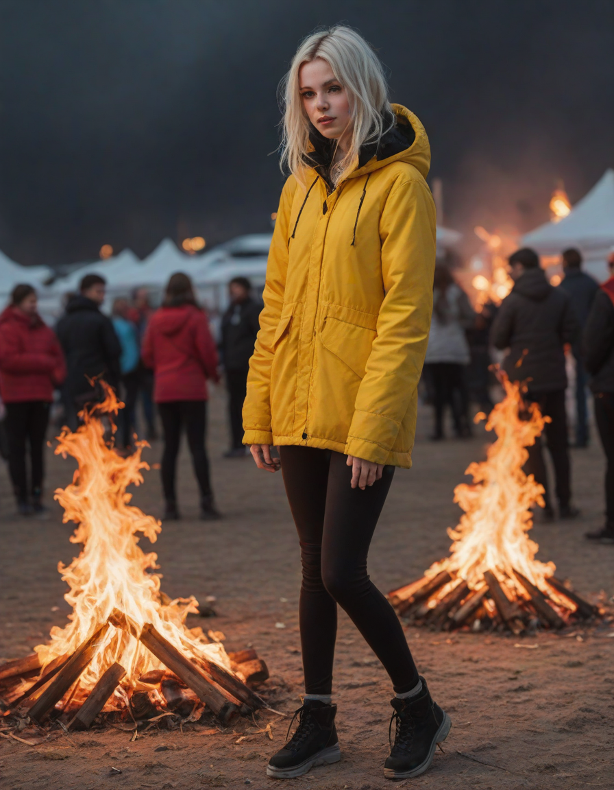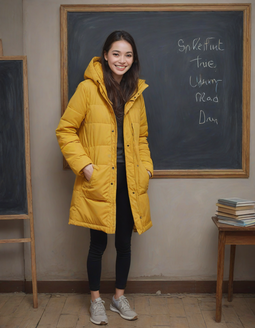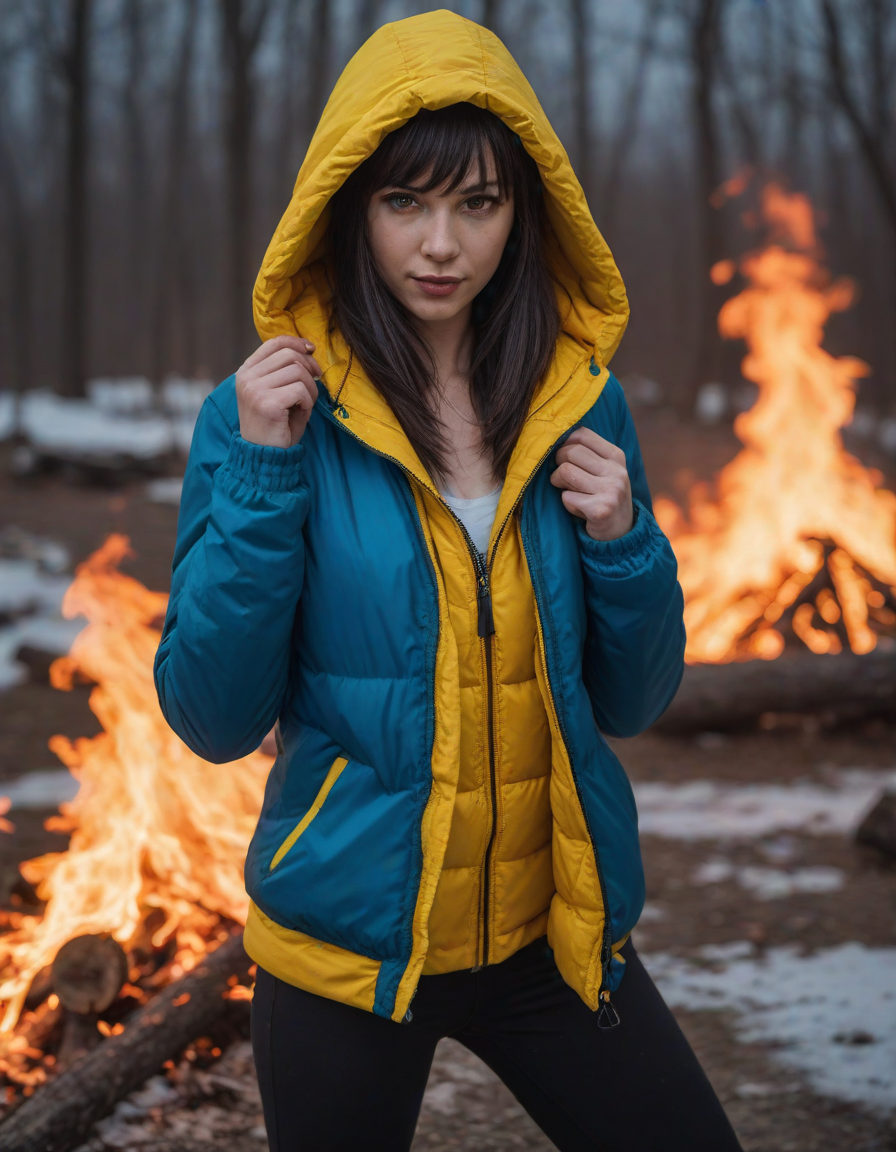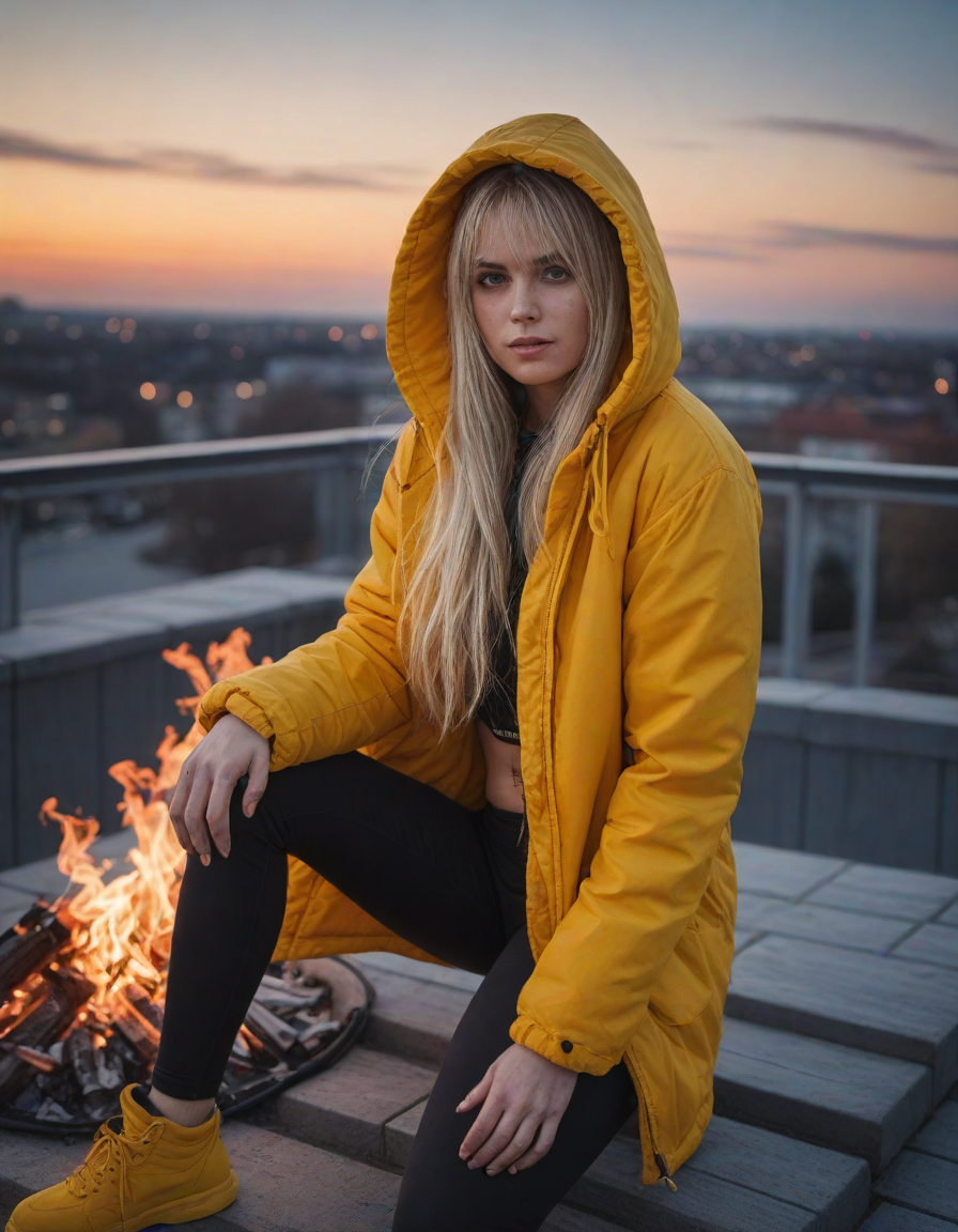 a lady wearing a hooded yellow parka and a pair of formfitting black leggings