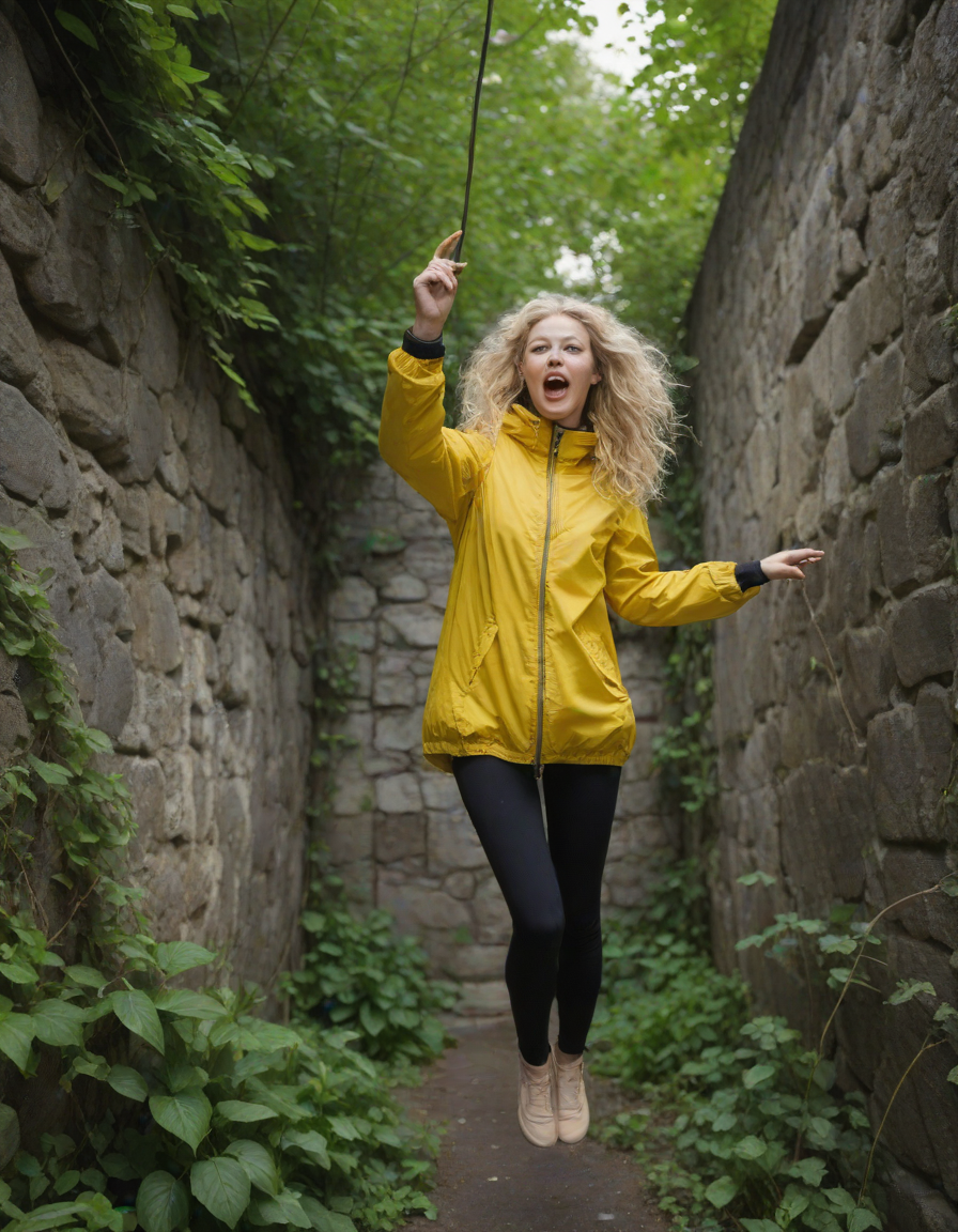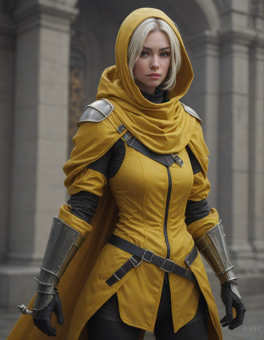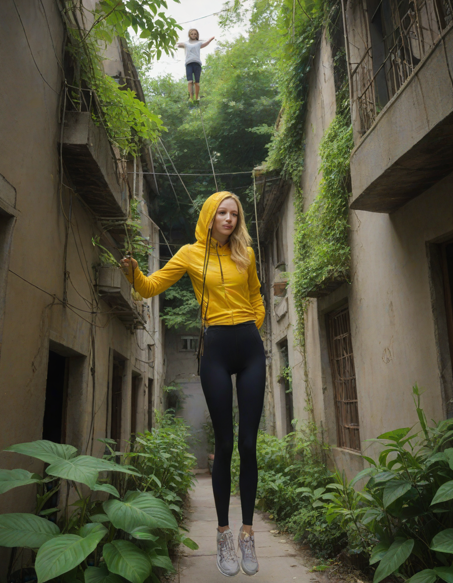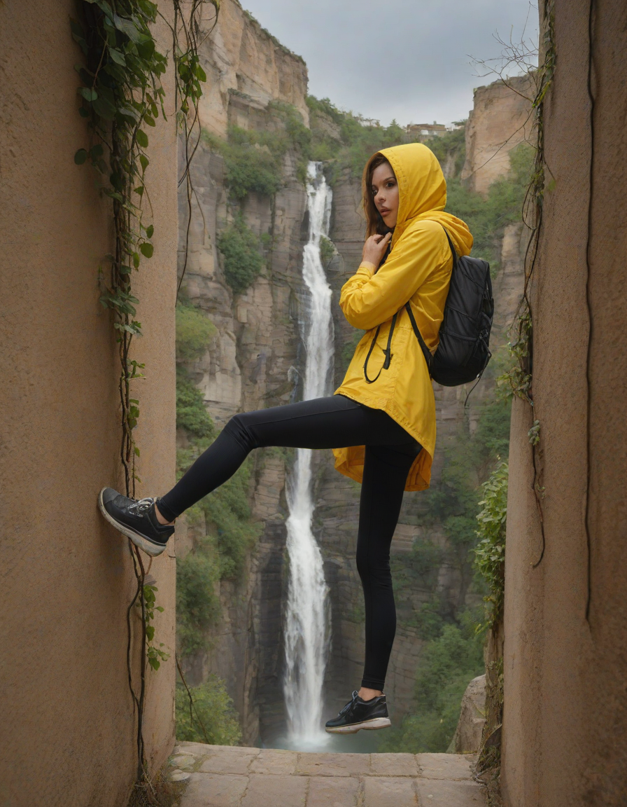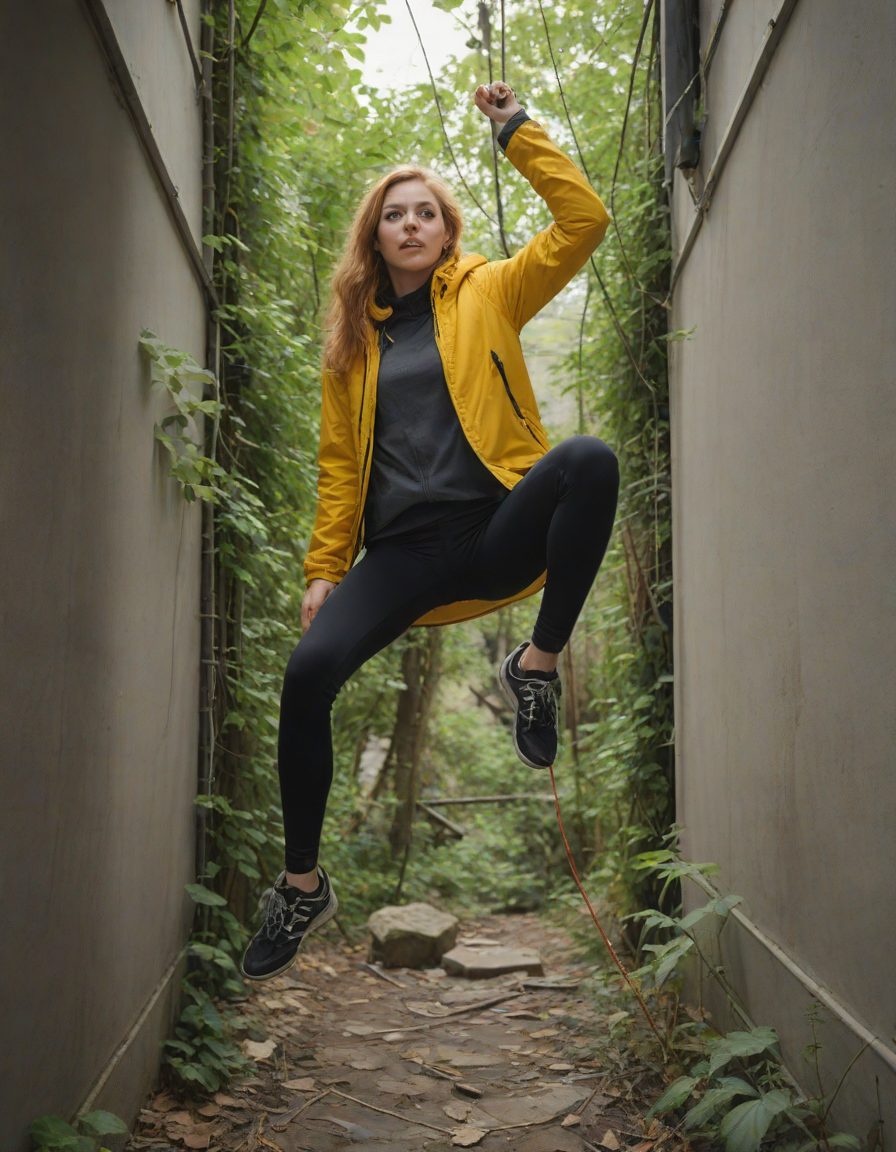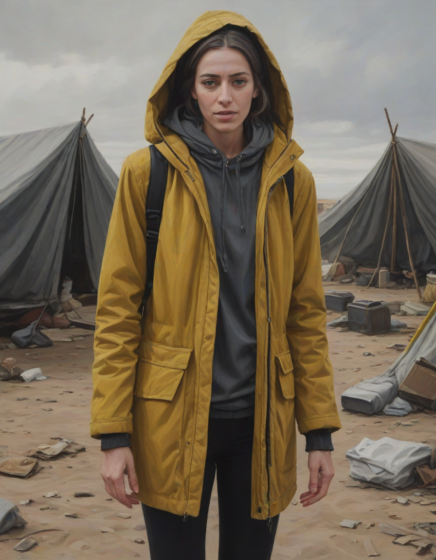 a lady wearing a hooded yellow parka and a pair of formfitting black leggings