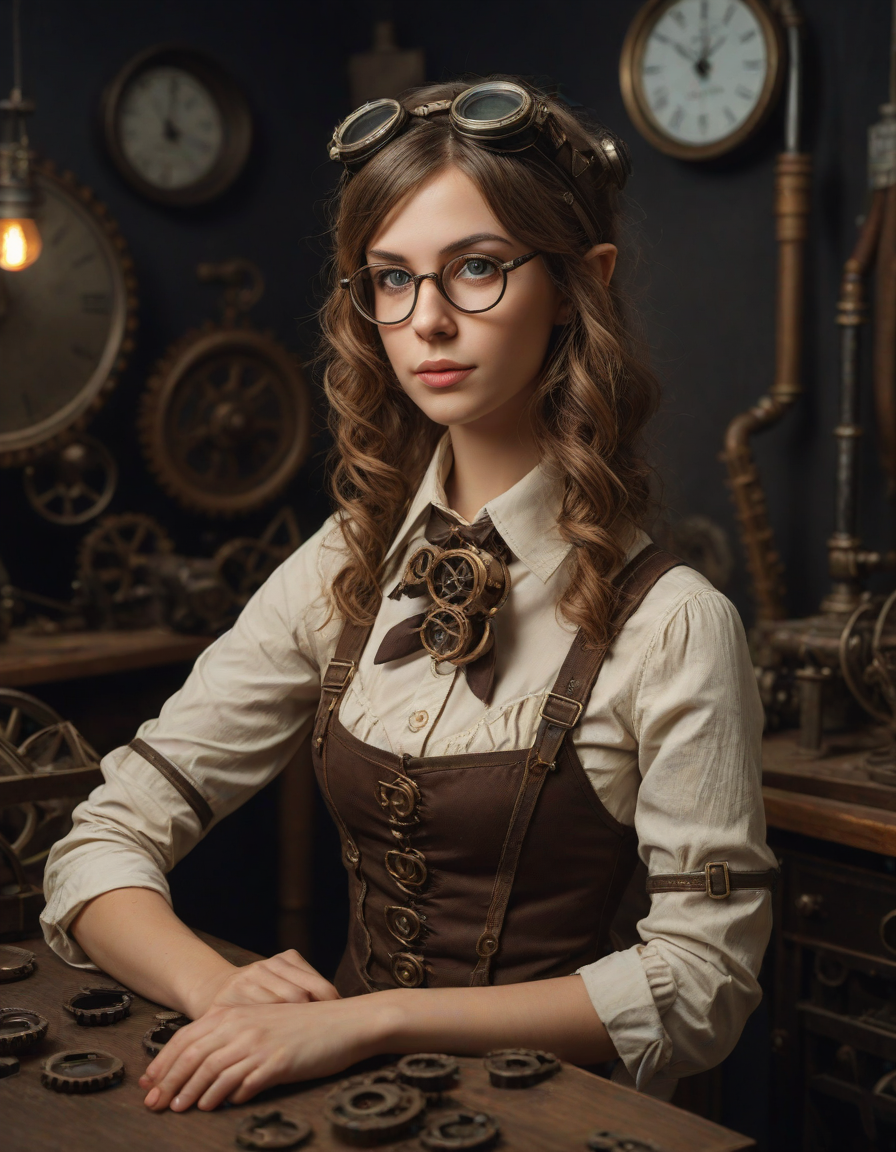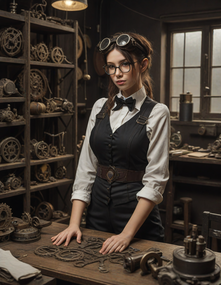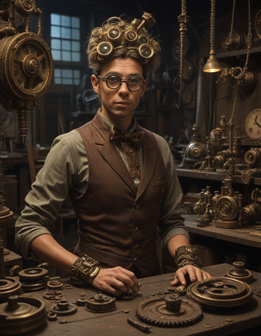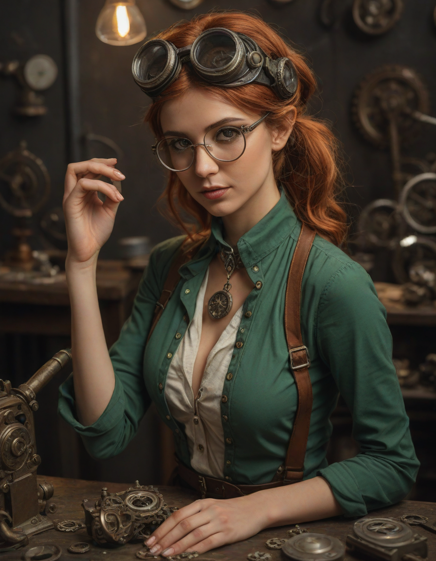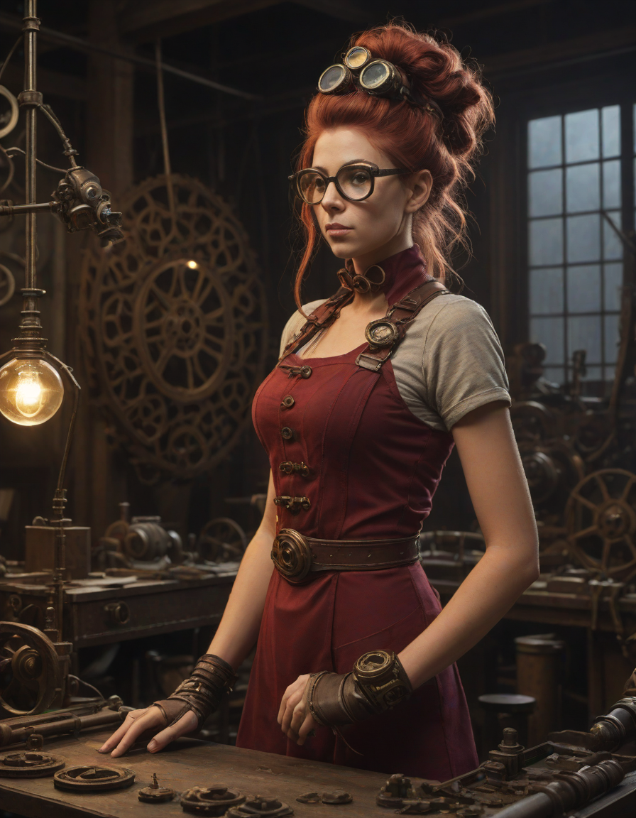 steampunk engineer, with gears and goggles in a dimly lit workshop
