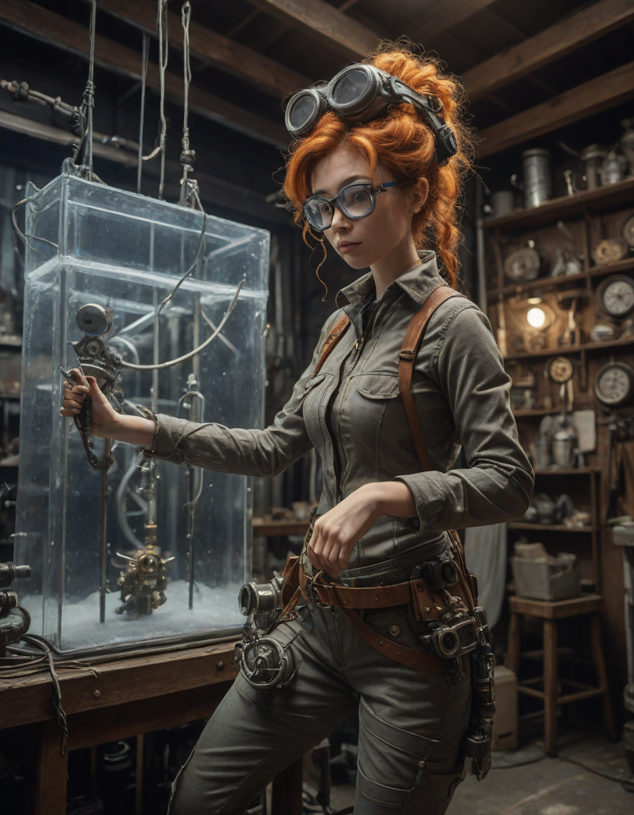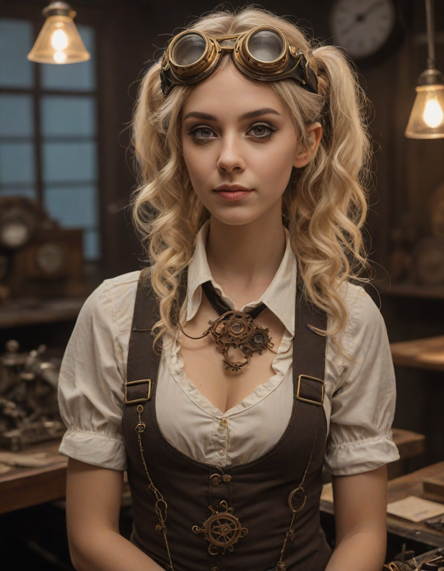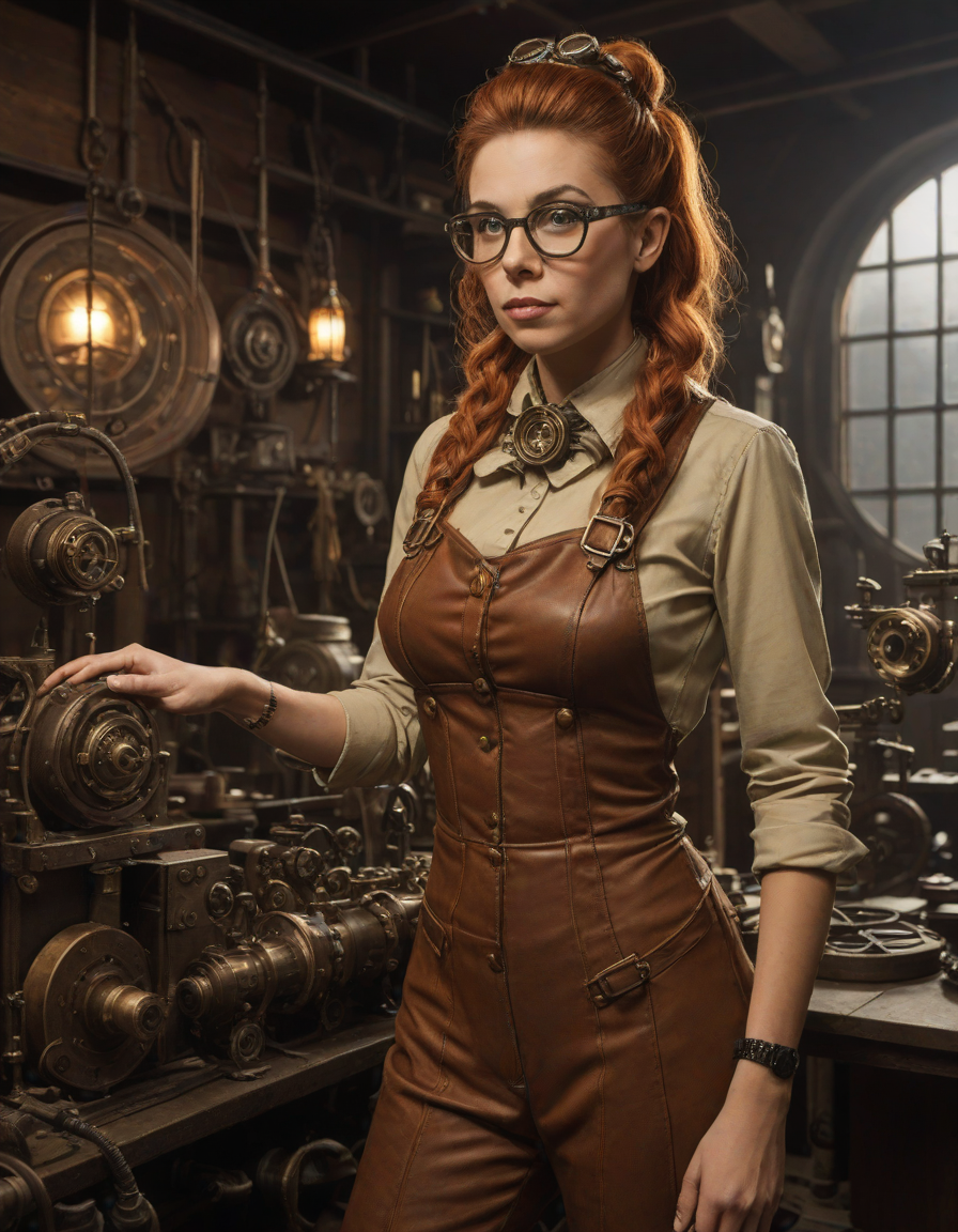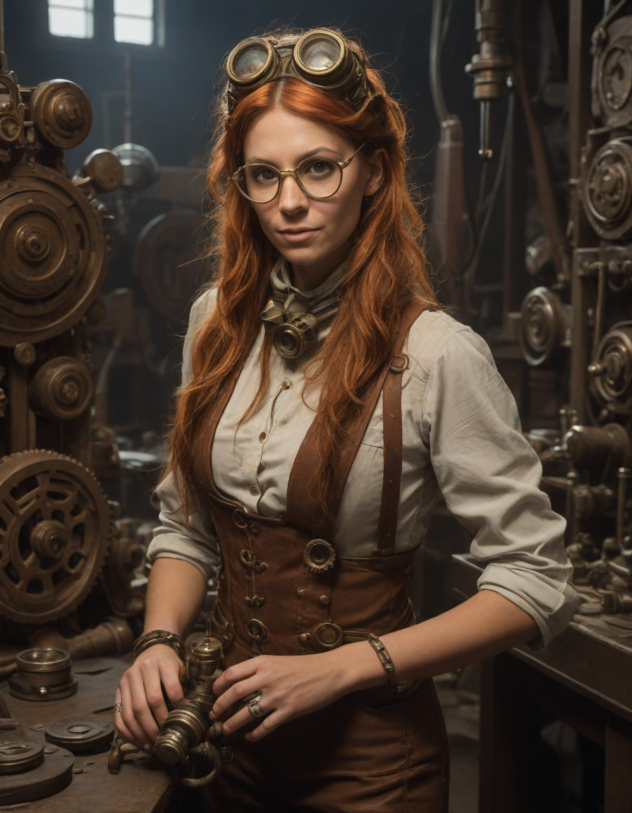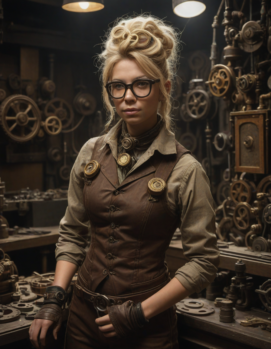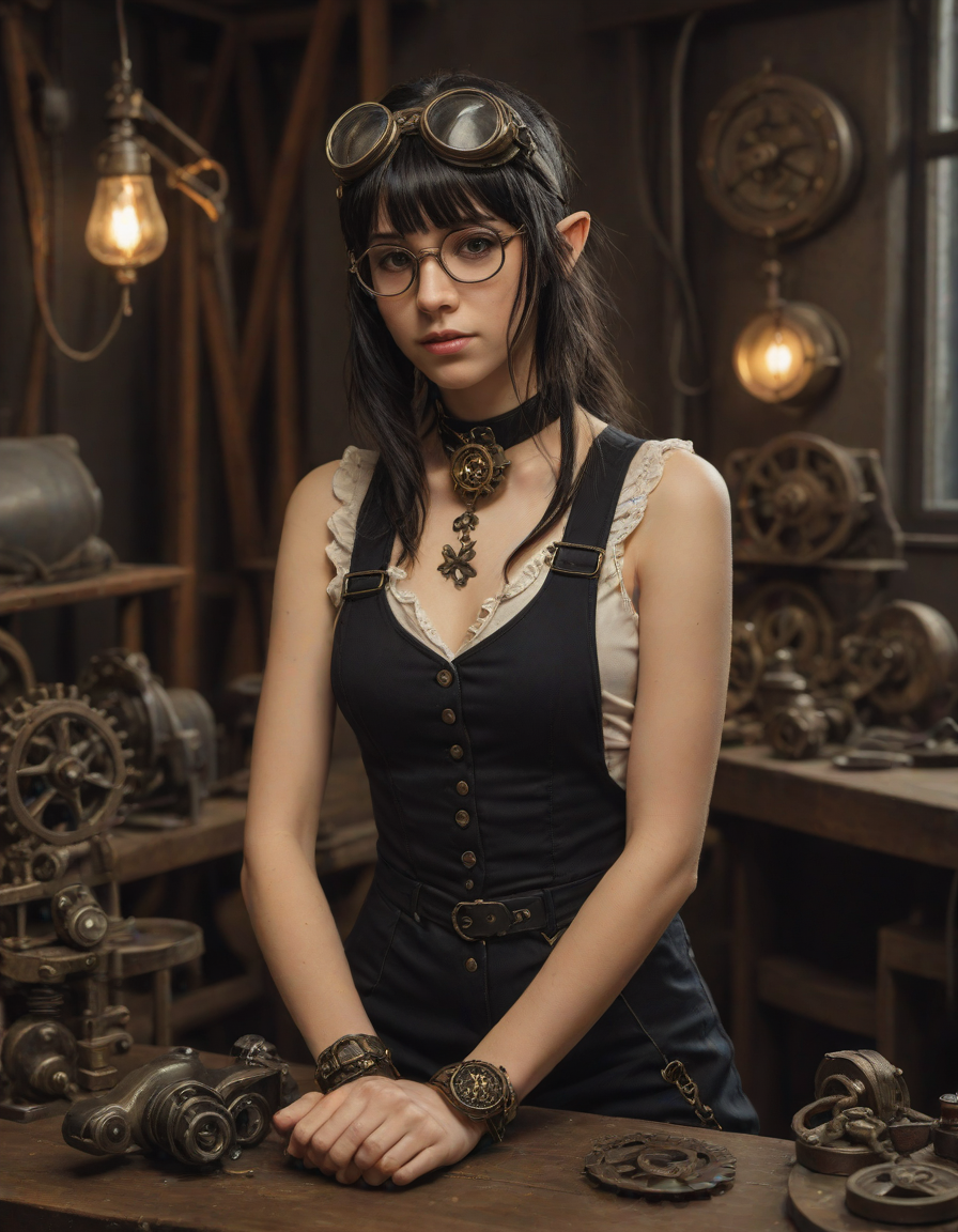 steampunk engineer, with gears and goggles in a dimly lit workshop