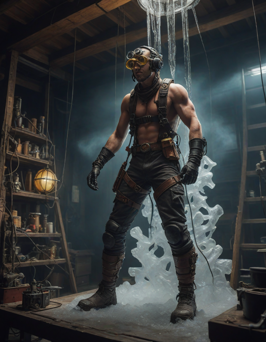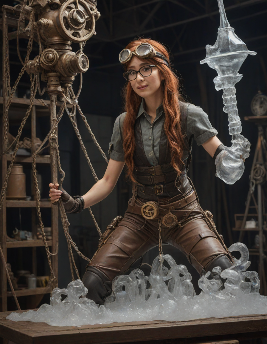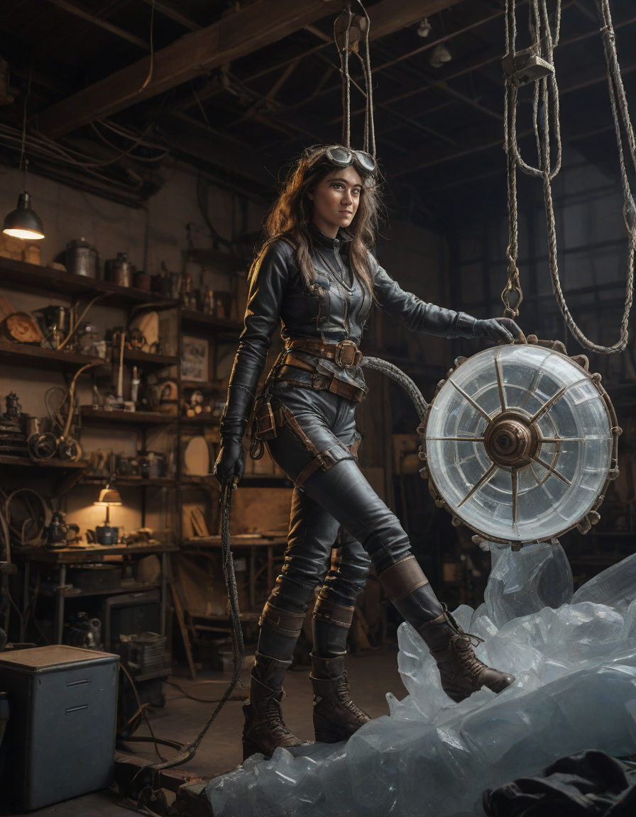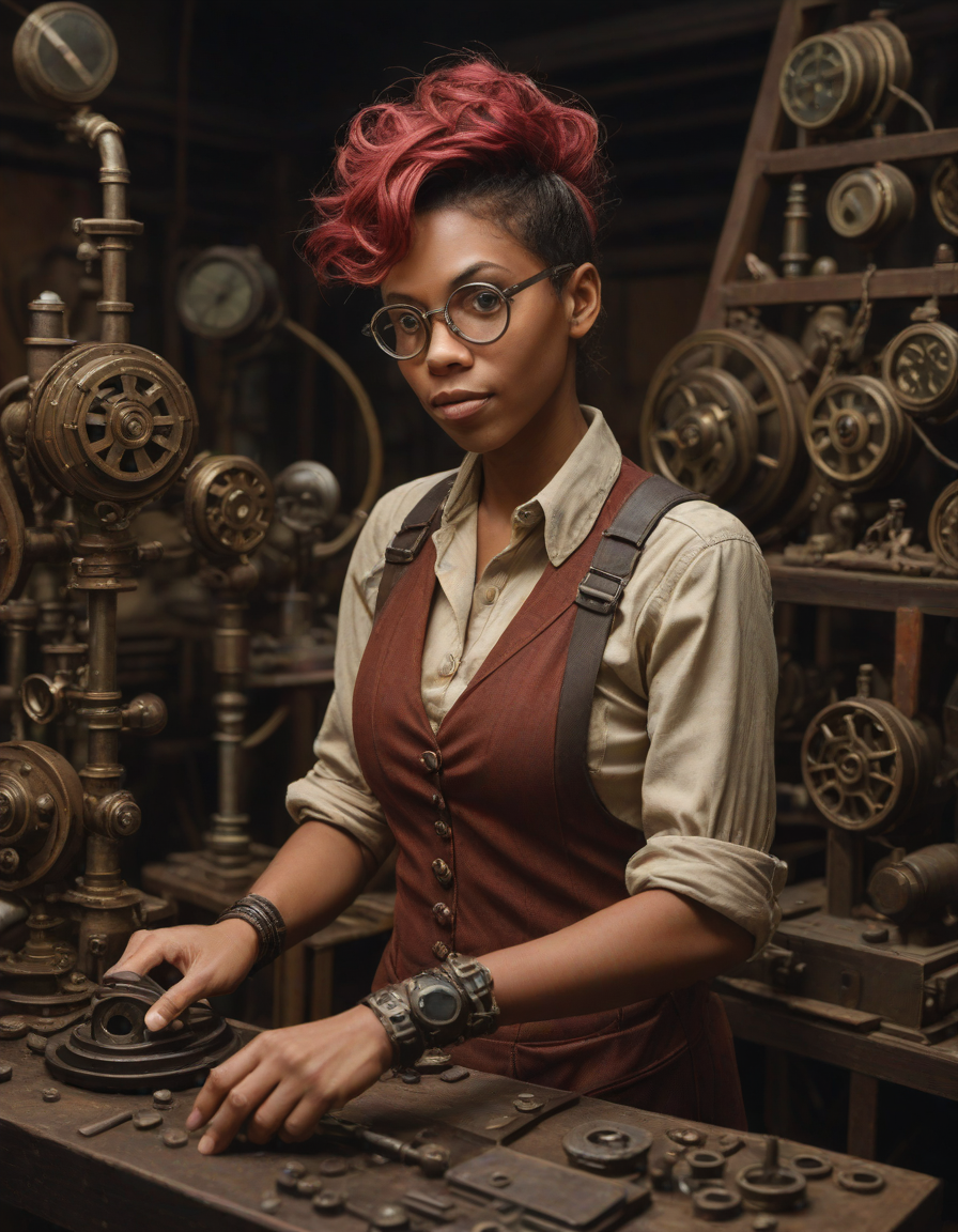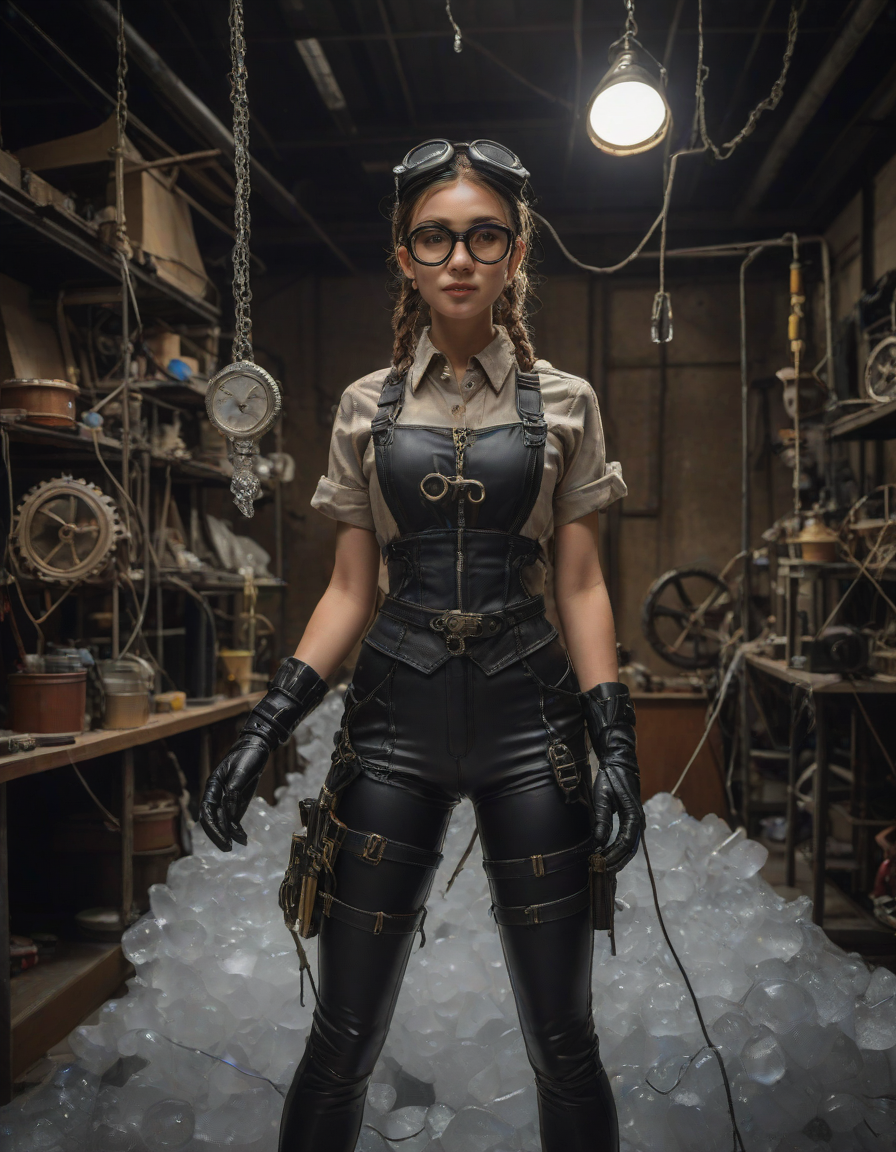 steampunk engineer, with gears and goggles in a dimly lit workshop