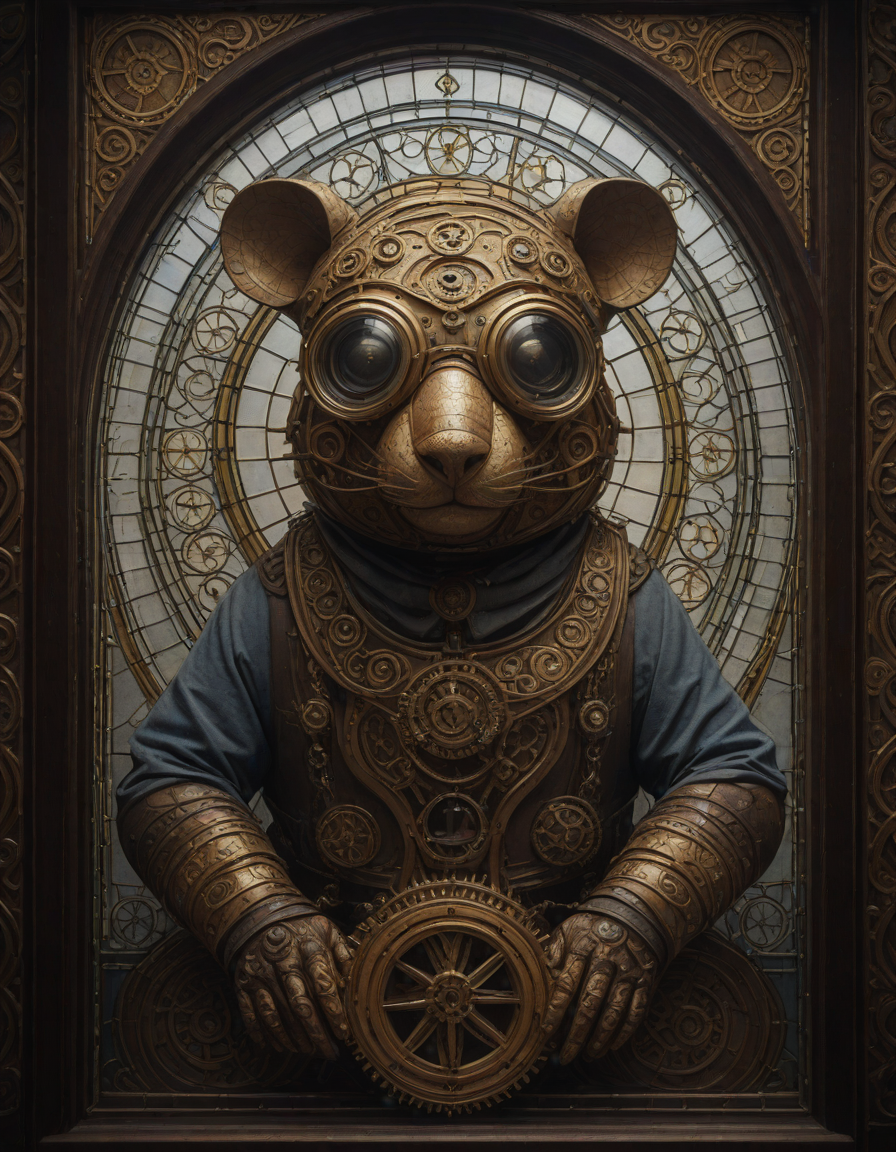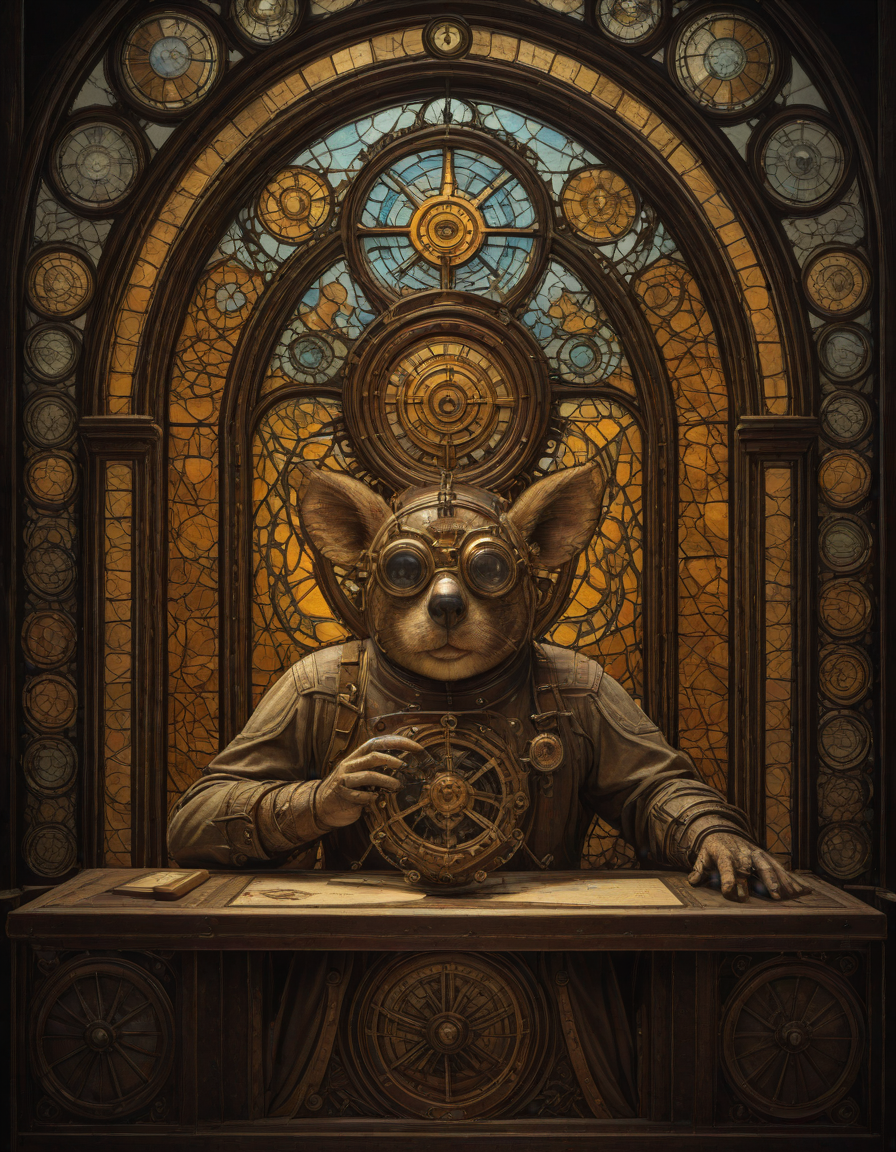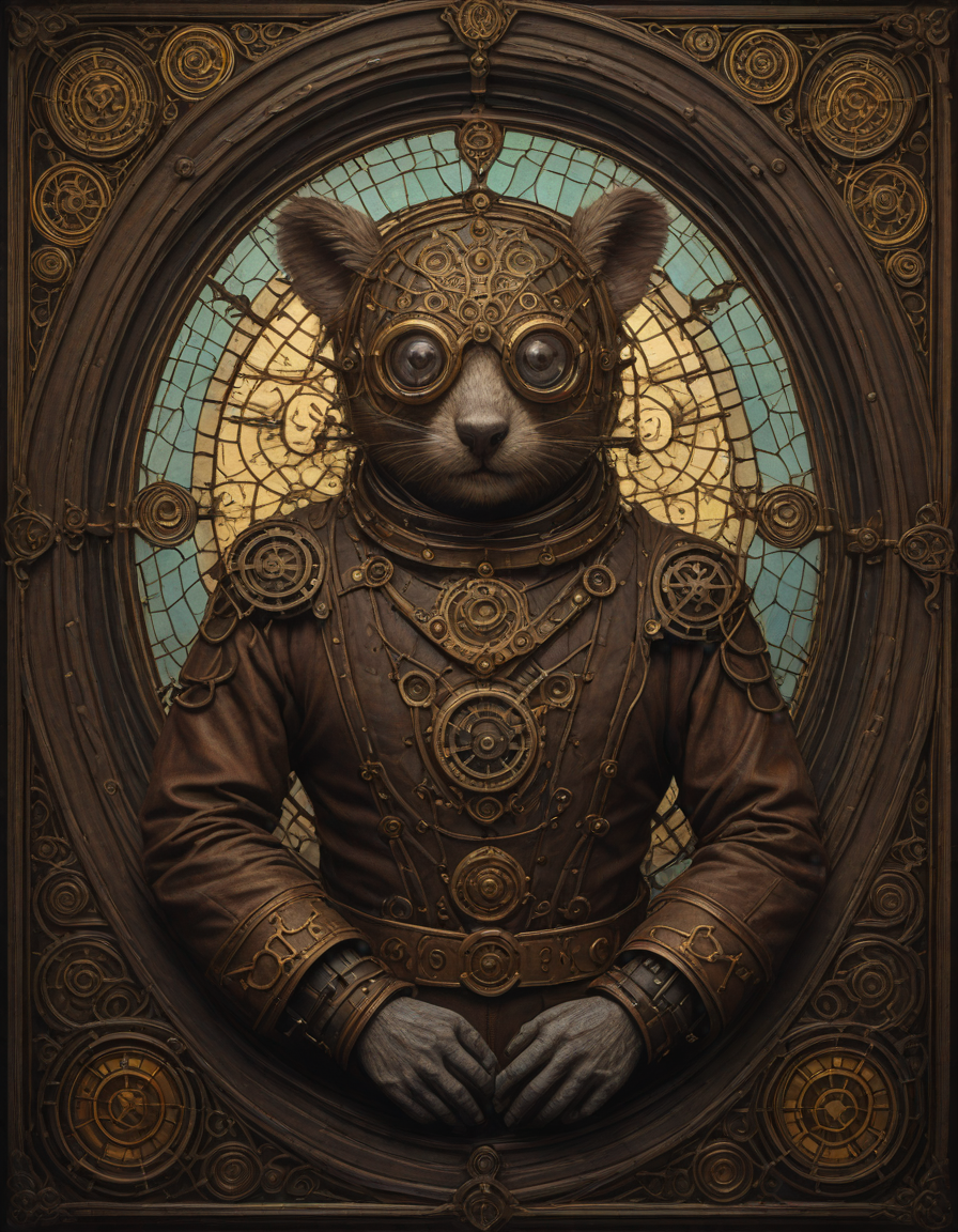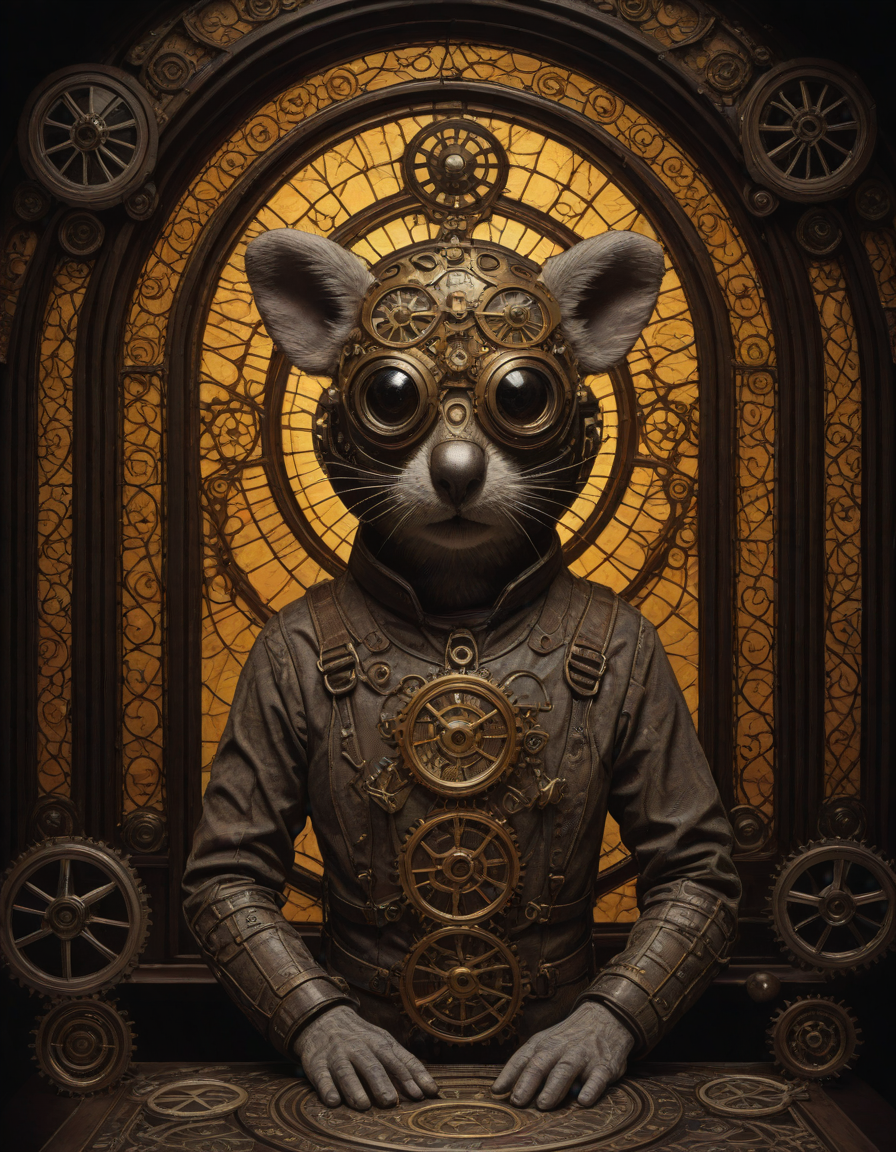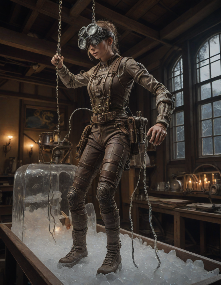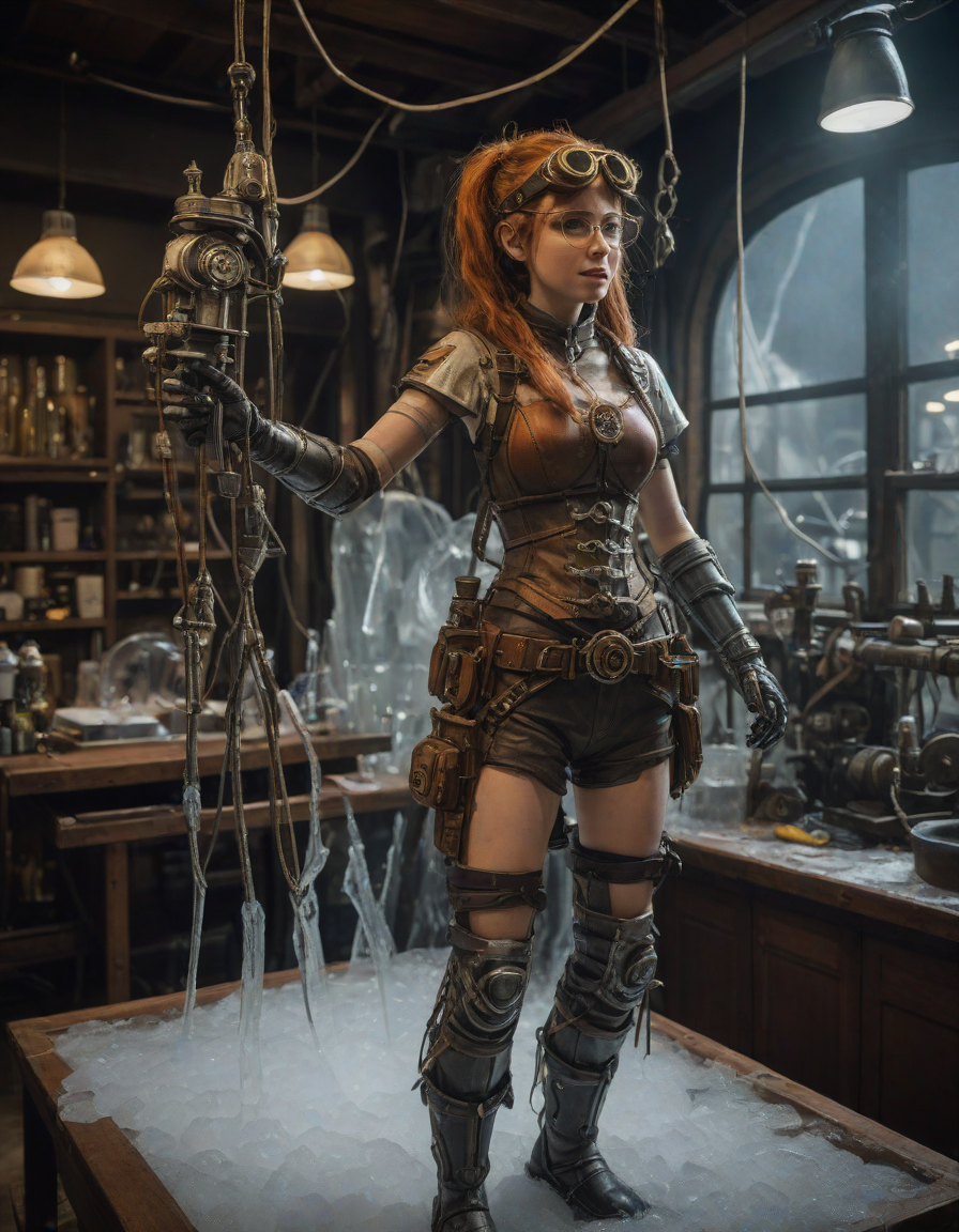 steampunk engineer, with gears and goggles in a dimly lit workshop