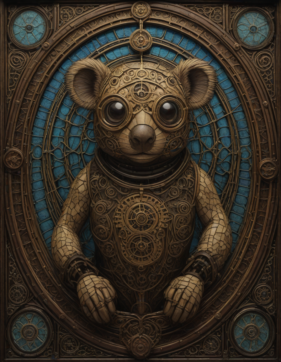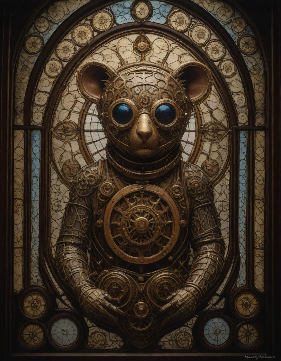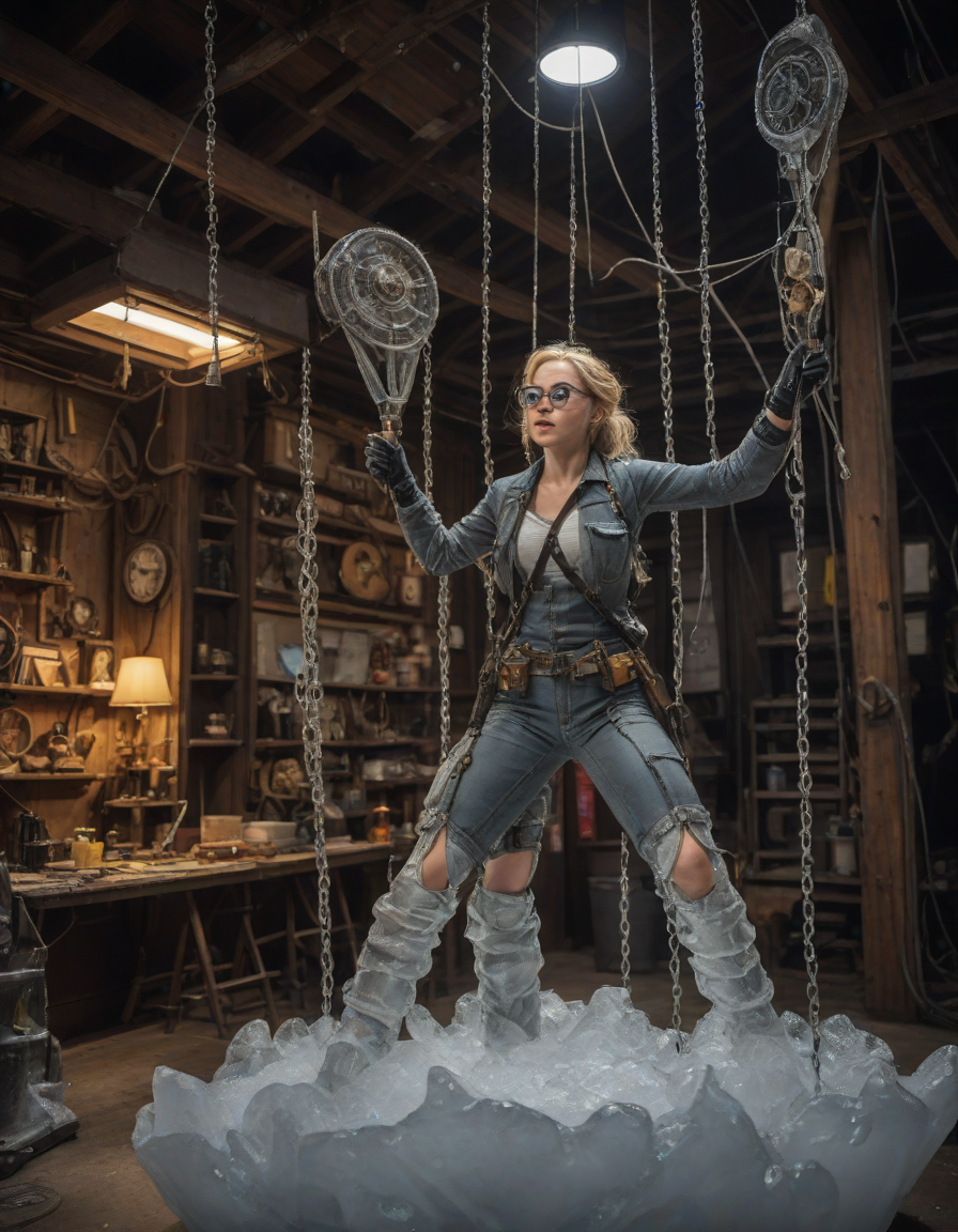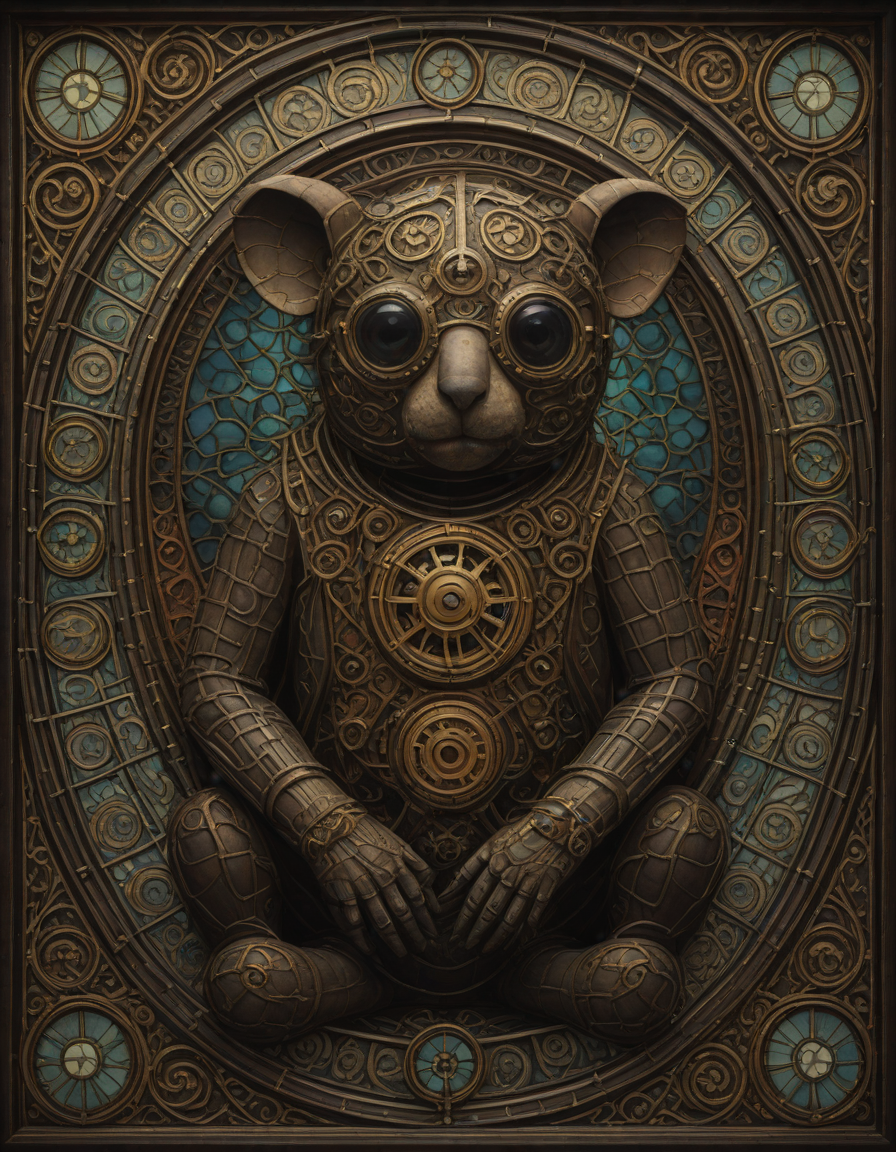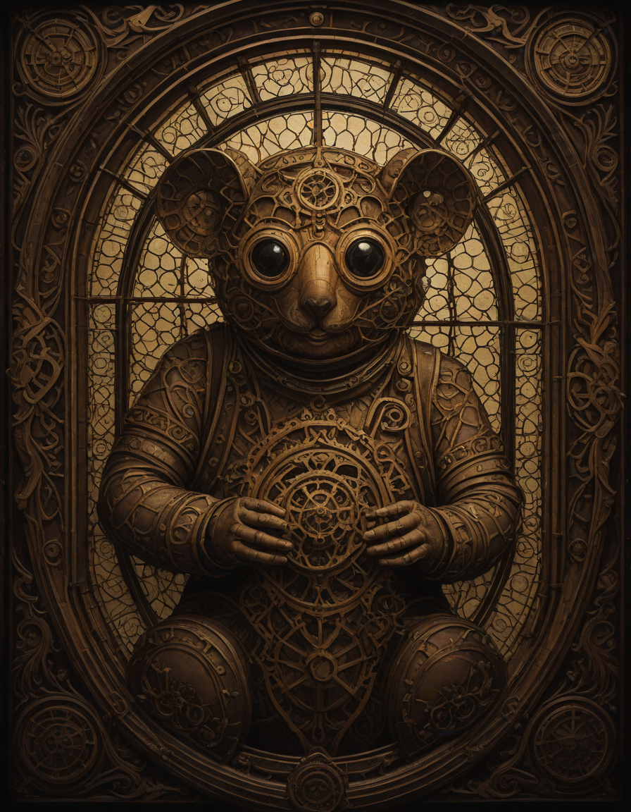 steampunk engineer, with gears and goggles in a dimly lit workshop
