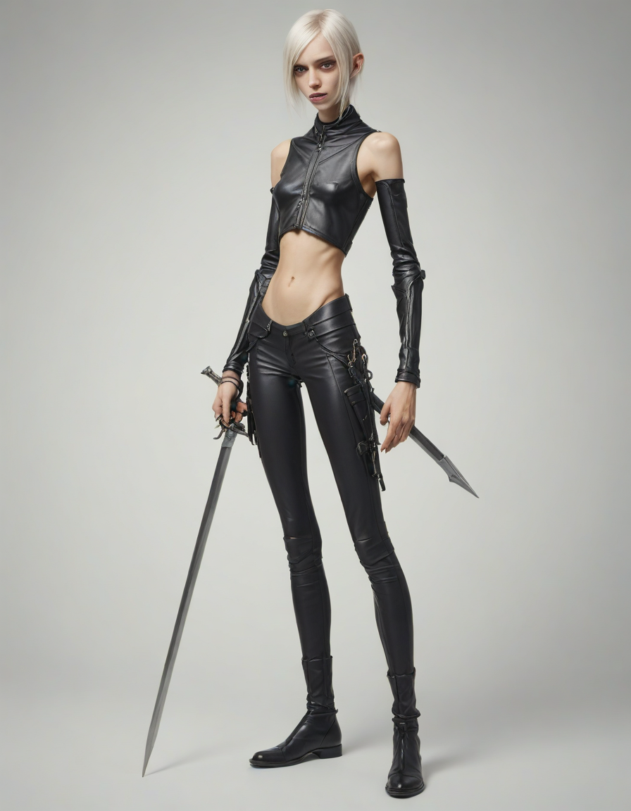 Skinny, Anorexic, Pronounced collarbones, visible rib cage, slender arms, narrow waistline, defined hip bones, sharp elbow angles, thin legs, minimal body fat, conspicuous wrist bones, gaunt facial features, prominent cheekbones, slender neck, defined jawline, visible tendons, accentuated knee caps, bony shoulders, delicate frame, slight muscle definition, thin calves, angular body contours, skeletal appearance, pronounced bone structure, minimal curvature, stark bodily features, fragile silhouette, pencil-thin thighs, sharp shin bones, elongated limb appearance, minimal buttock volume, tight skin over bones, defined thigh gap, prominent forearm veins, skeletal wrist appearance