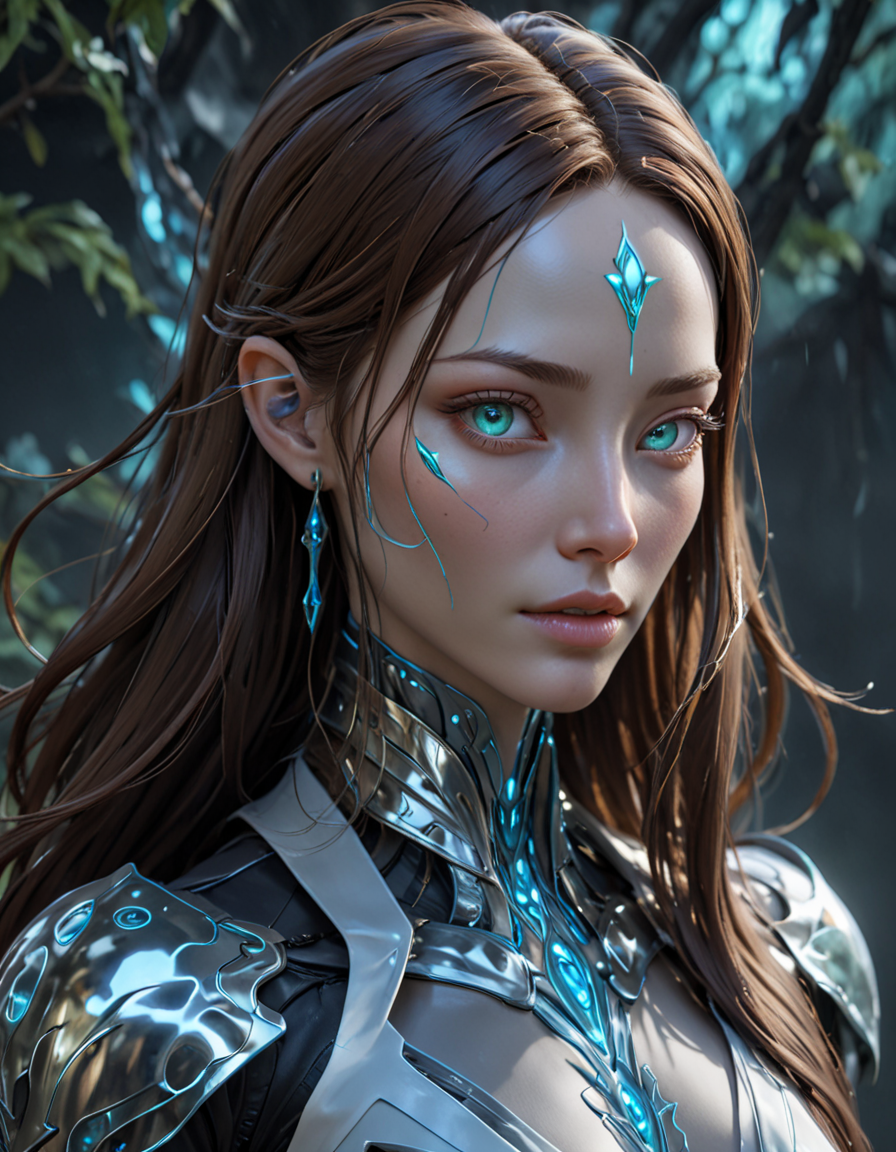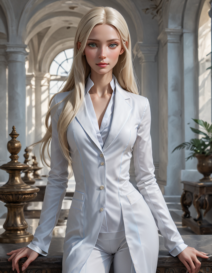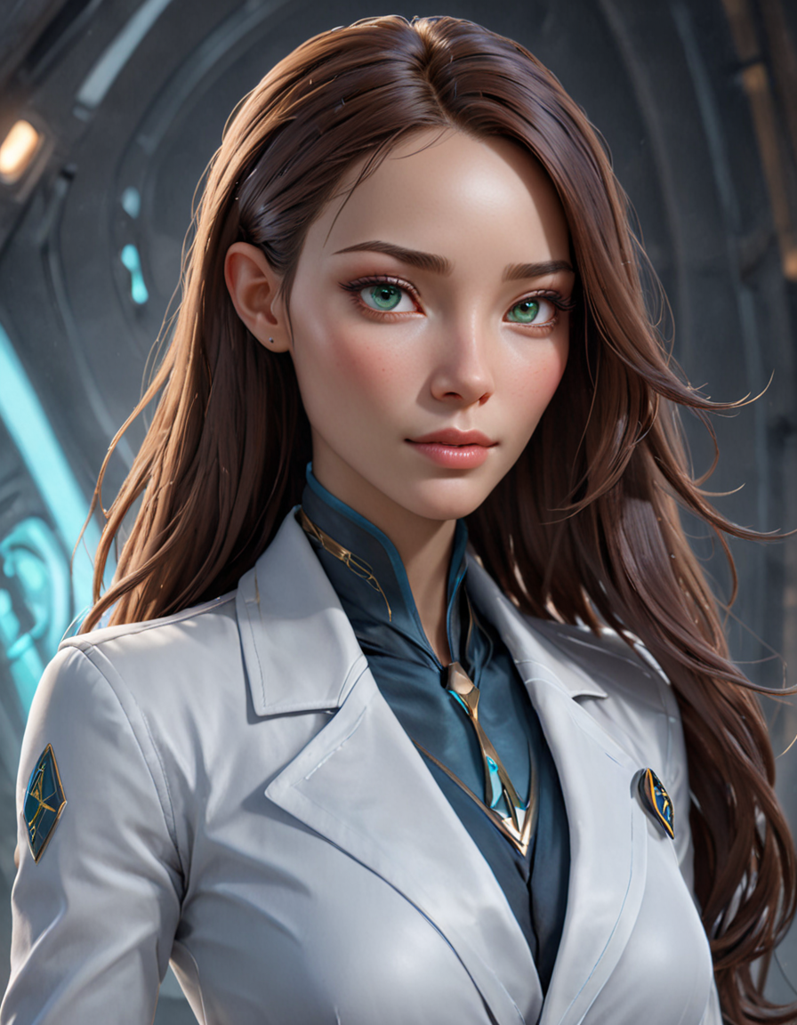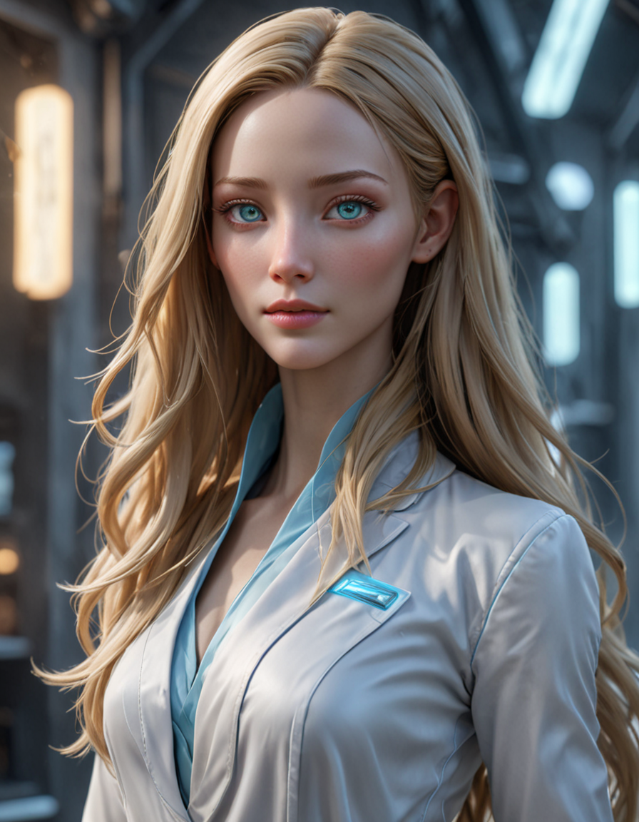 stunningly beautiful female android with smooth synthetic skin, long iridescent hair, gentle glowing eyes, an aura of wisdom and compassion, slender graceful figure, wearing an elegant white labcoat