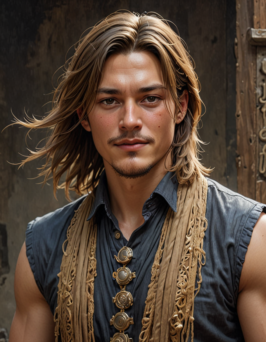 35-year-old male journalist, short dark hair with hints of gray, light stubble, hazel eyes, world-weary expression, small scar on left cheek