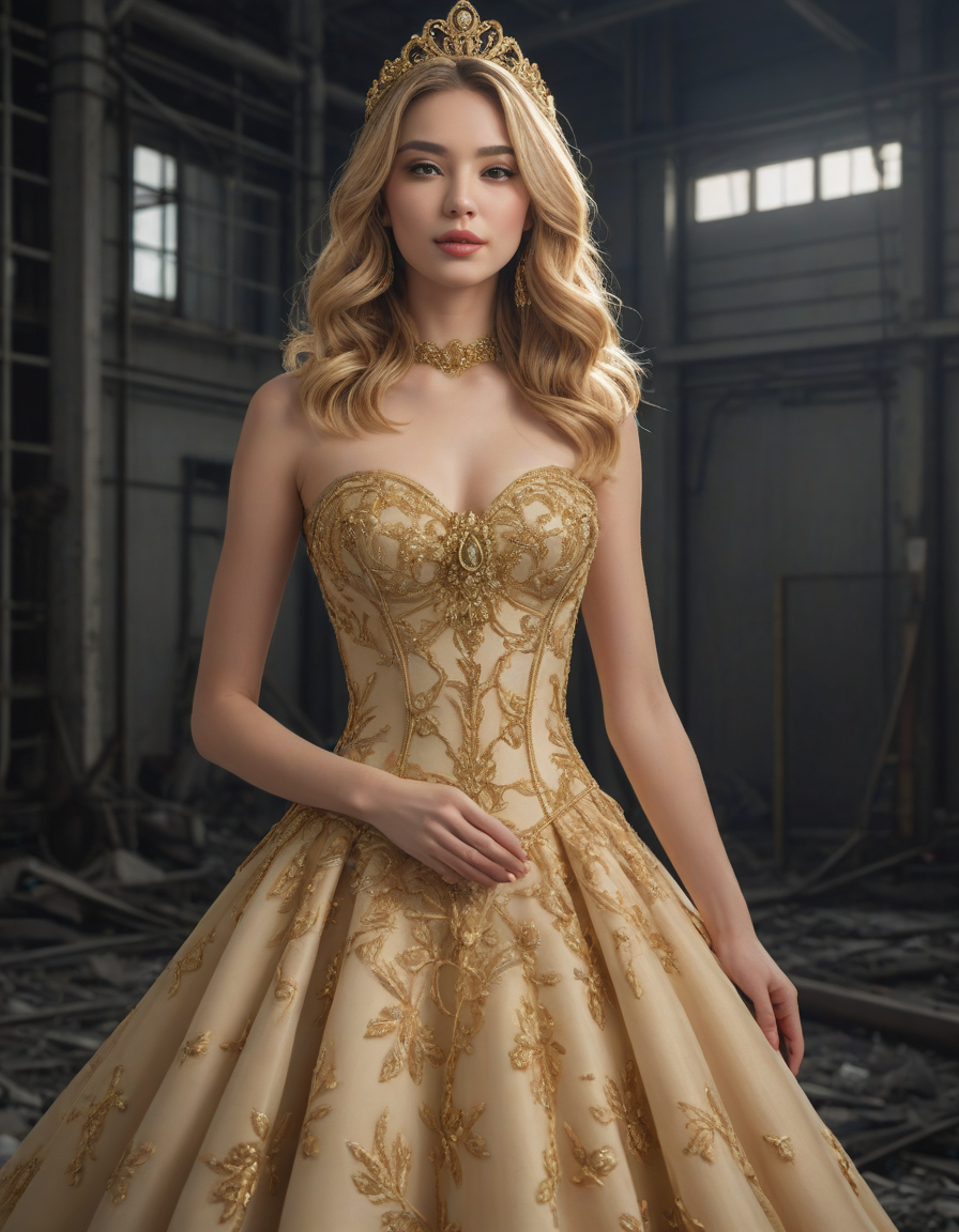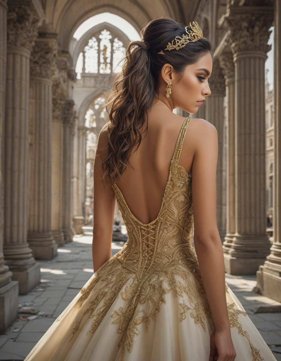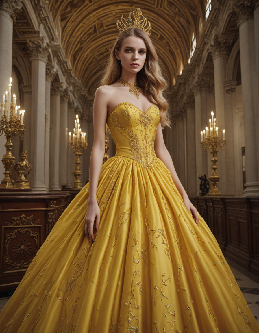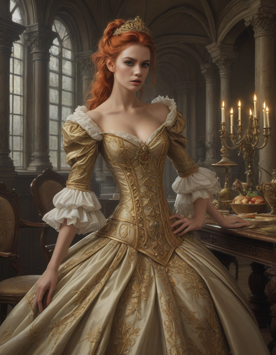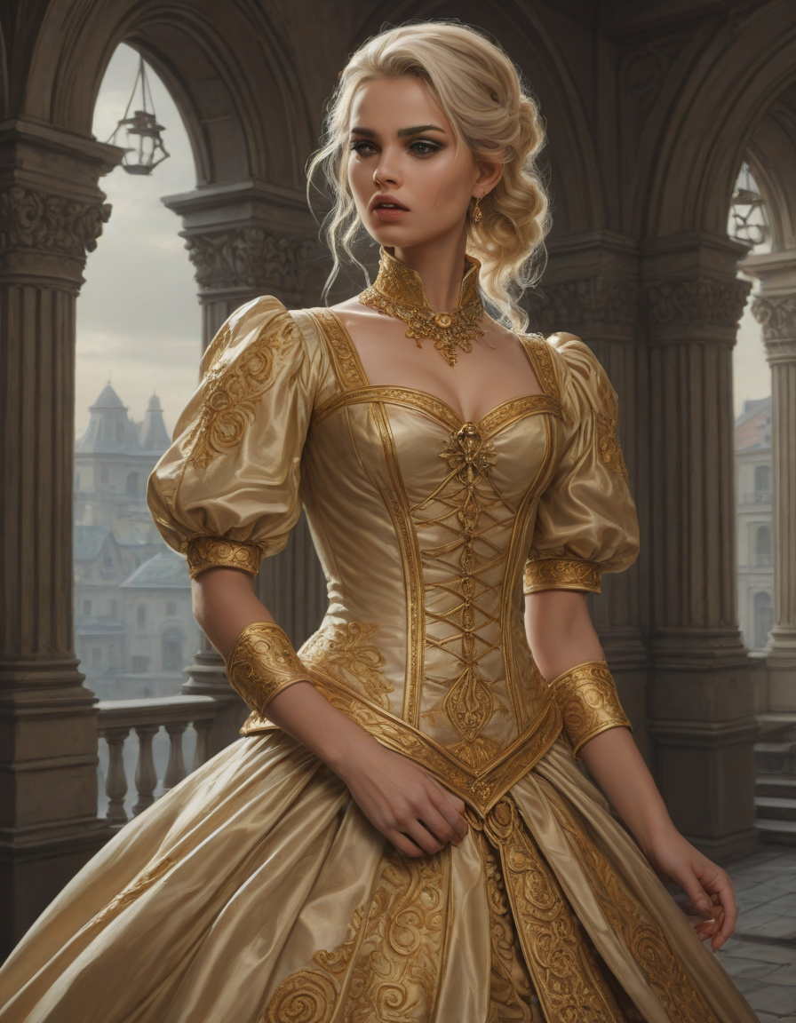 18th-century drab peasant garb → ornate, gold-trimmed ball gown