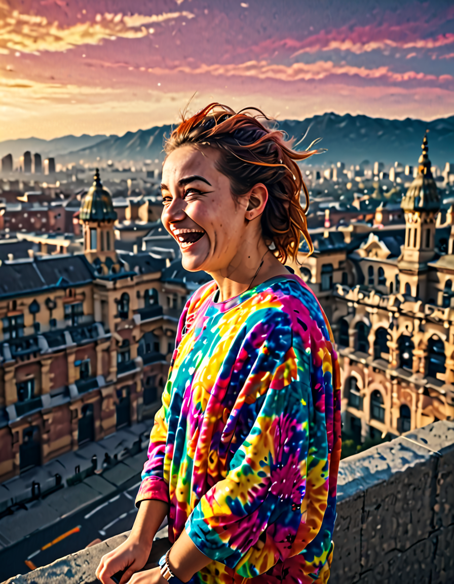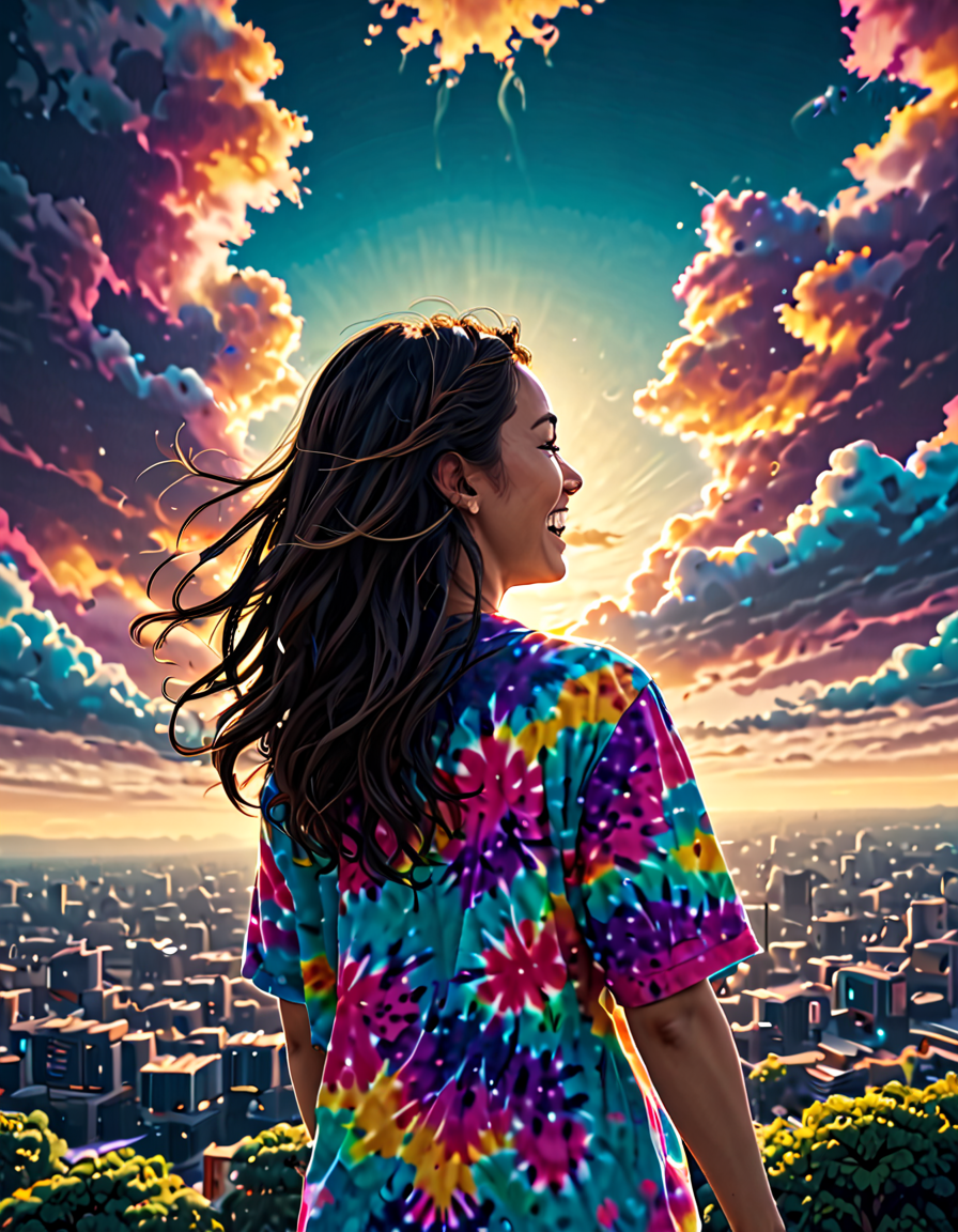 wearing colorful tie-dye, 80s ... (4 doras merged)
