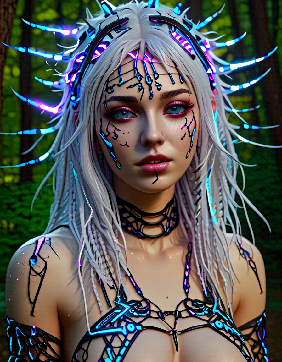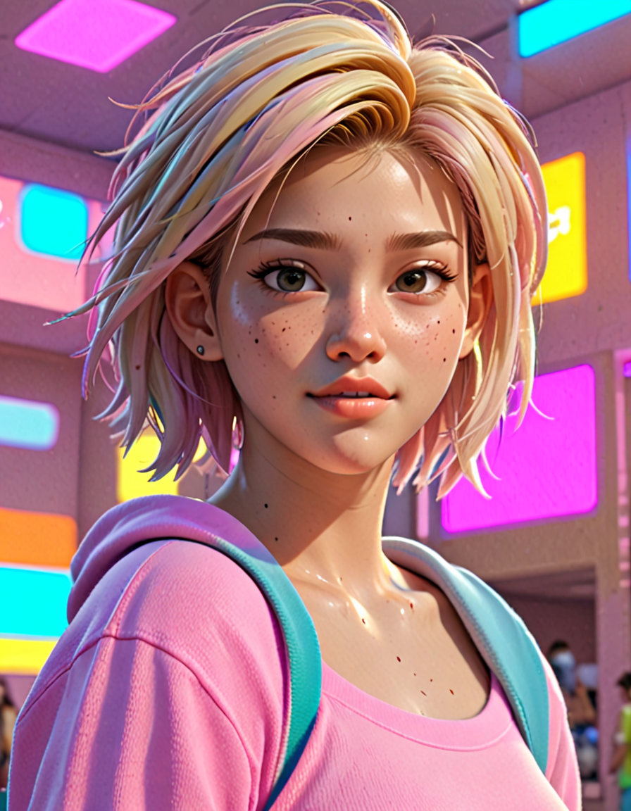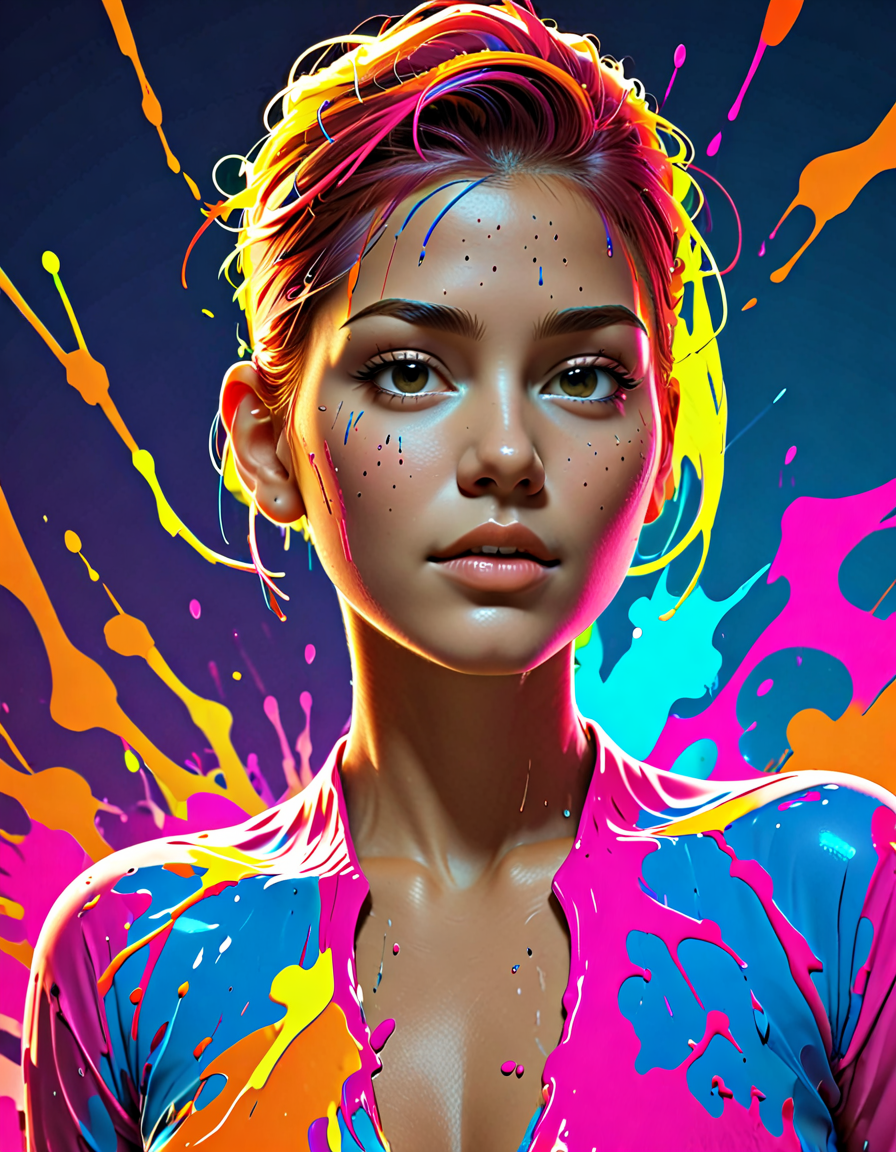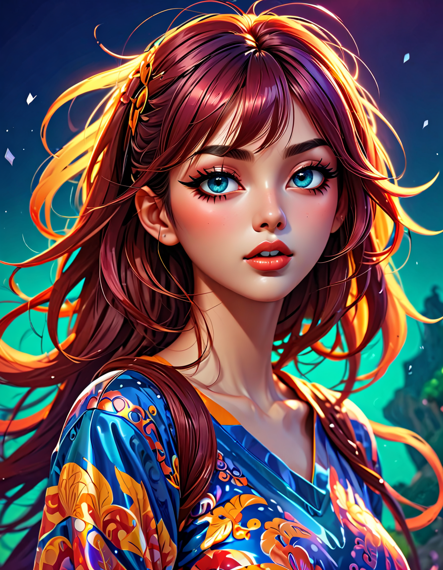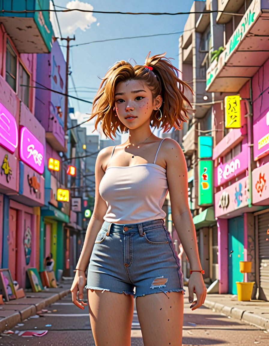 Craft an ultra-realistic, photorealistic image of an 18-year-old high school senior girl, fully immersed in the e-girl aesthetic, standing alone yet commanding the scene with an unspoken power. Her voluptuous figure is showcased through the definitive e-girl style, blending internet culture's flair with a personal touch that's bold and unapologetic. Her attire consists of an oversized long-sleeve striped shirt beneath a black graphic t-shirt dress that contours gracefully, celebrating her curves against the backdrop of e-girl fashion's layered complexity. Fishnet tights underpin the ensemble, leading down to chunky black platform boots that ground her in strength and style. Her makeup is a canvas of e-girl artistry, with dramatic winged eyeliner that stretches towards her temples in a bold statement, eyeshadow in neon hues that electrify her gaze, and dark, matte lipstick that draws all eyes to her. A generous application of blush adds life and vibrancy to her cheeks, complemented by creatively designed nails that are both dark and daring. Accessories—silver chains, a heart pendant choker, and a collection of rings—add layers of personality and depth. Her hair, possibly featuring pastel or neon streaks, is styled in a way that balances edge with elegance, with temporary tattoos or stickers adorning her face to accentuate her playful rebellion. In this moment, the young woman stands with her hands confidently on her hips, embodying the essence of e-girl individuality and assurance. This pose not only showcases her outfit and the nuances of her style but also conveys a sense of self-assuredness and ownership of her identity. Her expression can be a mix of a playful smirk and a challenging gaze, inviting viewers into her world while holding them at just the right distance. The background remains intentionally blurred, a mere suggestion of her personal space adorned with elements synonymous with the e-girl life—neon signs, band posters, and string lights—creating an ambiance that's both intimate and expressive. The lighting emphasizes the vivid colors of her makeup and the unique textures of her outfit, casting her in an ambiance that's dynamic and full of life. This visualization retains the essence of our previous description, now enhanced by a pose that speaks volumes of her confidence and the vibrant spirit of the e-girl aesthetic. It captures not just the photorealistic image of a young woman in the throes of digital age culture but also the bold statement of identity and self-expression that defines her at this significant moment in her life.