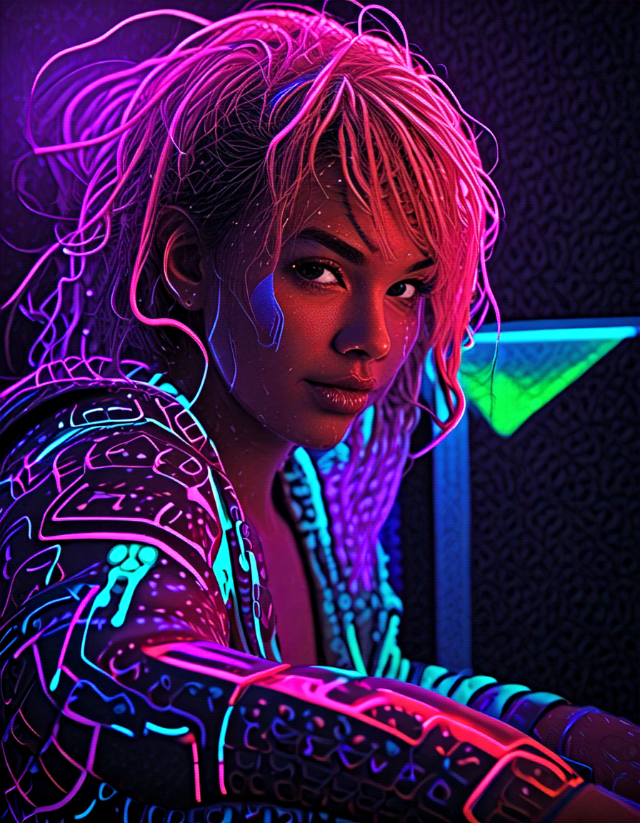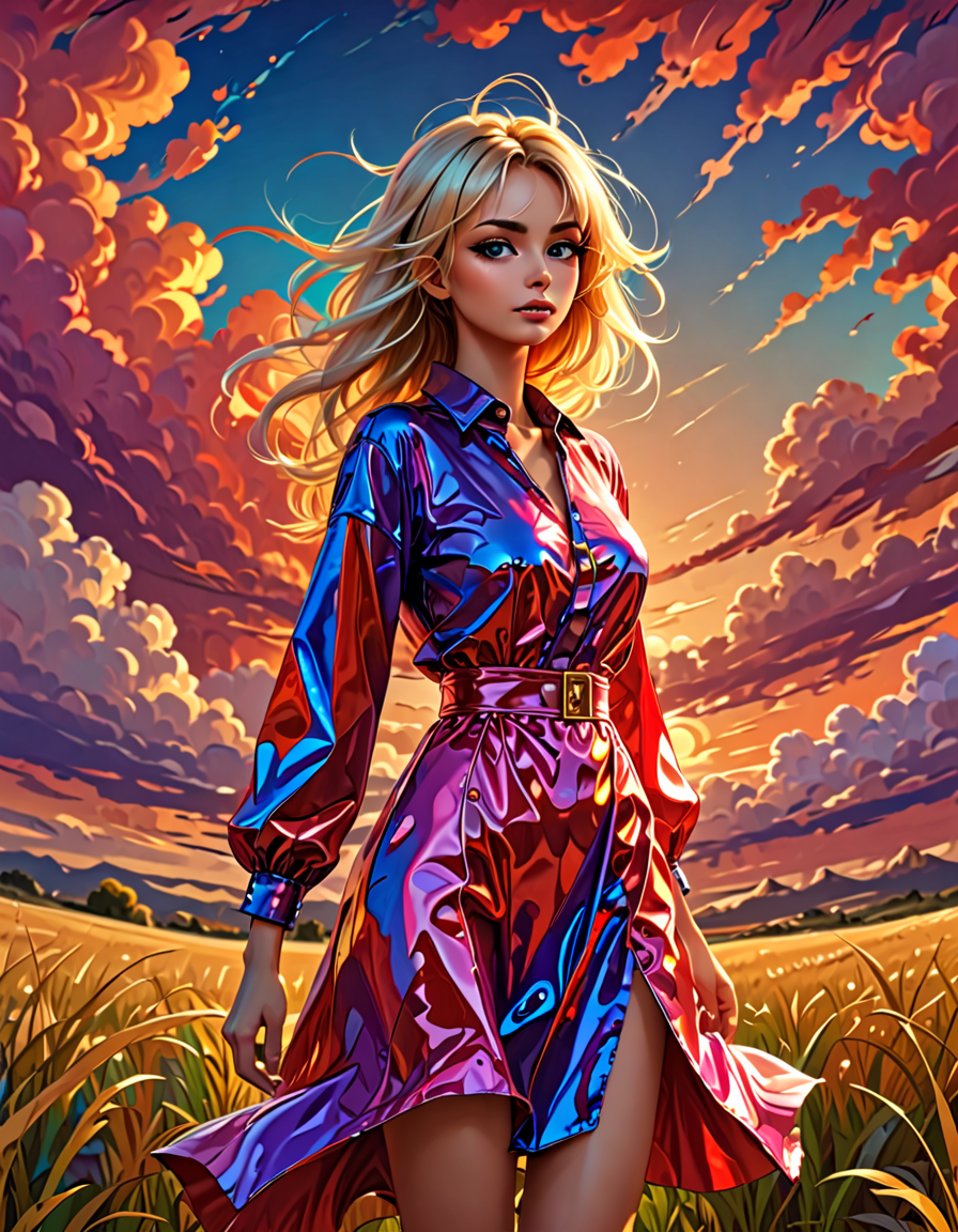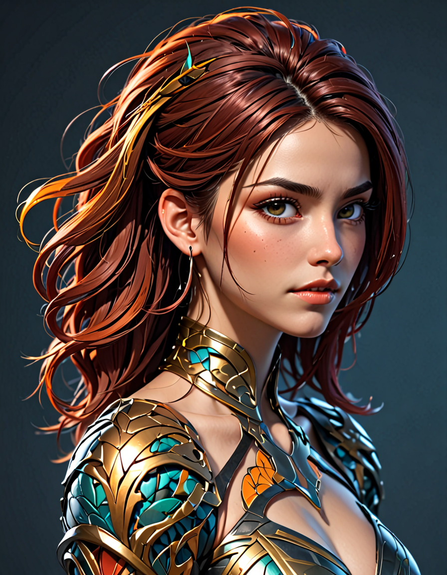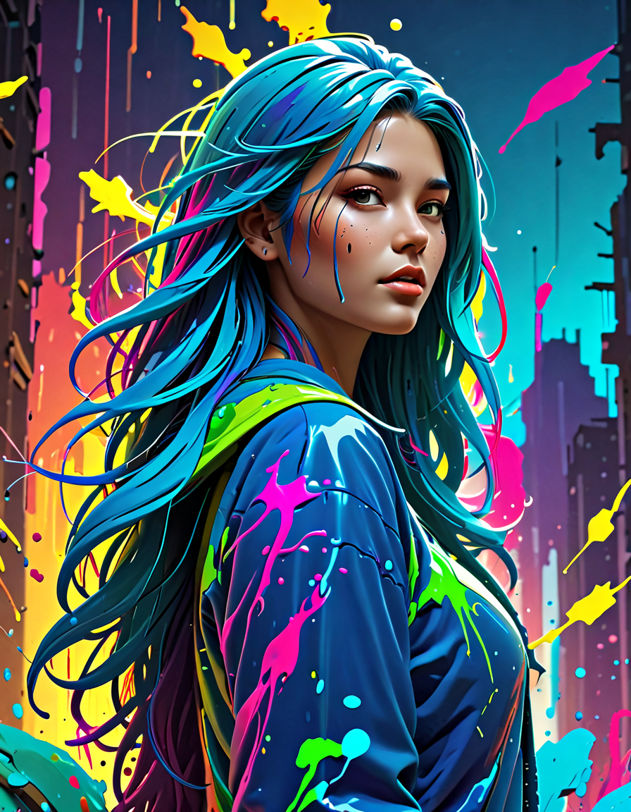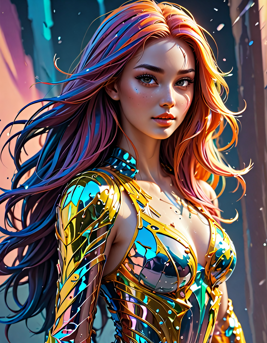 Craft an ultra-realistic, photorealistic image of an 18-year-old high school senior girl, fully immersed in the e-girl aesthetic, standing alone yet commanding the scene with an unspoken power. Her voluptuous figure is showcased through the definitive e-girl style, blending internet culture's flair with a personal touch that's bold and unapologetic. Her attire consists of an oversized long-sleeve striped shirt beneath a black graphic t-shirt dress that contours gracefully, celebrating her curves against the backdrop of e-girl fashion's layered complexity. Fishnet tights underpin the ensemble, leading down to chunky black platform boots that ground her in strength and style. Her makeup is a canvas of e-girl artistry, with dramatic winged eyeliner that stretches towards her temples in a bold statement, eyeshadow in neon hues that electrify her gaze, and dark, matte lipstick that draws all eyes to her. A generous application of blush adds life and vibrancy to her cheeks, complemented by creatively designed nails that are both dark and daring. Accessories—silver chains, a heart pendant choker, and a collection of rings—add layers of personality and depth. Her hair, possibly featuring pastel or neon streaks, is styled in a way that balances edge with elegance, with temporary tattoos or stickers adorning her face to accentuate her playful rebellion. In this moment, the young woman stands with her hands confidently on her hips, embodying the essence of e-girl individuality and assurance. This pose not only showcases her outfit and the nuances of her style but also conveys a sense of self-assuredness and ownership of her identity. Her expression can be a mix of a playful smirk and a challenging gaze, inviting viewers into her world while holding them at just the right distance. The background remains intentionally blurred, a mere suggestion of her personal space adorned with elements synonymous with the e-girl life—neon signs, band posters, and string lights—creating an ambiance that's both intimate and expressive. The lighting emphasizes the vivid colors of her makeup and the unique textures of her outfit, casting her in an ambiance that's dynamic and full of life. This visualization retains the essence of our previous description, now enhanced by a pose that speaks volumes of her confidence and the vibrant spirit of the e-girl aesthetic. It captures not just the photorealistic image of a young woman in the throes of digital age culture but also the bold statement of identity and self-expression that defines her at this significant moment in her life.