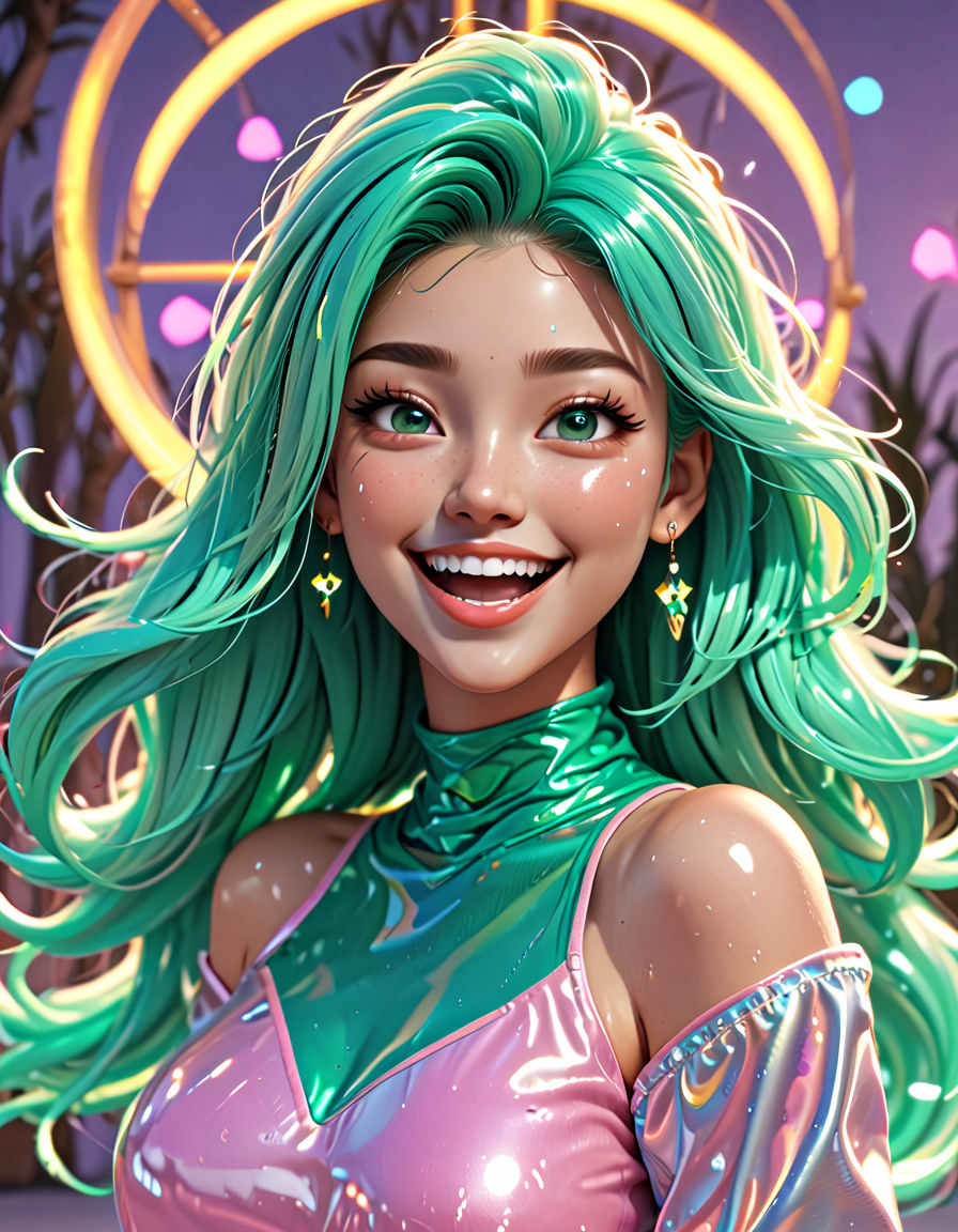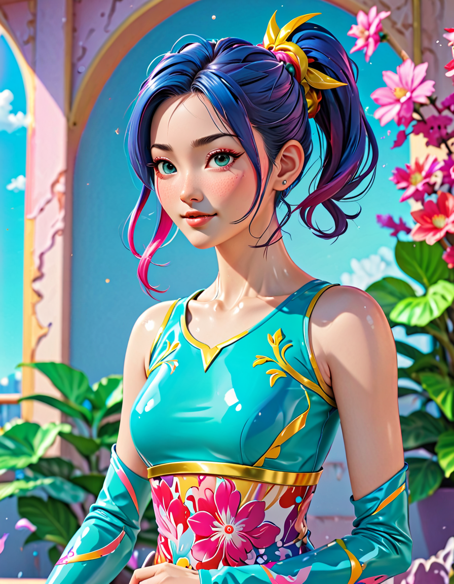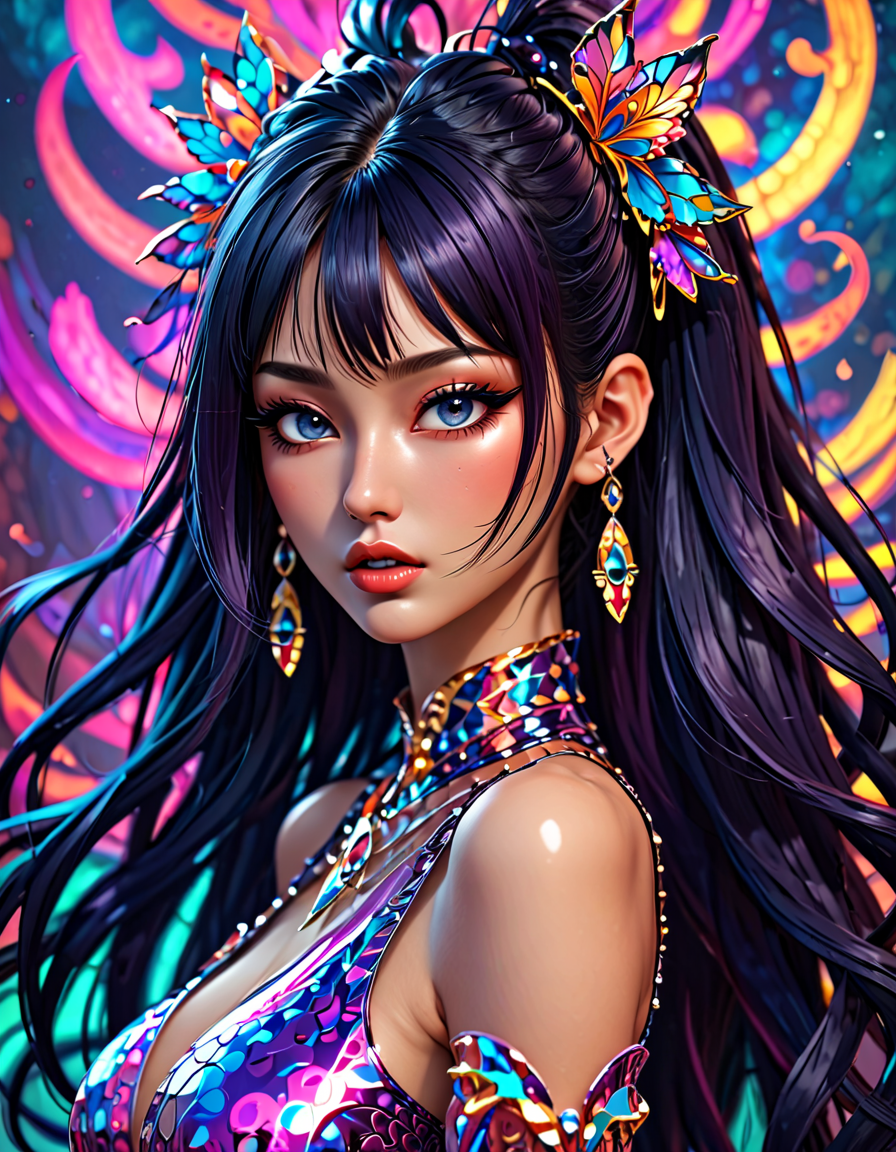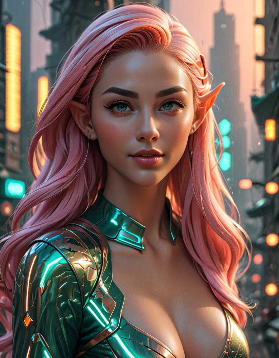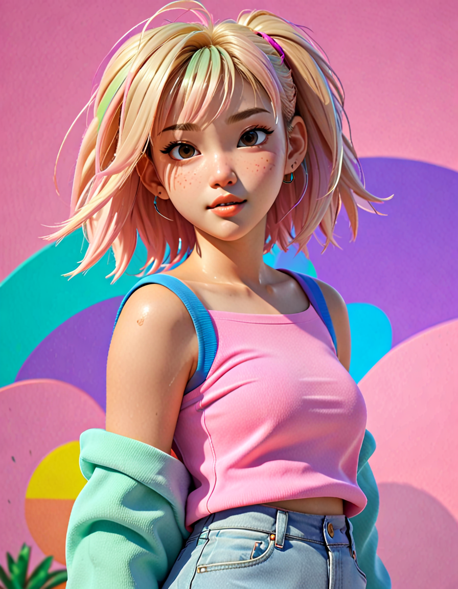 Craft an ultra-realistic, photorealistic image of an 18-year-old high school senior girl, fully immersed in the e-girl aesthetic, standing alone yet commanding the scene with an unspoken power. Her voluptuous figure is showcased through the definitive e-girl style, blending internet culture's flair with a personal touch that's bold and unapologetic. Her attire consists of an oversized long-sleeve striped shirt beneath a black graphic t-shirt dress that contours gracefully, celebrating her curves against the backdrop of e-girl fashion's layered complexity. Fishnet tights underpin the ensemble, leading down to chunky black platform boots that ground her in strength and style. Her makeup is a canvas of e-girl artistry, with dramatic winged eyeliner that stretches towards her temples in a bold statement, eyeshadow in neon hues that electrify her gaze, and dark, matte lipstick that draws all eyes to her. A generous application of blush adds life and vibrancy to her cheeks, complemented by creatively designed nails that are both dark and daring. Accessories—silver chains, a heart pendant choker, and a collection of rings—add layers of personality and depth. Her hair, possibly featuring pastel or neon streaks, is styled in a way that balances edge with elegance, with temporary tattoos or stickers adorning her face to accentuate her playful rebellion. In this moment, the young woman stands with her hands confidently on her hips, embodying the essence of e-girl individuality and assurance. This pose not only showcases her outfit and the nuances of her style but also conveys a sense of self-assuredness and ownership of her identity. Her expression can be a mix of a playful smirk and a challenging gaze, inviting viewers into her world while holding them at just the right distance. The background remains intentionally blurred, a mere suggestion of her personal space adorned with elements synonymous with the e-girl life—neon signs, band posters, and string lights—creating an ambiance that's both intimate and expressive. The lighting emphasizes the vivid colors of her makeup and the unique textures of her outfit, casting her in an ambiance that's dynamic and full of life. This visualization retains the essence of our previous description, now enhanced by a pose that speaks volumes of her confidence and the vibrant spirit of the e-girl aesthetic. It captures not just the photorealistic image of a young woman in the throes of digital age culture but also the bold statement of identity and self-expression that defines her at this significant moment in her life.