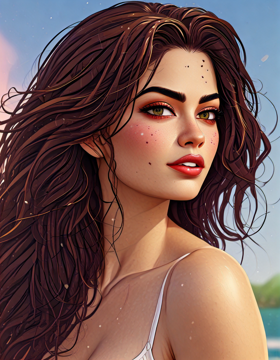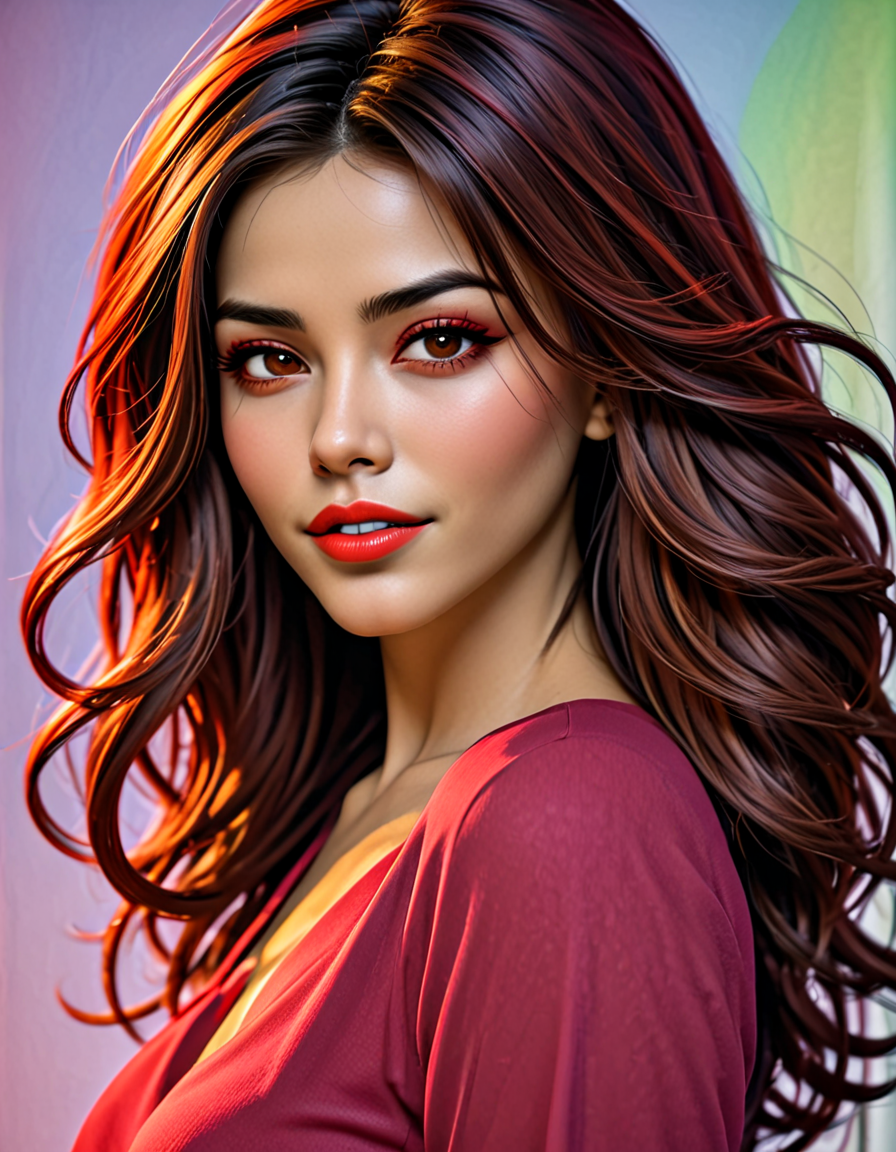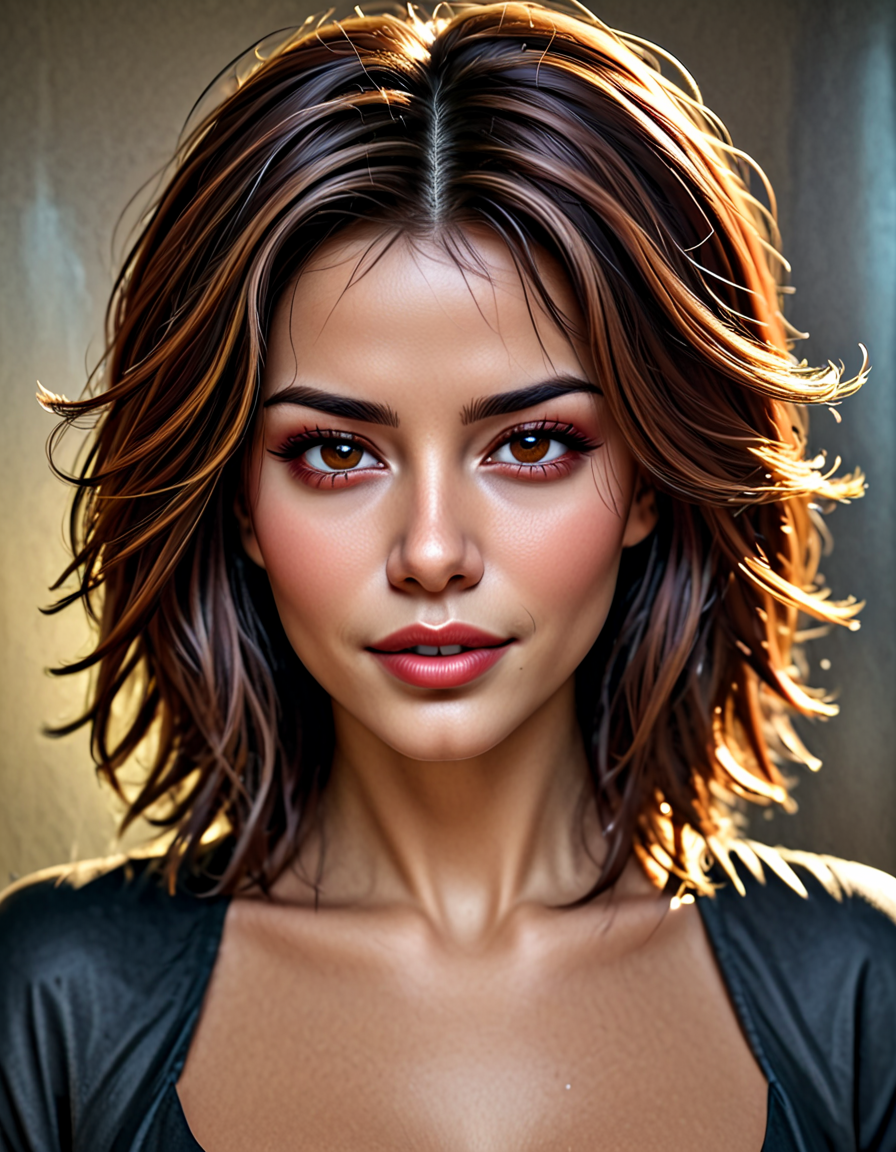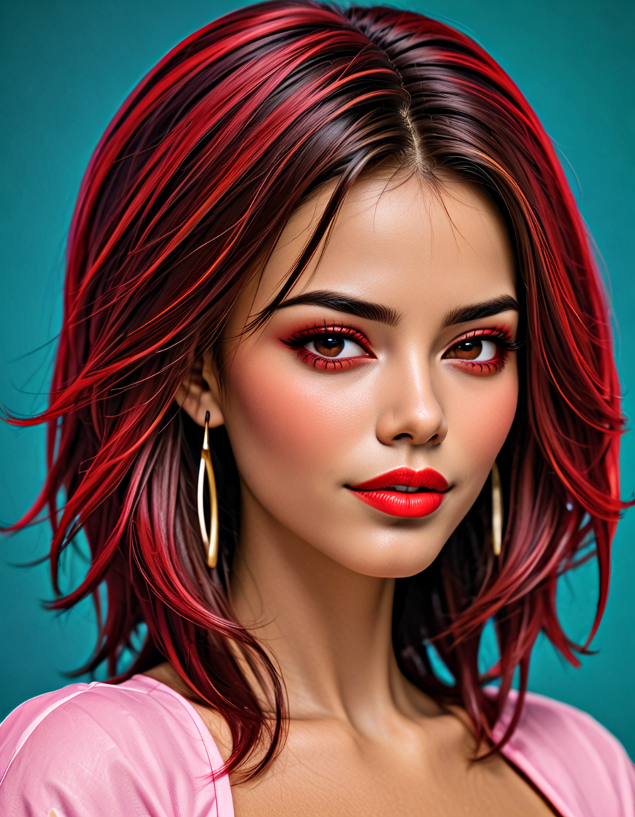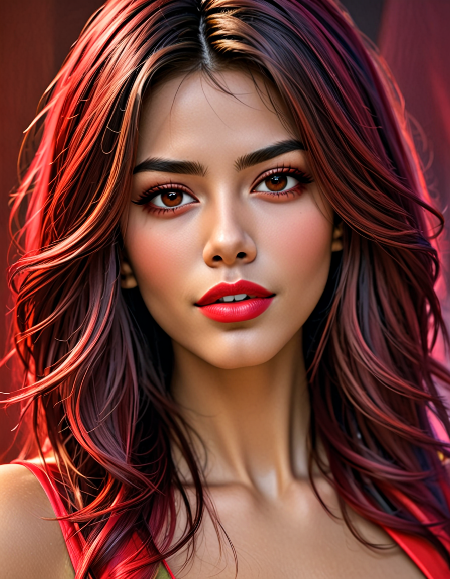 Sofia from Portugal, medium shoulder-length chocolate hair parted in the center with red streaks, brown eyes, curved nose, thick lips, dimples, perfect teeth, teasing look