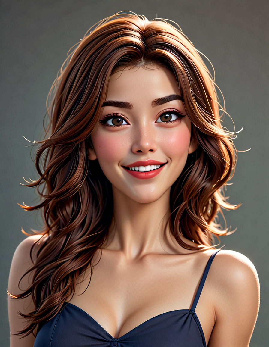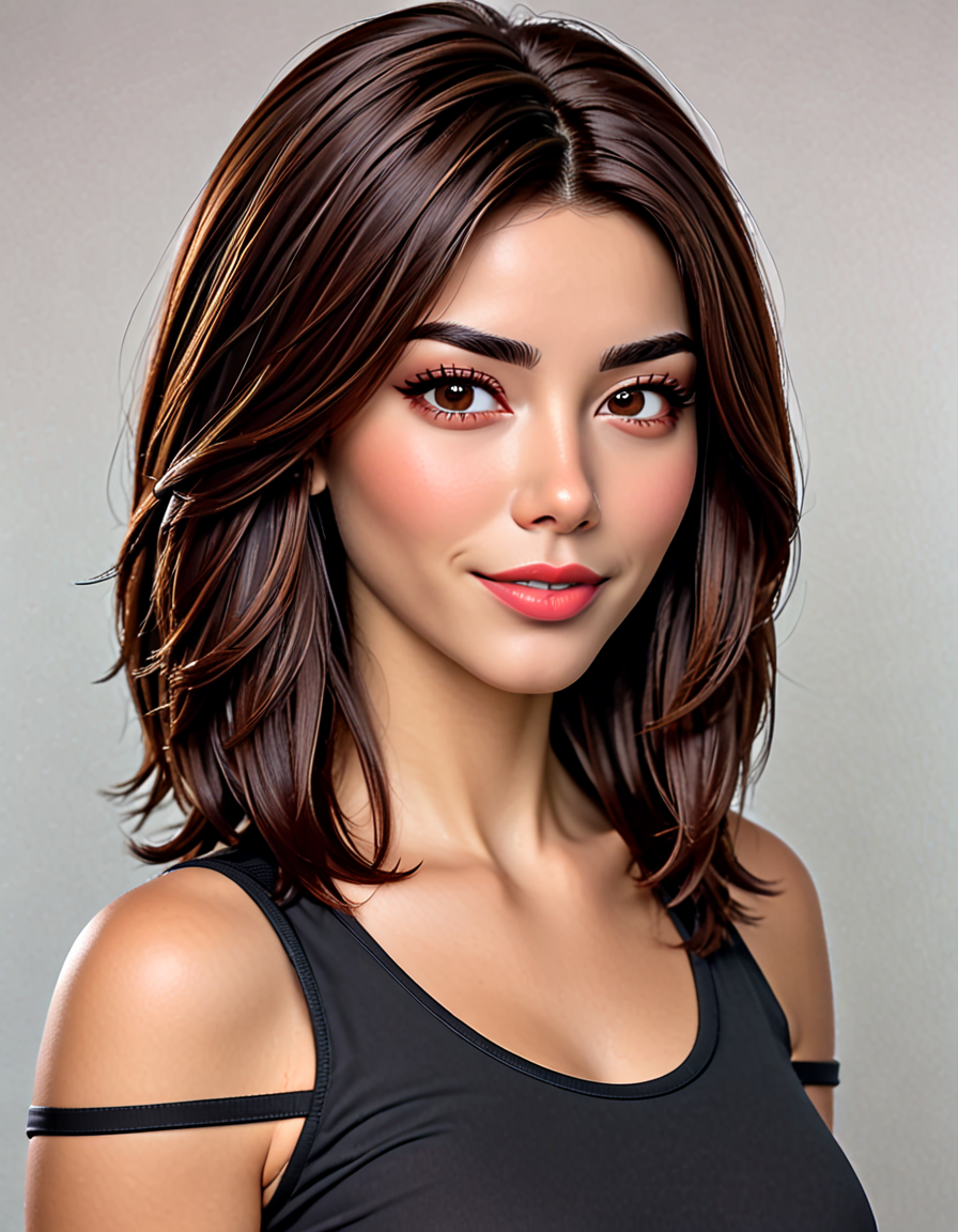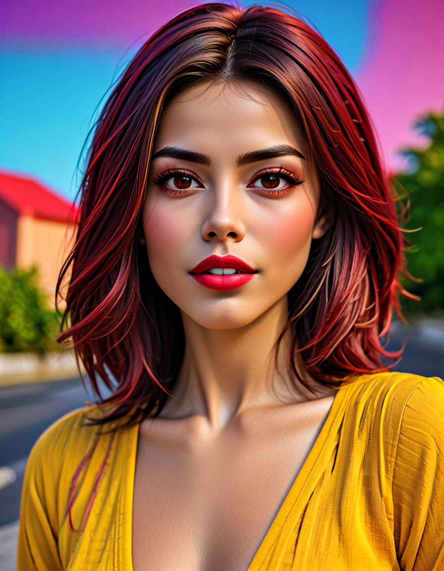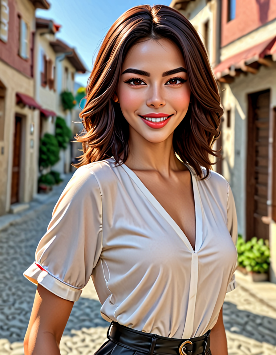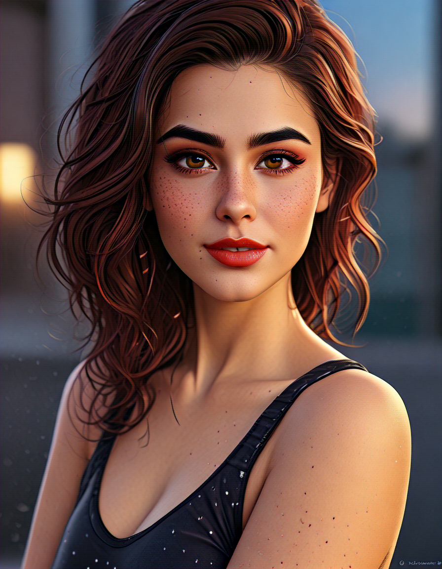Sofia from Portugal, medium shoulder-length chocolate hair parted in the center with red streaks, brown eyes, curved nose, thick lips, dimples, perfect teeth, teasing look