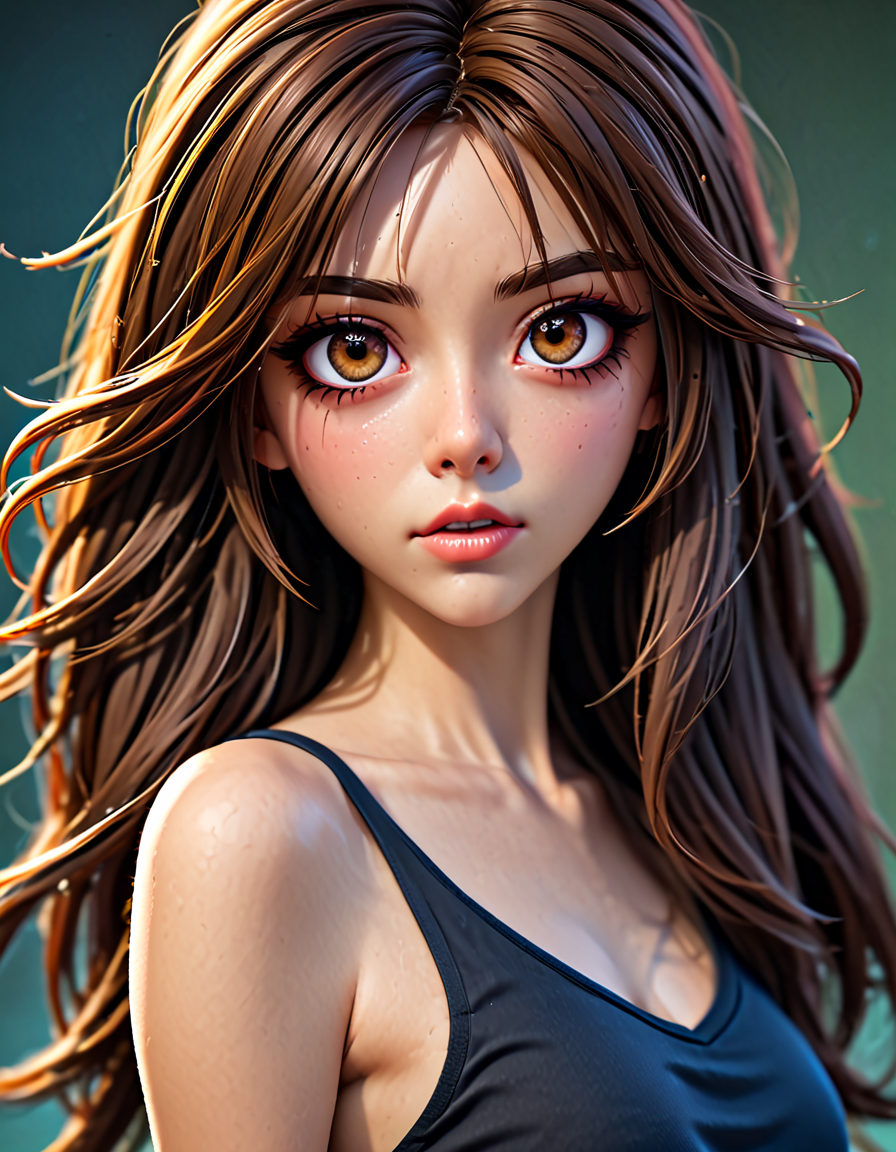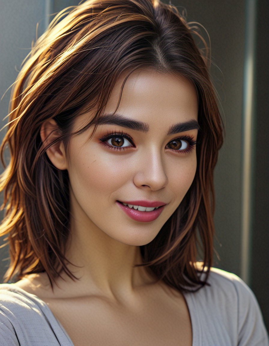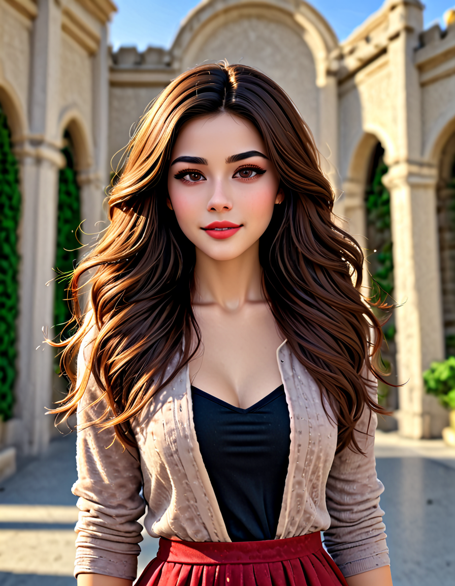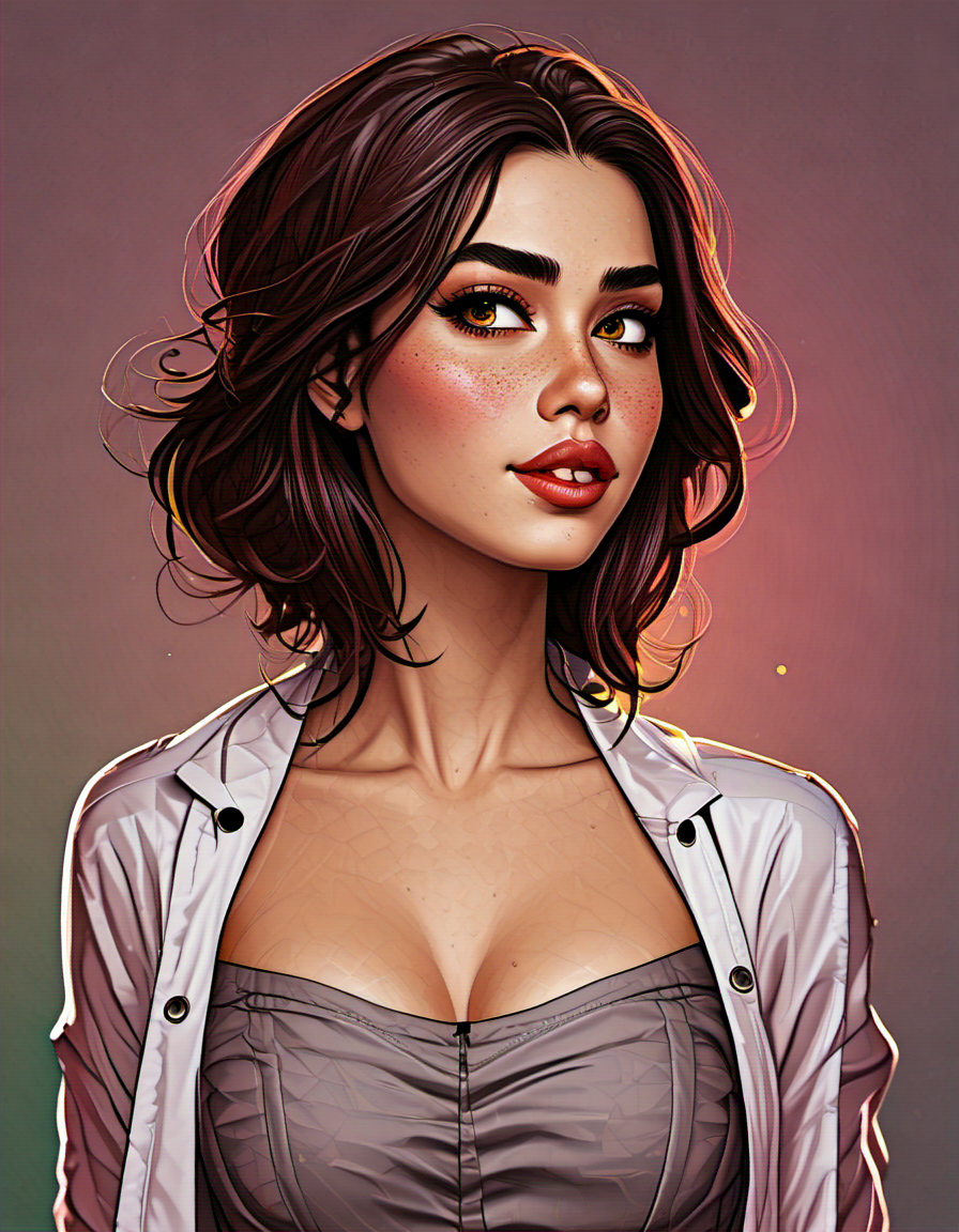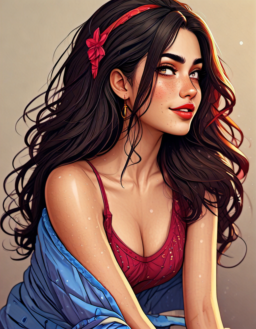 Sofia from Portugal, medium shoulder-length chocolate hair parted in the center with red streaks, brown eyes, curved nose, thick lips, dimples, perfect teeth, teasing look