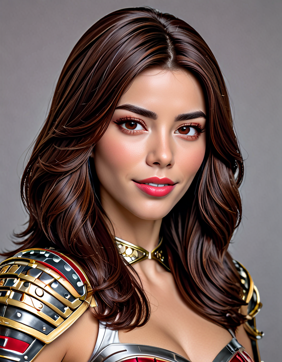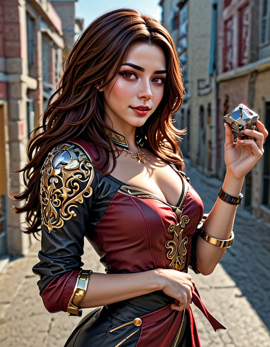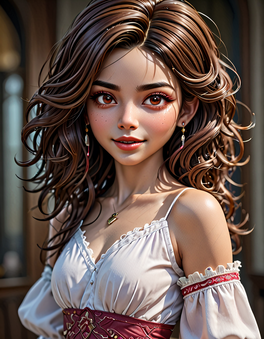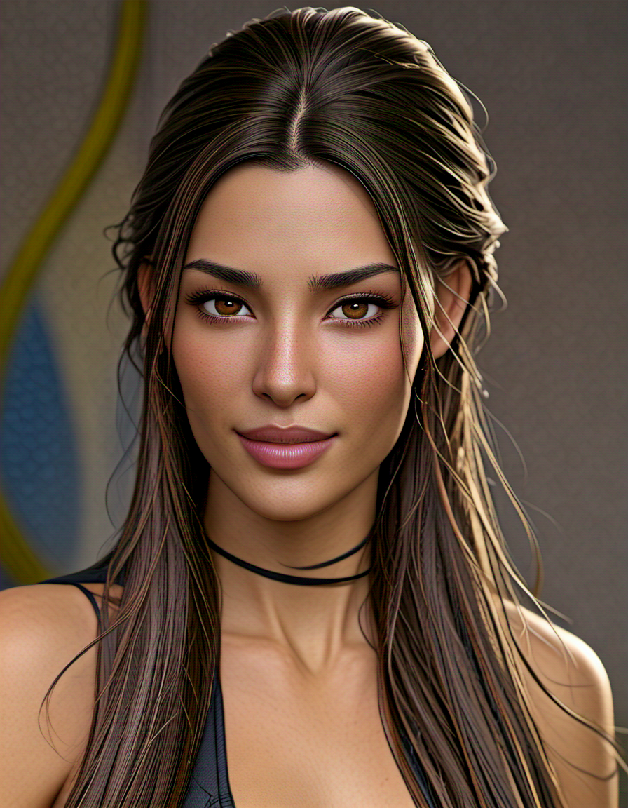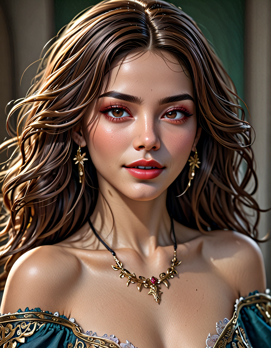 Sofia from Portugal, medium shoulder-length chocolate hair parted in the center with red streaks, brown eyes, curved nose, thick lips, dimples, perfect teeth, teasing look