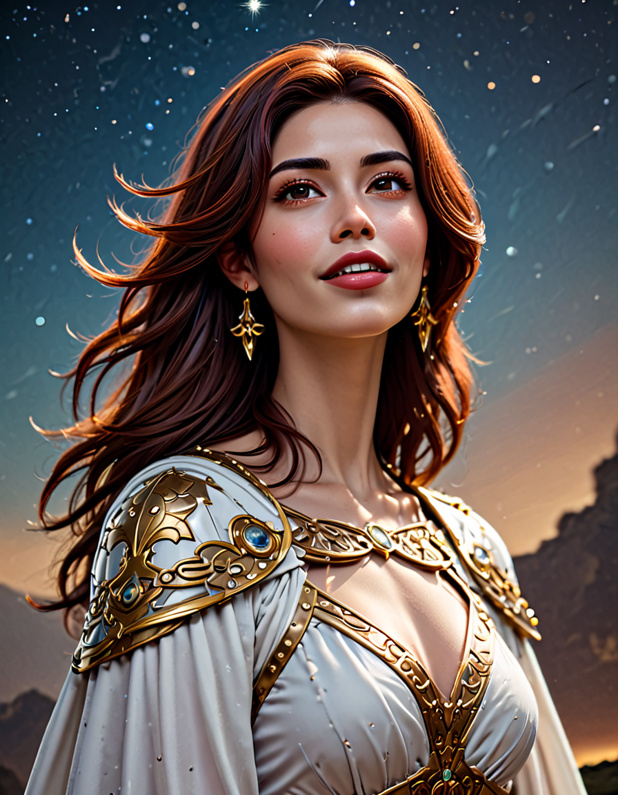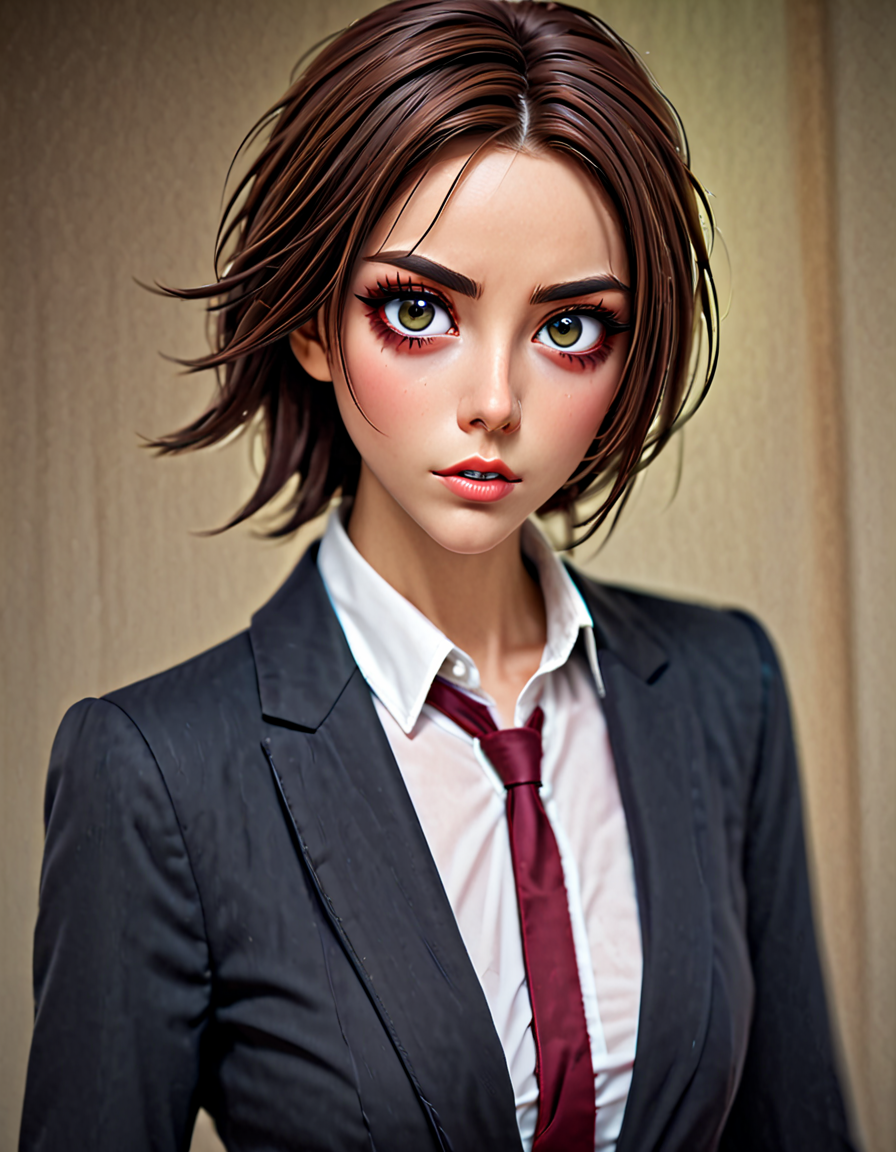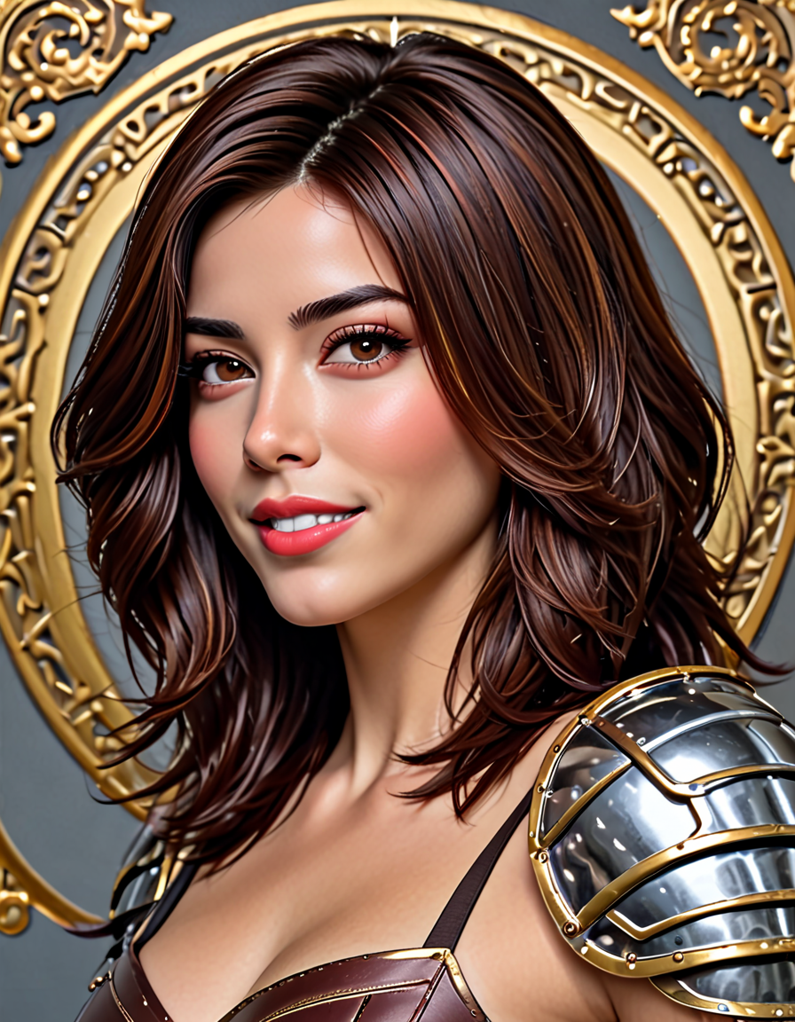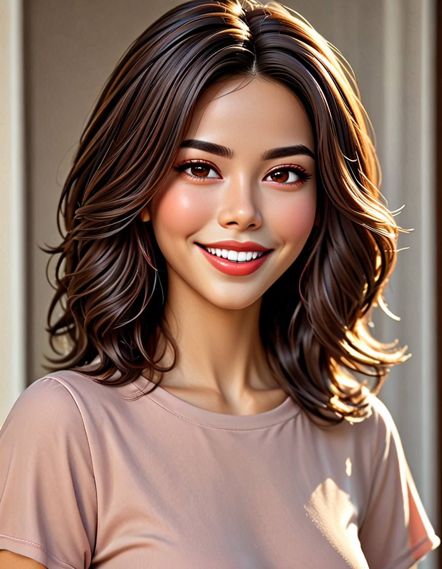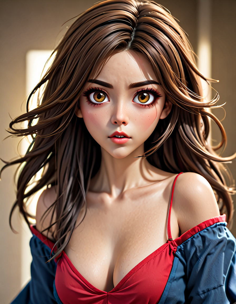 Sofia from Portugal, medium shoulder-length chocolate hair parted in the center with red streaks, brown eyes, curved nose, thick lips, dimples, perfect teeth, teasing look