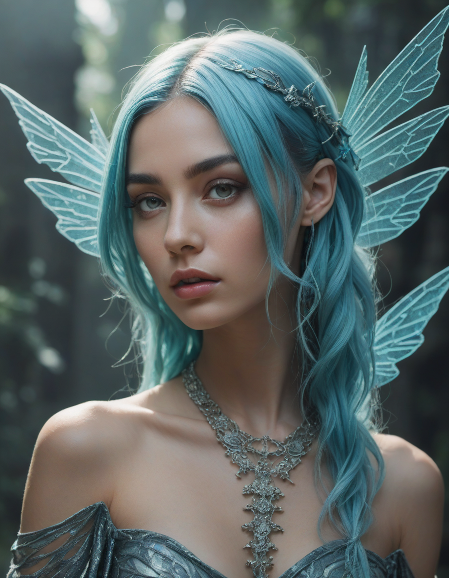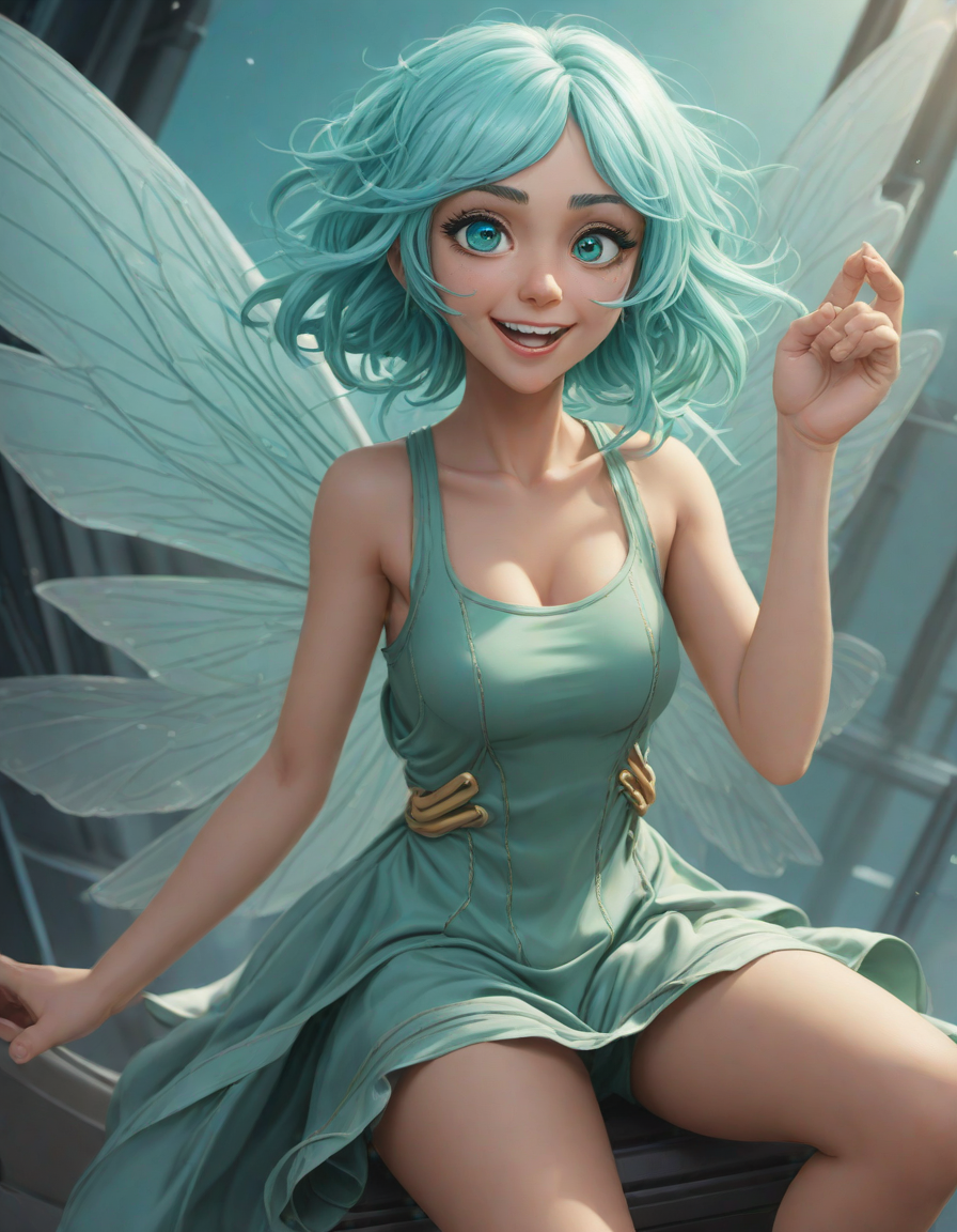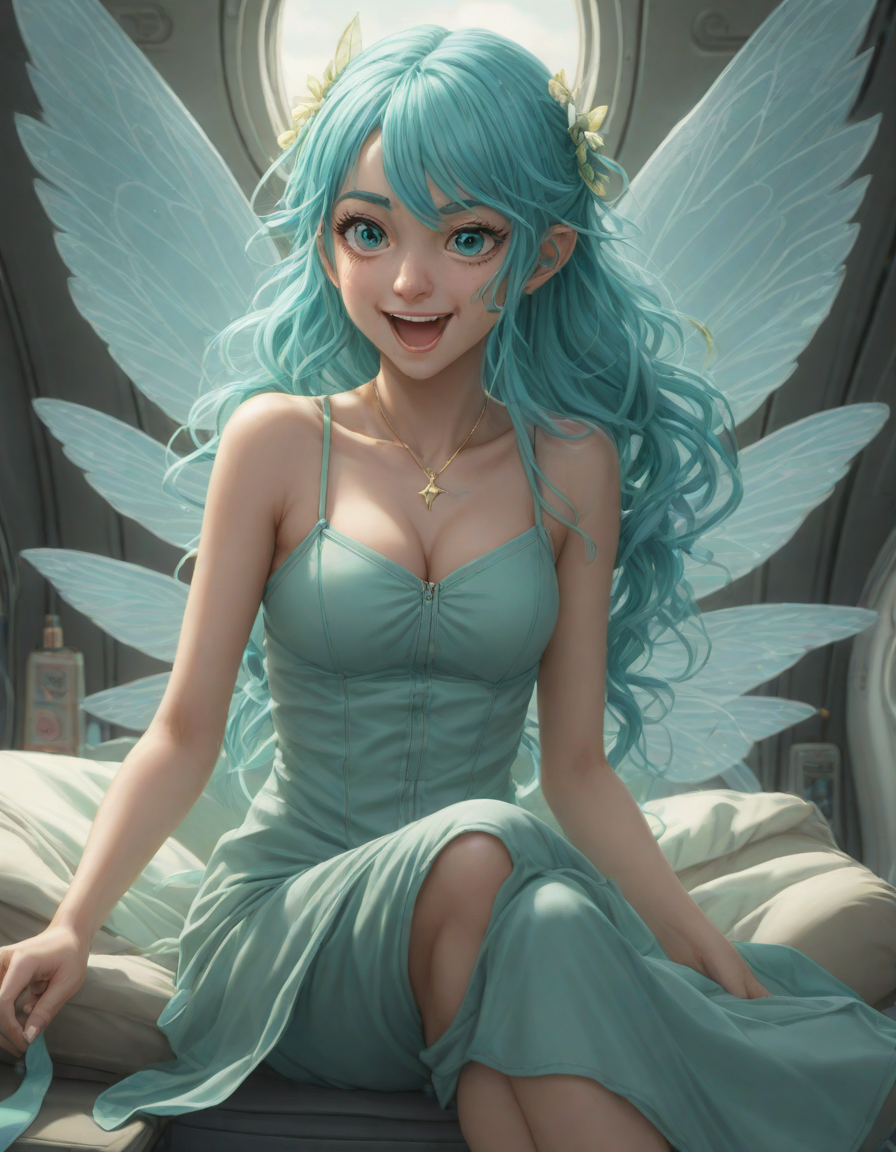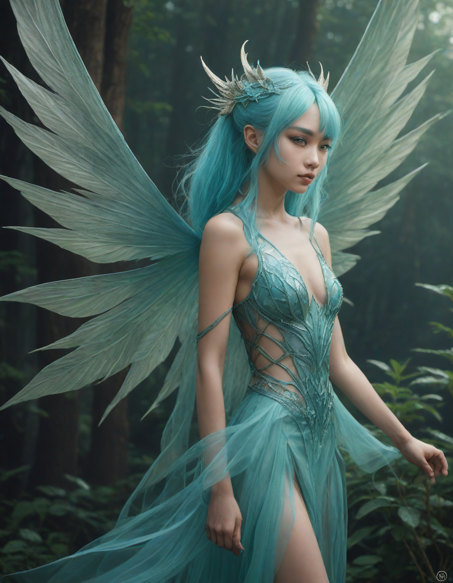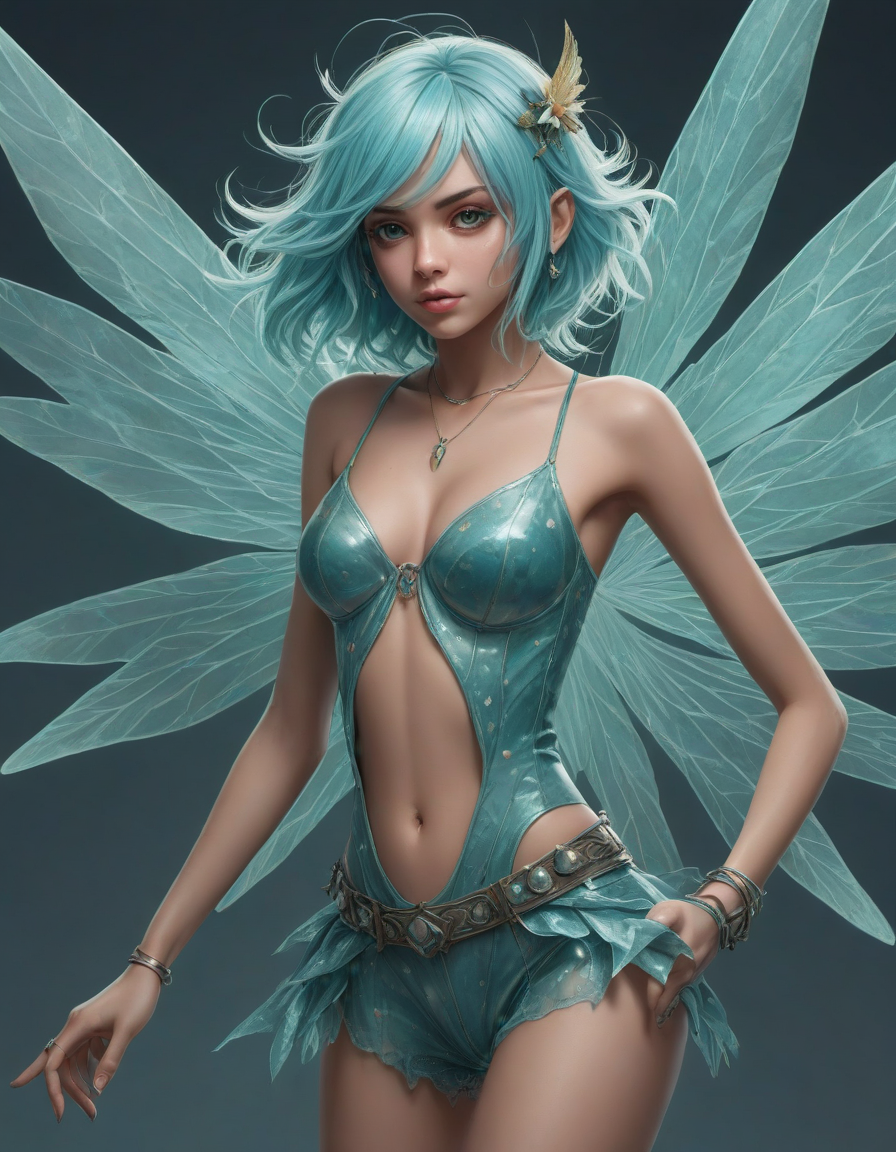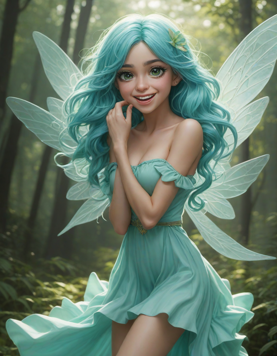 a radiant, aquamarine-haired fairy flitting about on delicate, translucent wings
