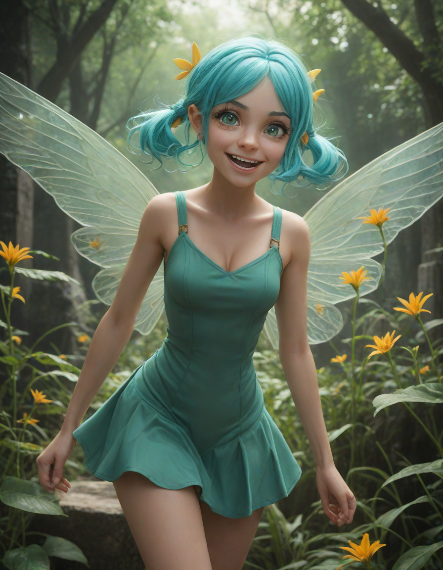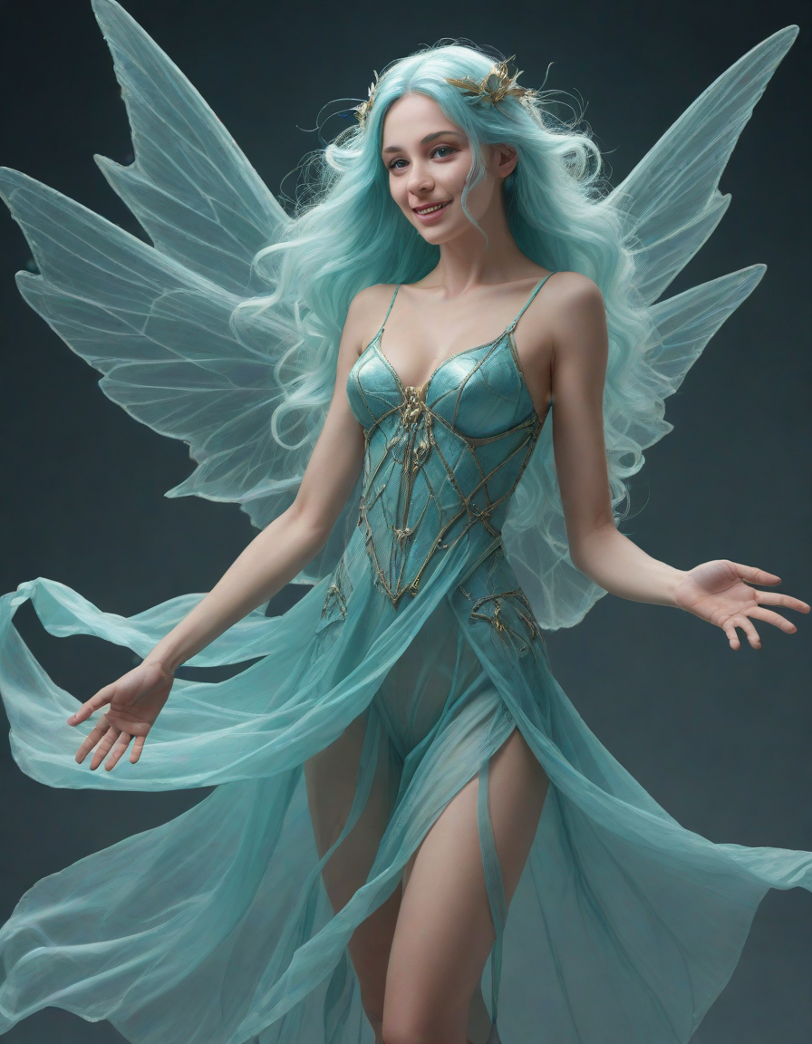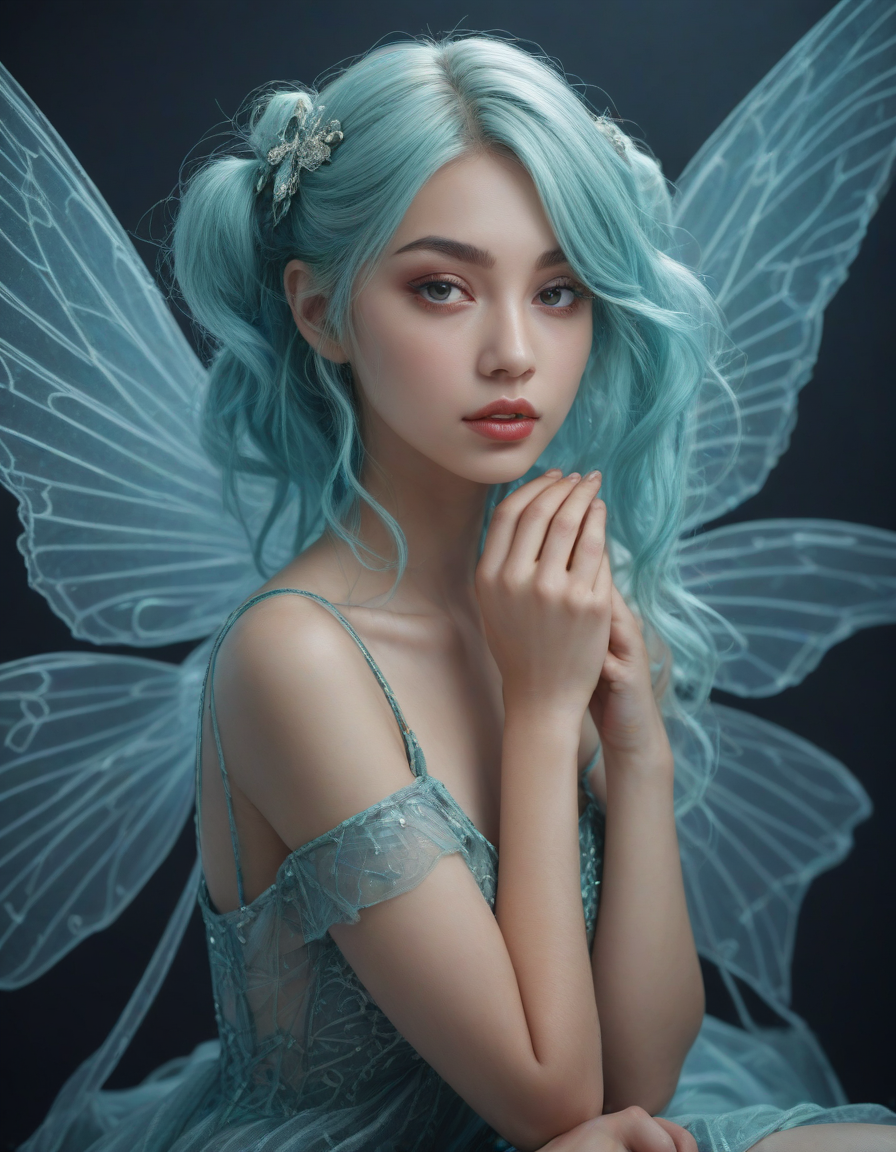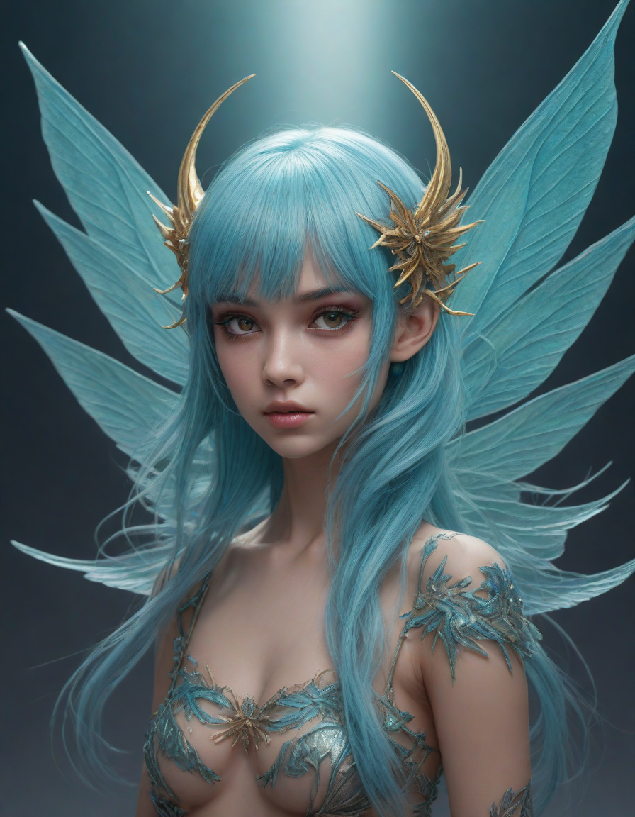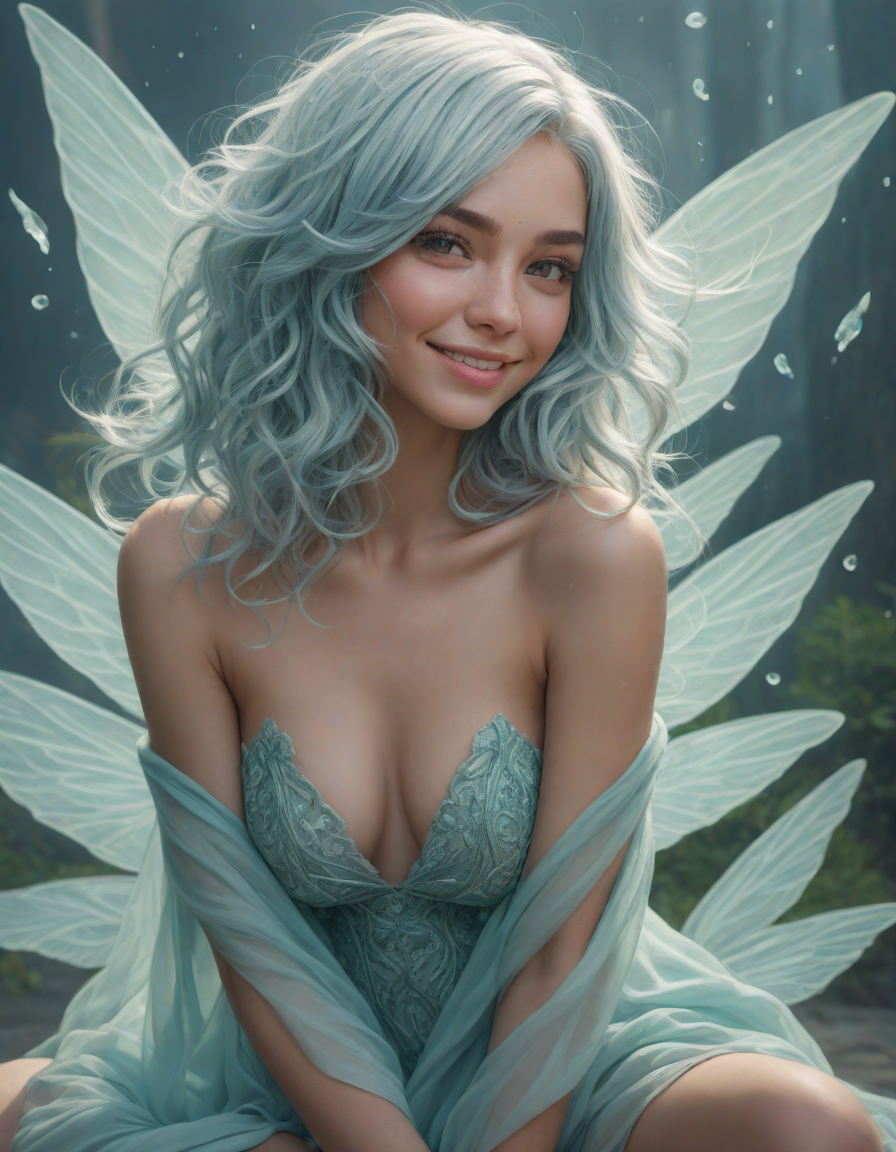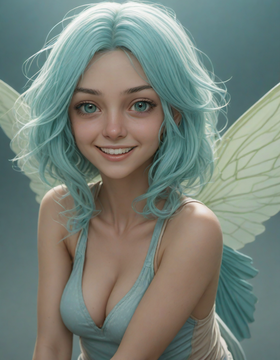 a radiant, aquamarine-haired fairy flitting about on delicate, translucent wings