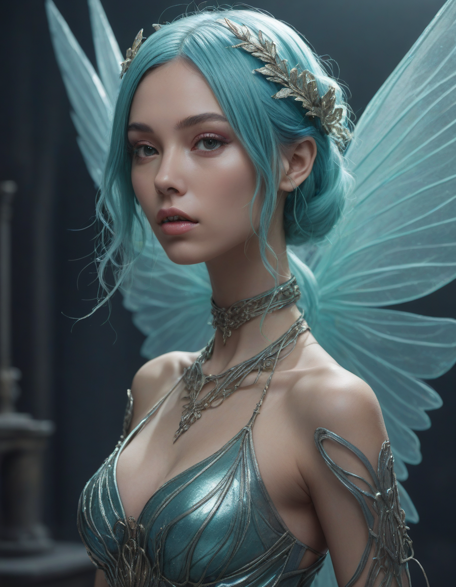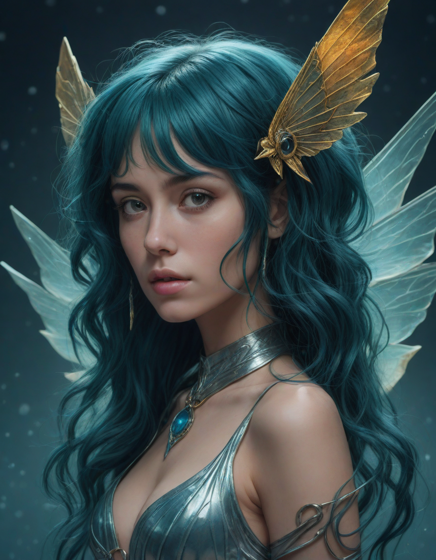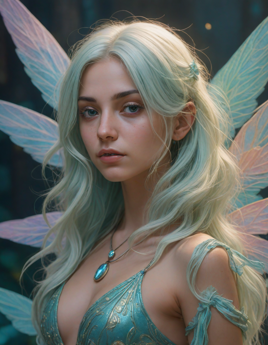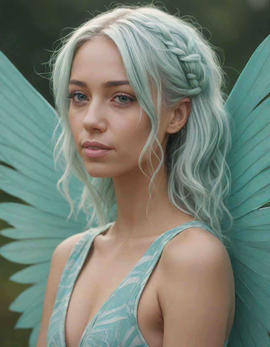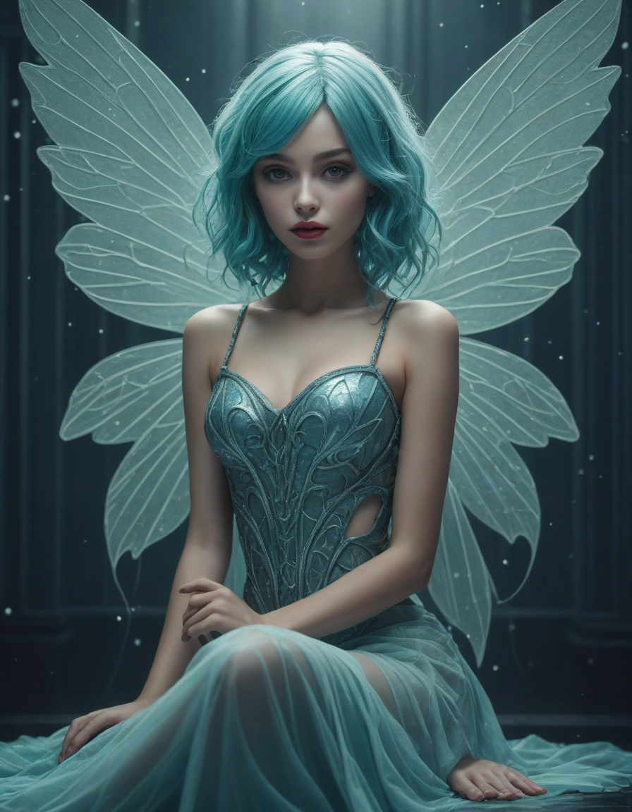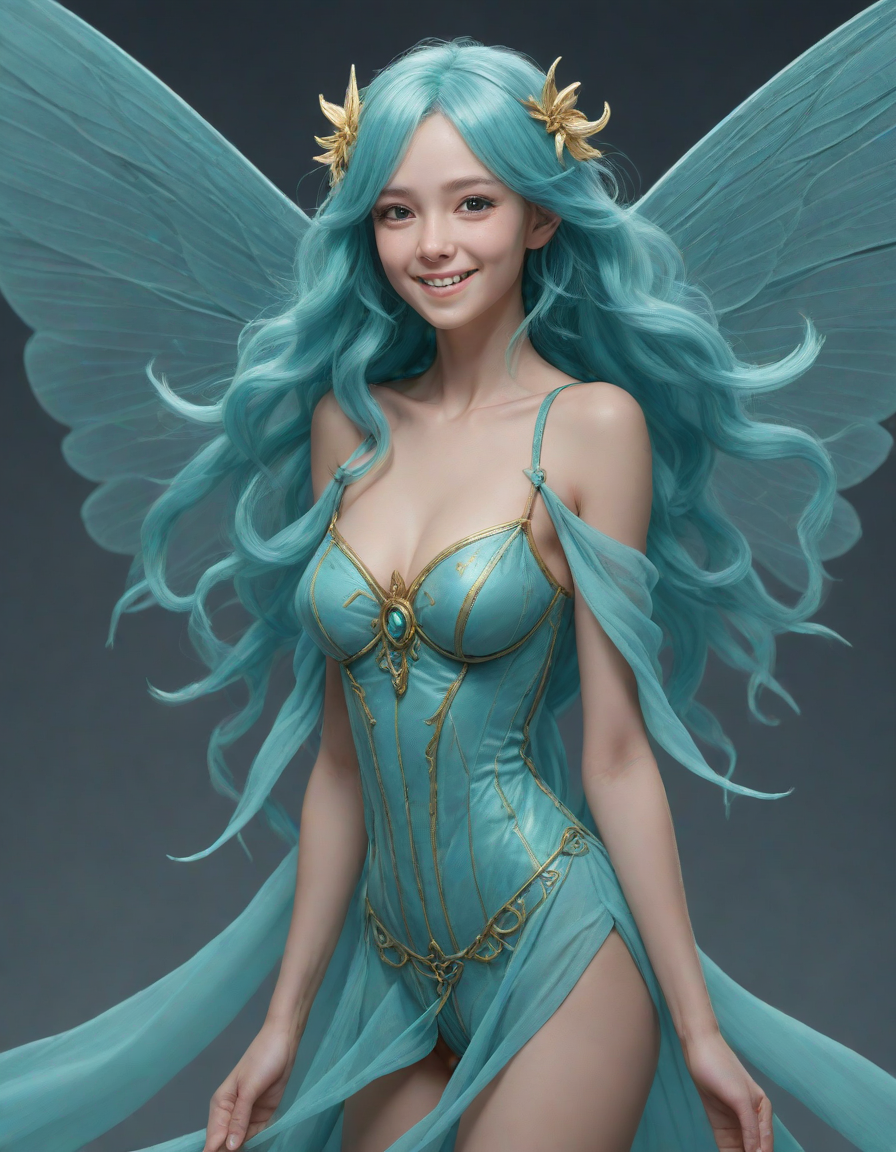 a radiant, aquamarine-haired fairy flitting about on delicate, translucent wings
